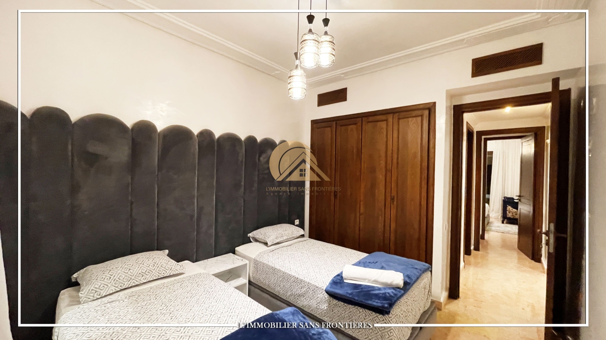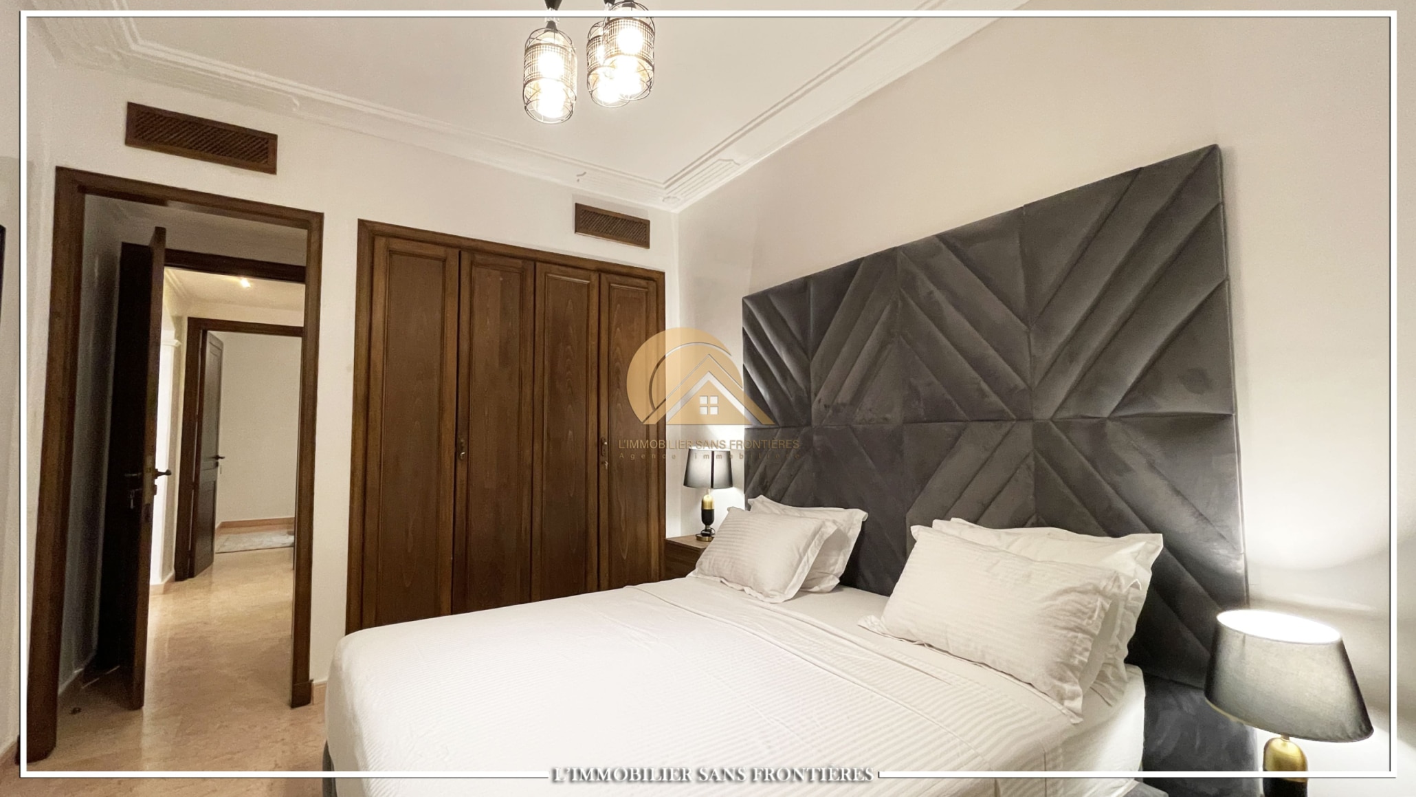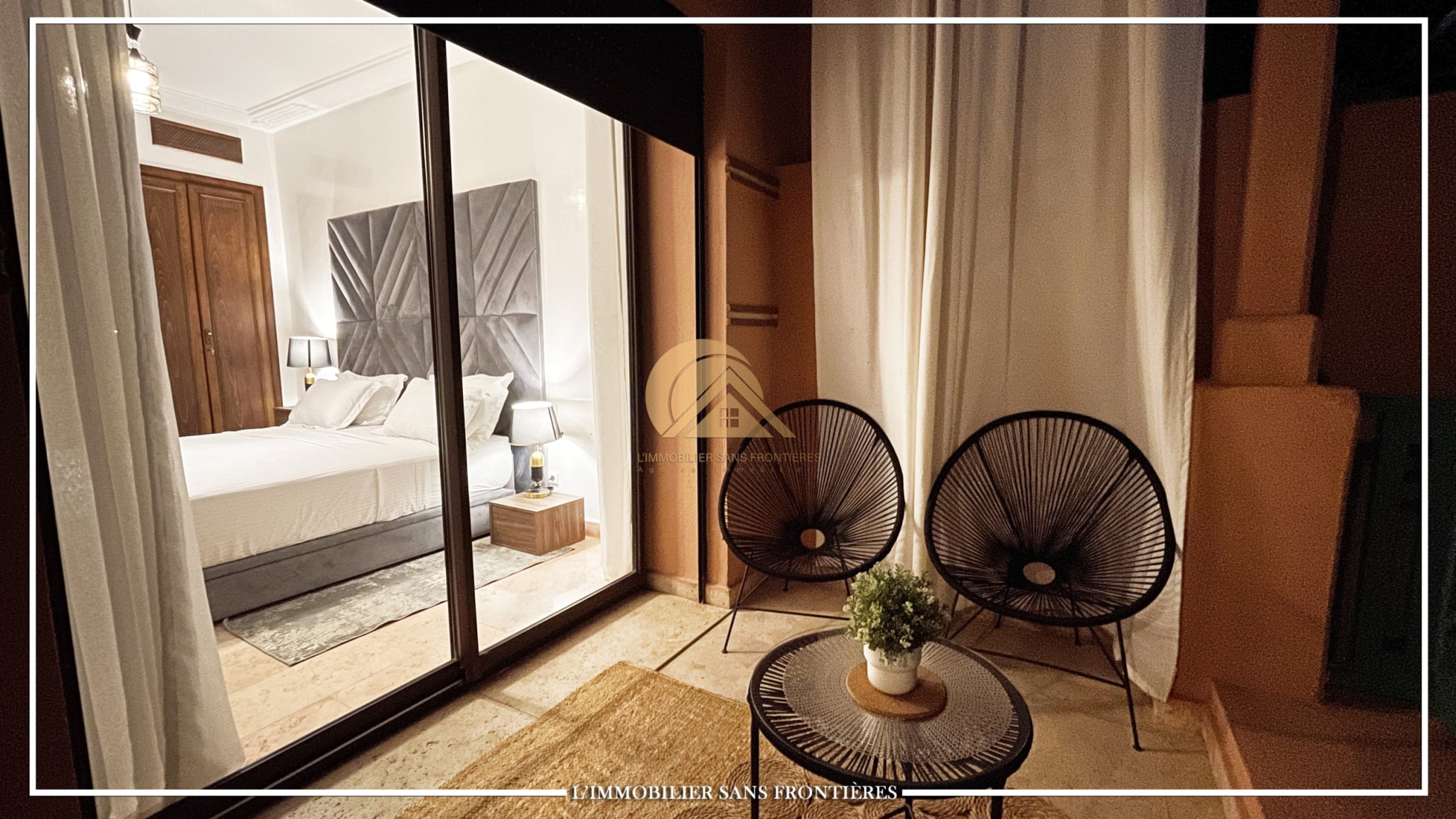 Real Estate Without Borders offers this furnished 115 sqm apartment for rent in Agdal, Marrakech, on the ground floor of a gated residence. It includes access to a shared pool, shared garden, and shared gym.