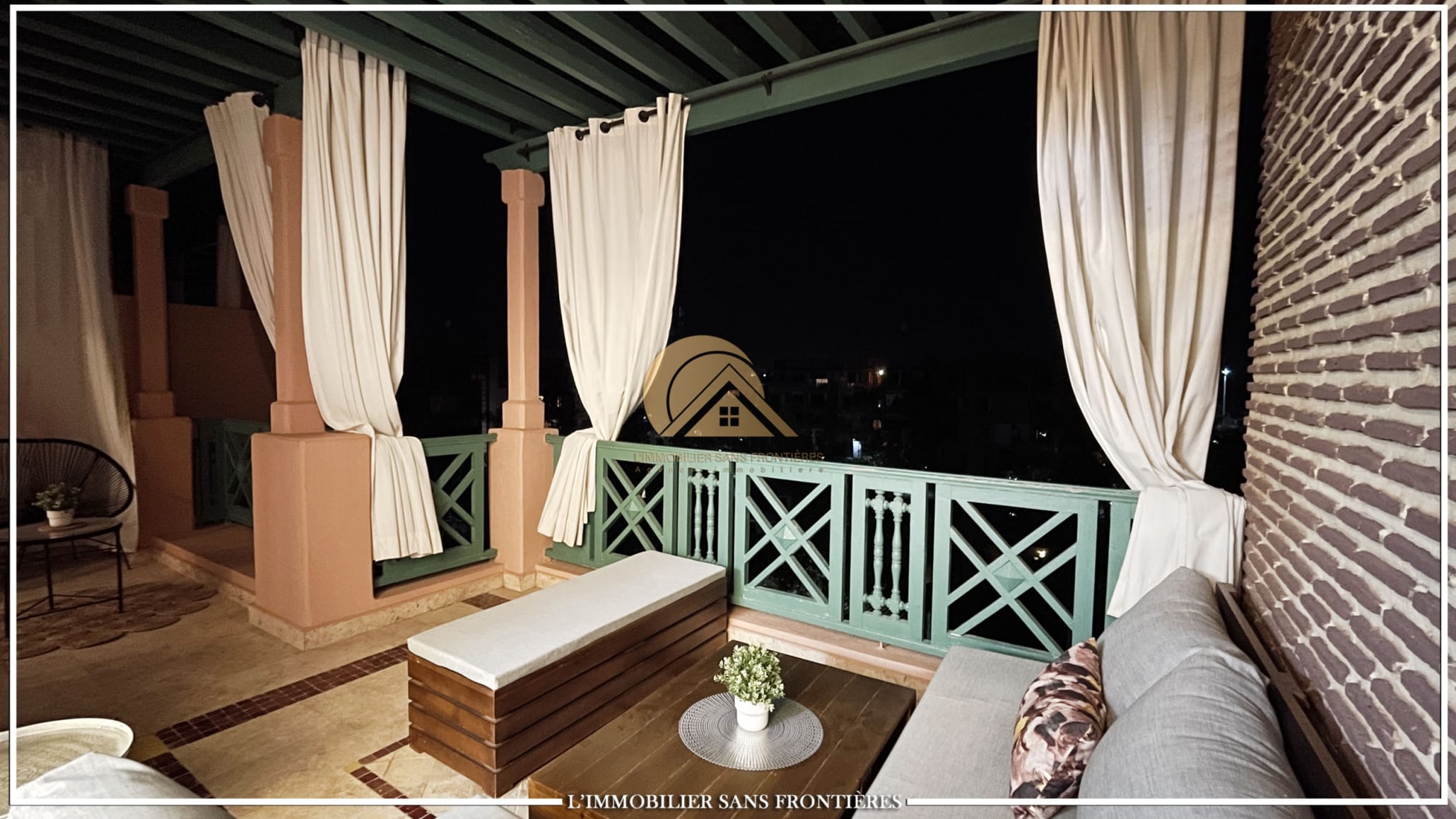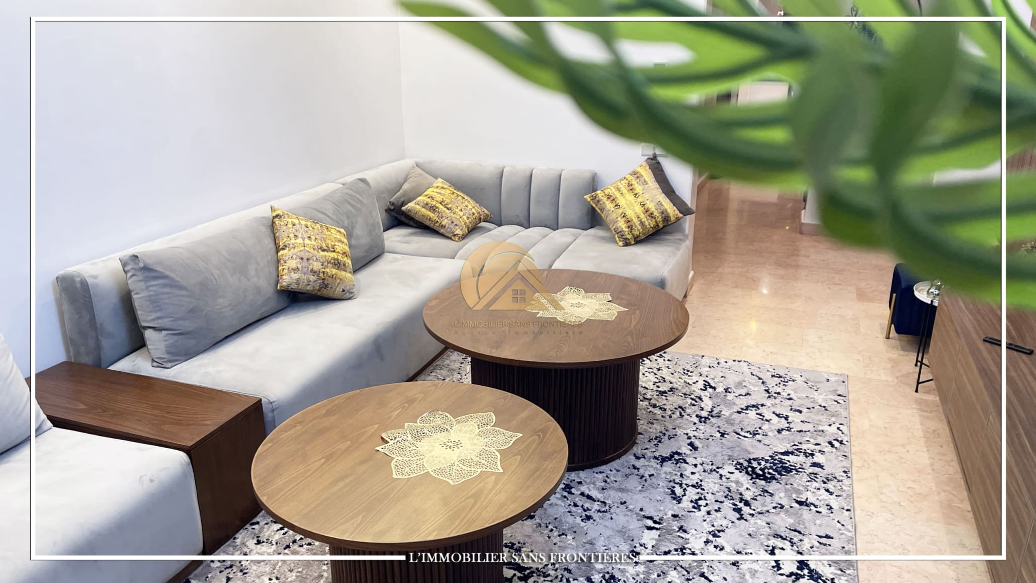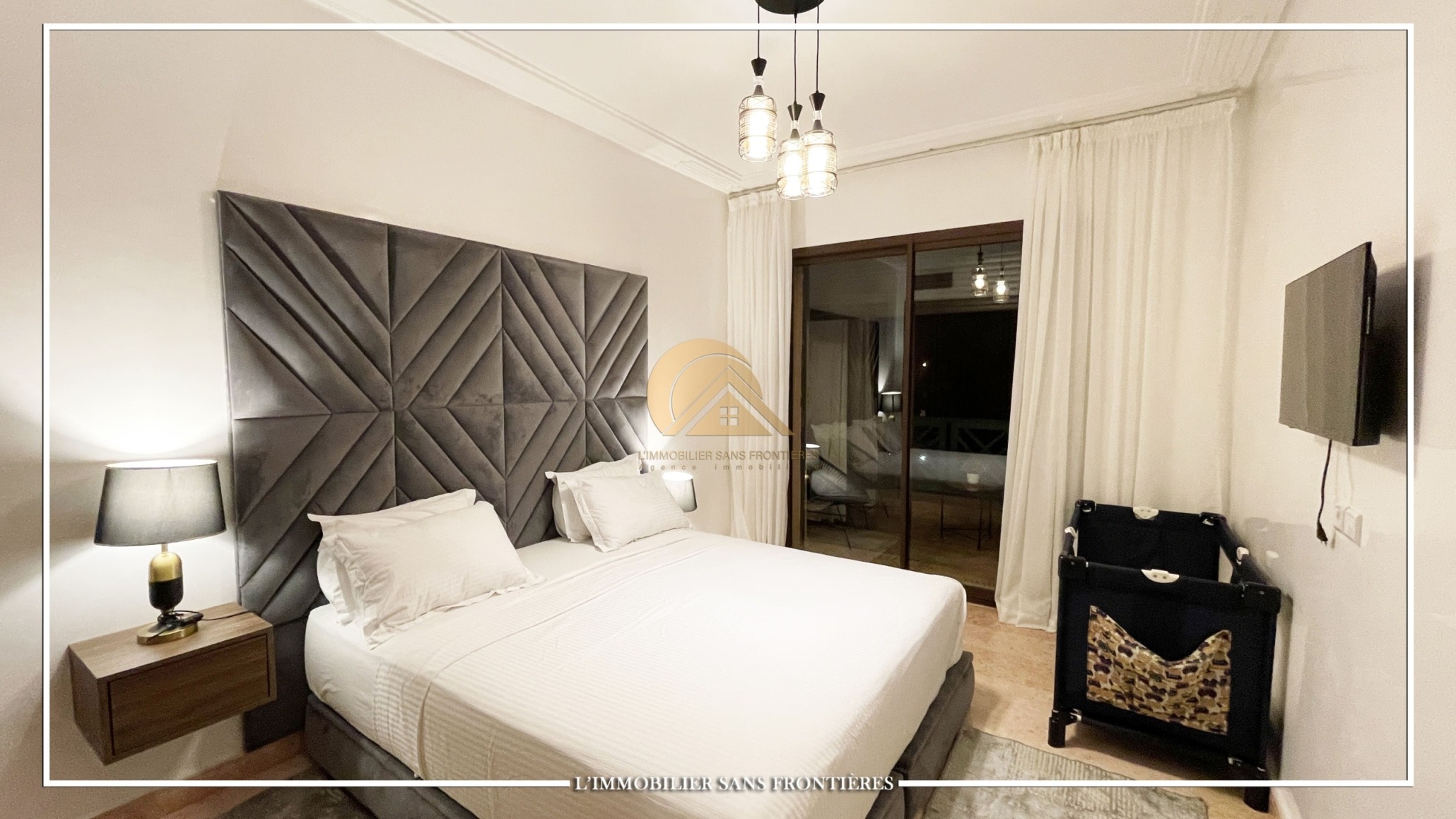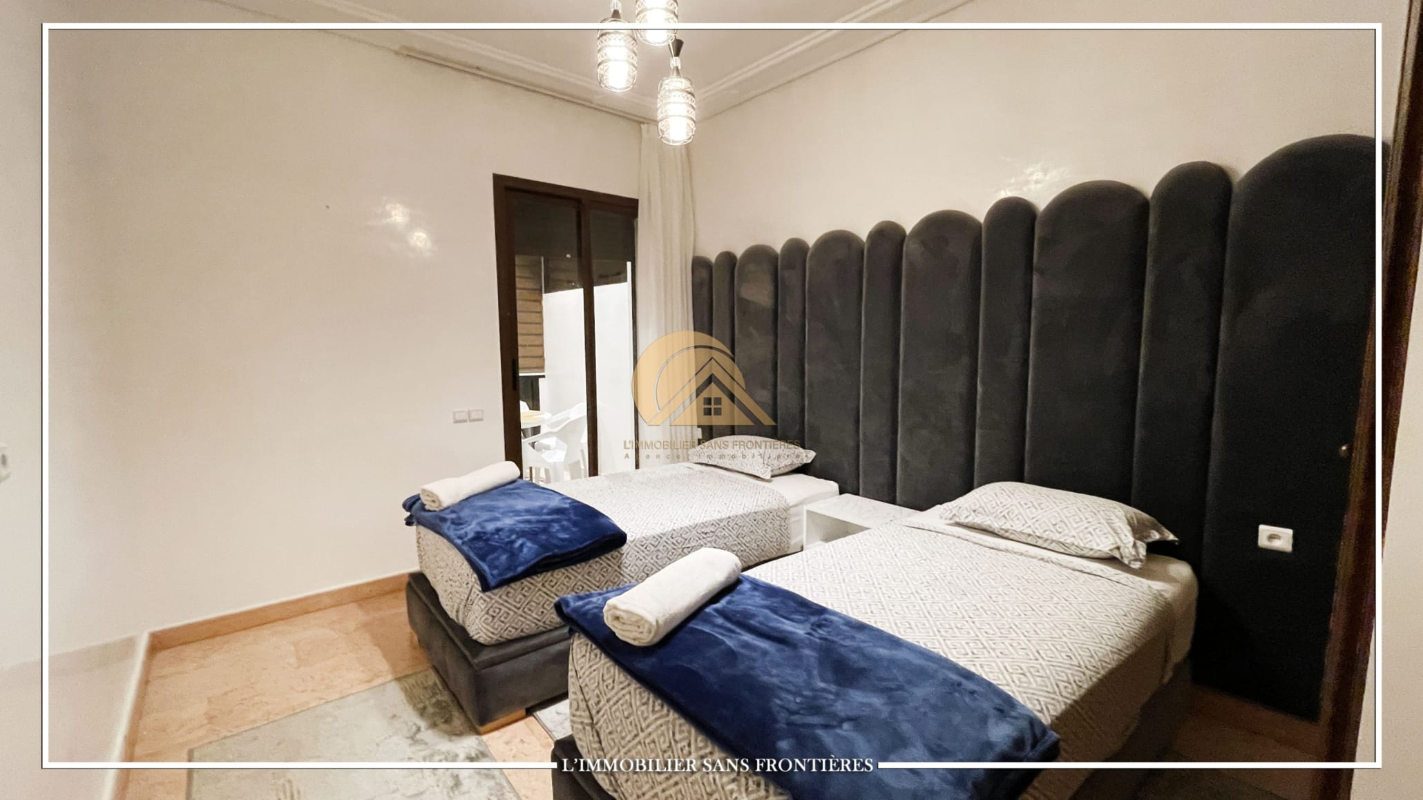 Real Estate Without Borders offers this furnished 115 sqm apartment for rent in Agdal, Marrakech, on the ground floor of a gated residence. It includes access to a shared pool, shared garden, and shared gym.