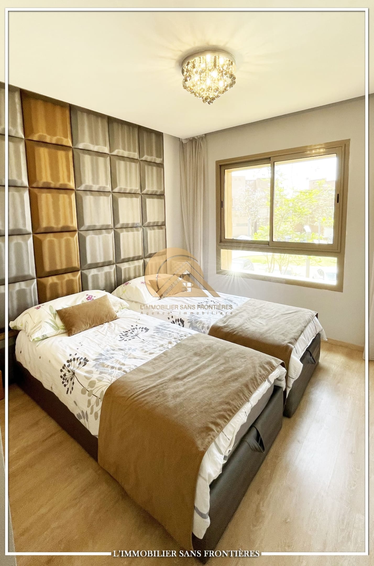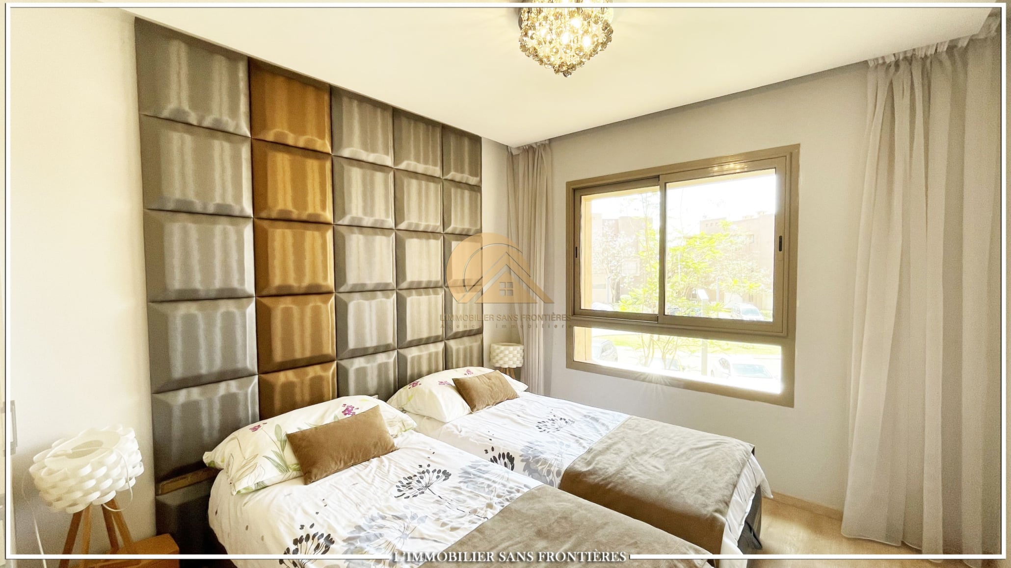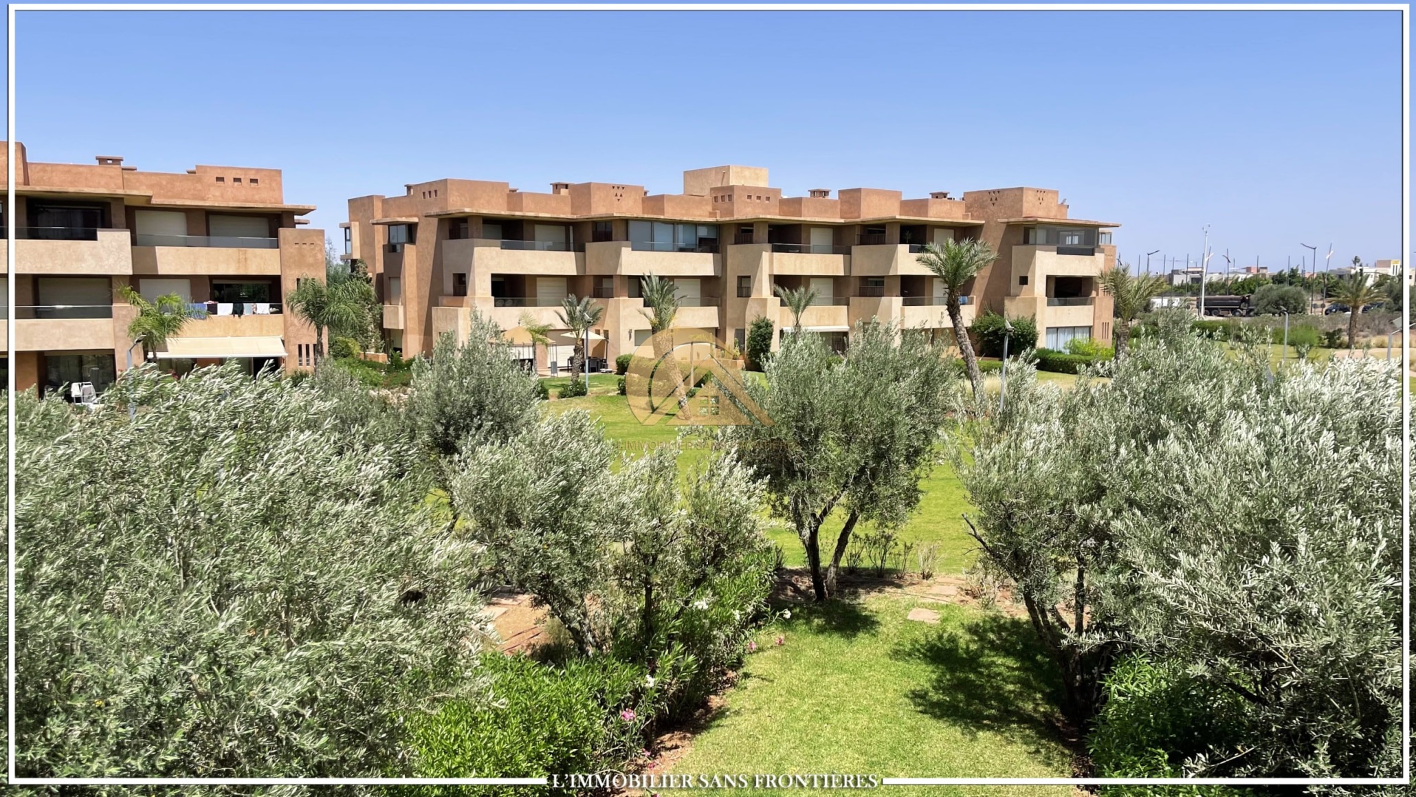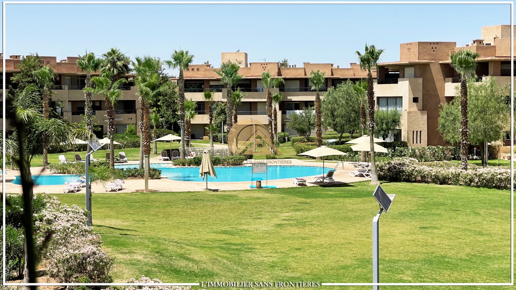 Real Estate Without Borders offers this furnished apartment for rent in Prestigia, Marrakech. It is described as modern, with a panoramic view over the golf course. The residence includes a pool and a garden.