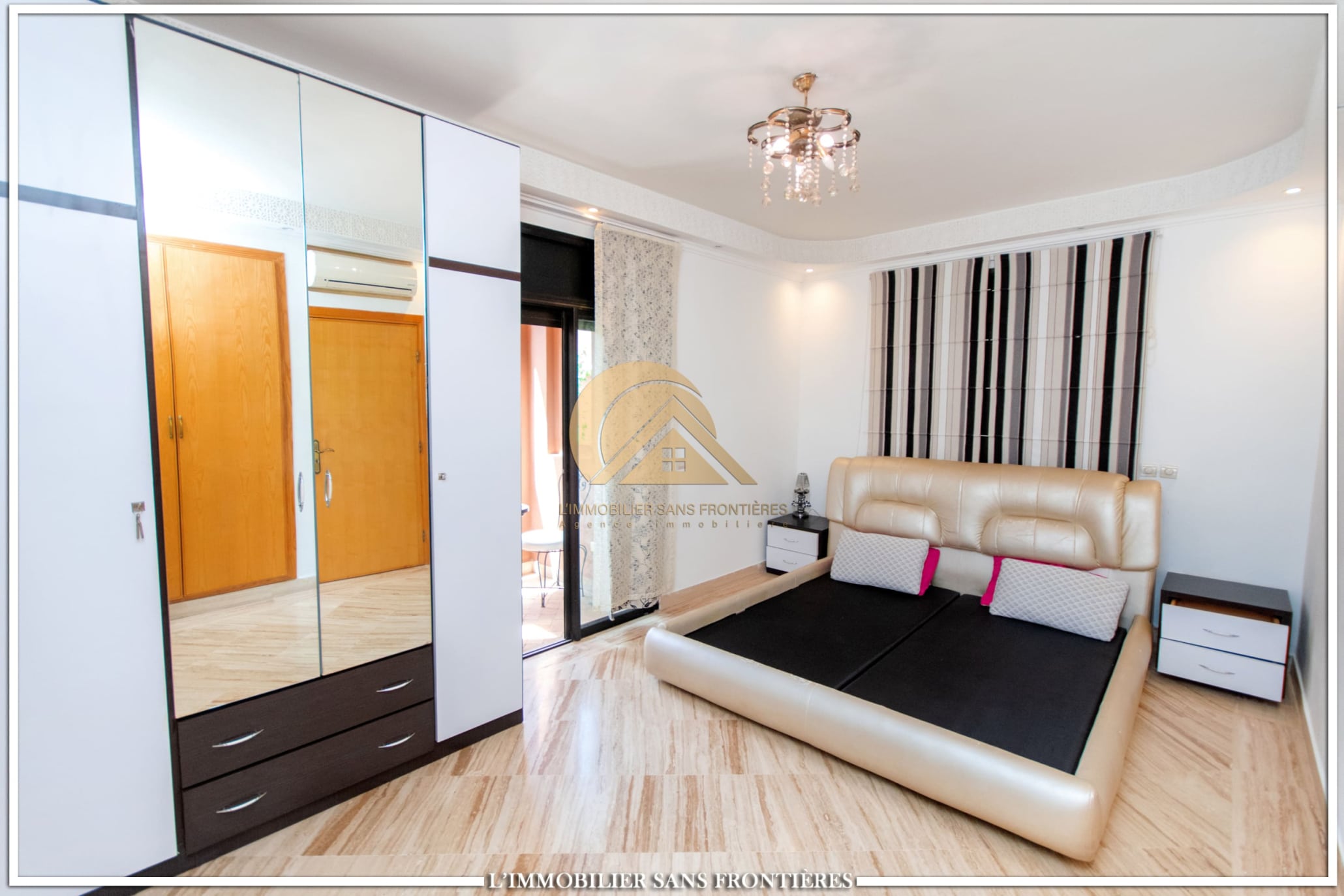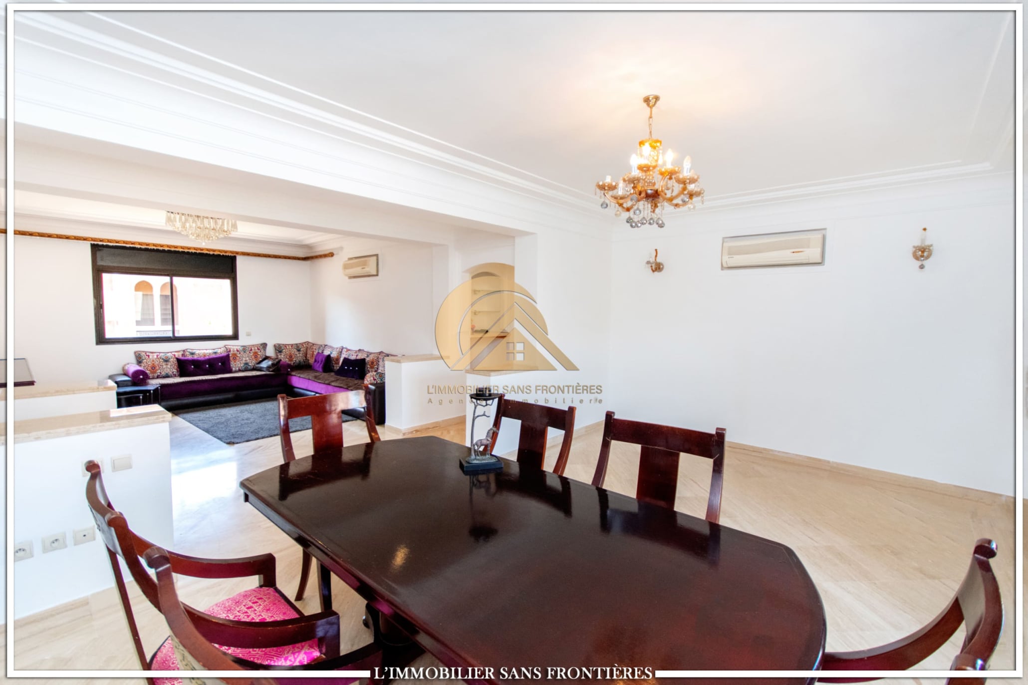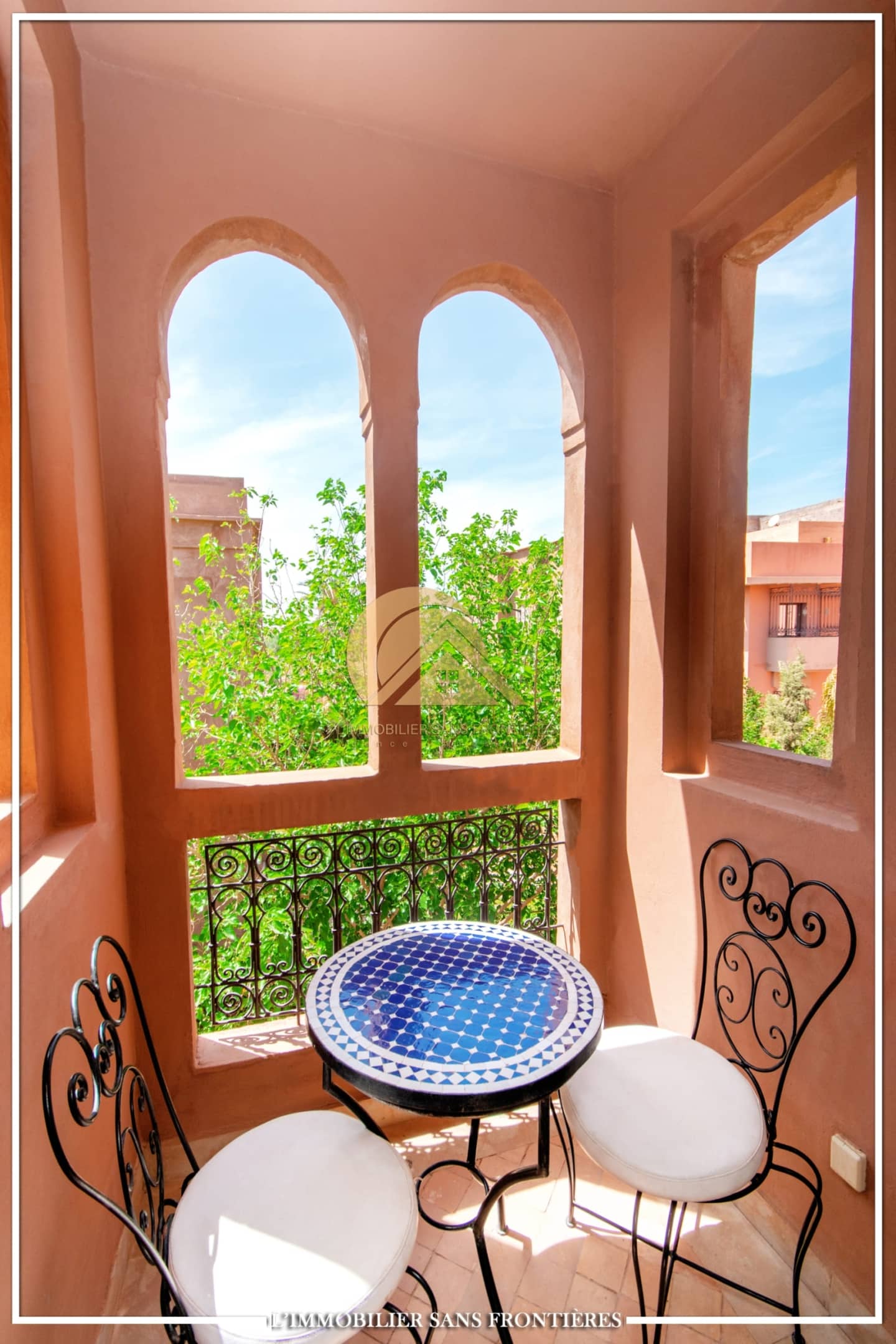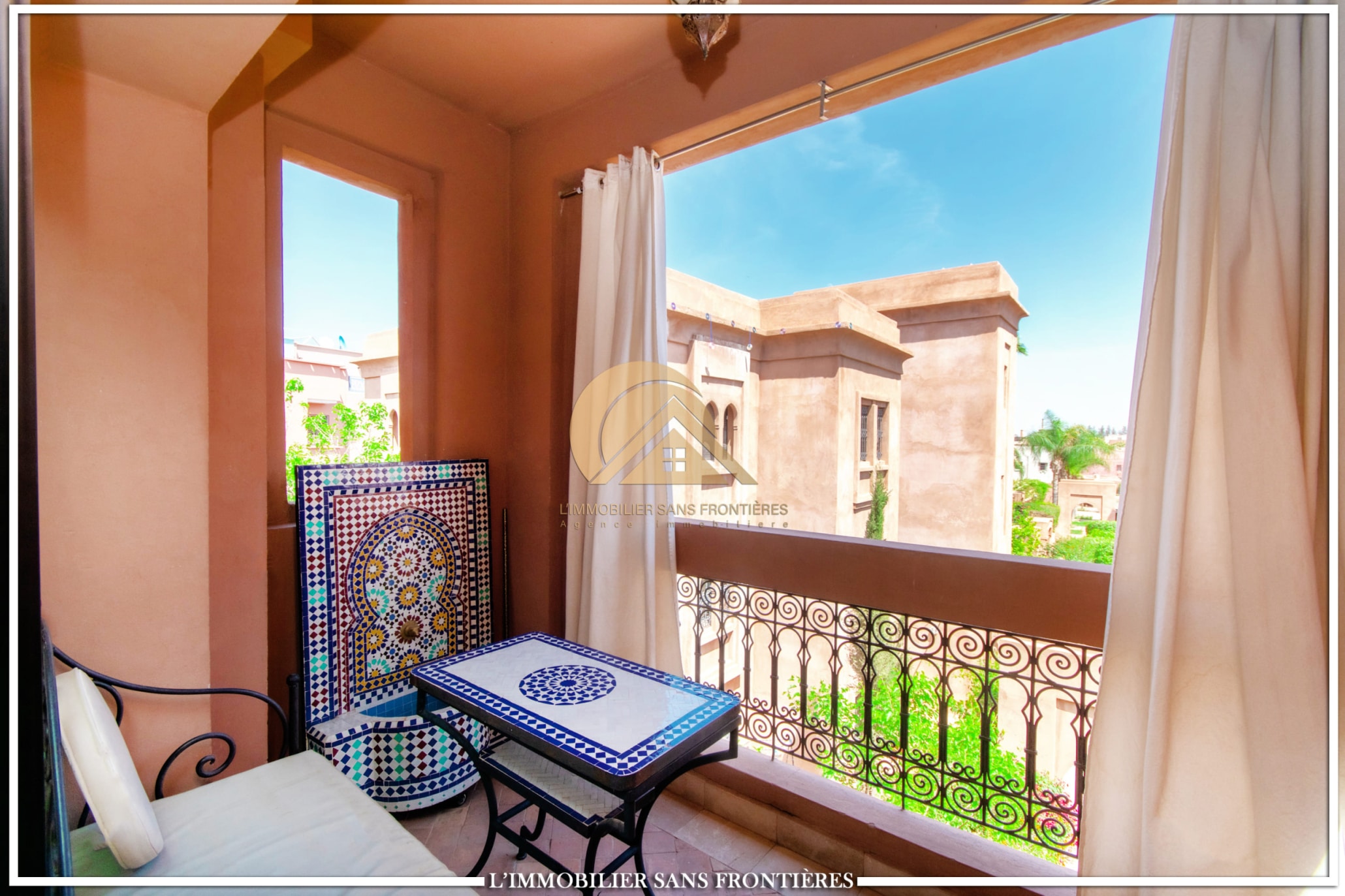 Moroccan lounge – European lounge – 2 bedrooms with closets and air conditioning, including 1 with balcony – Equipped kitchen – Laundry room – Guest toilet – Bathroom – Terrace