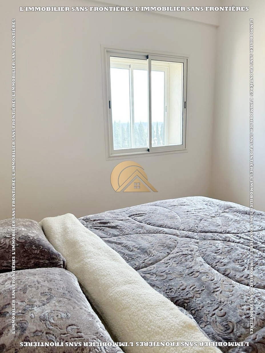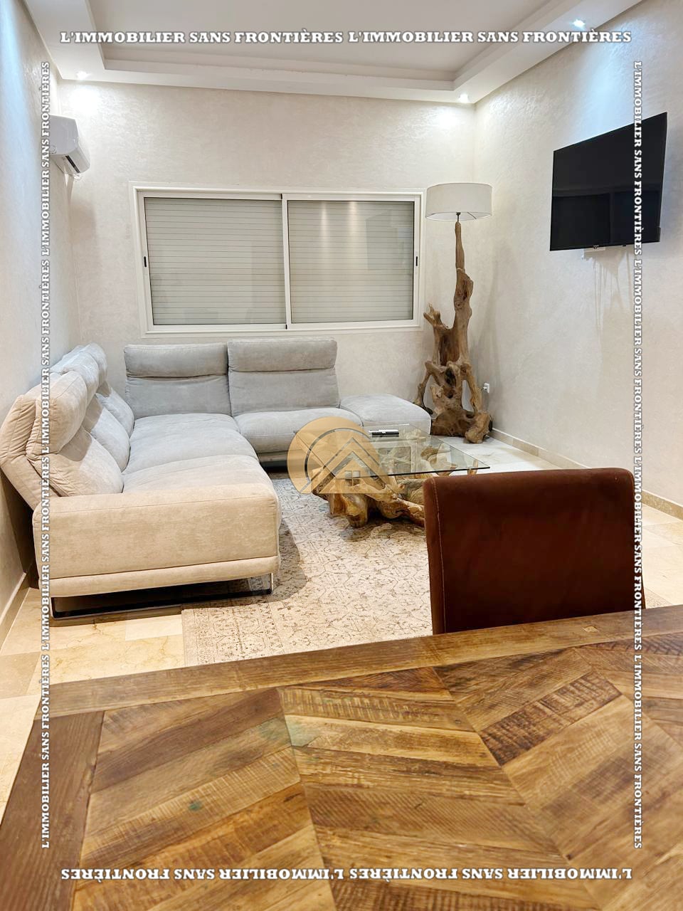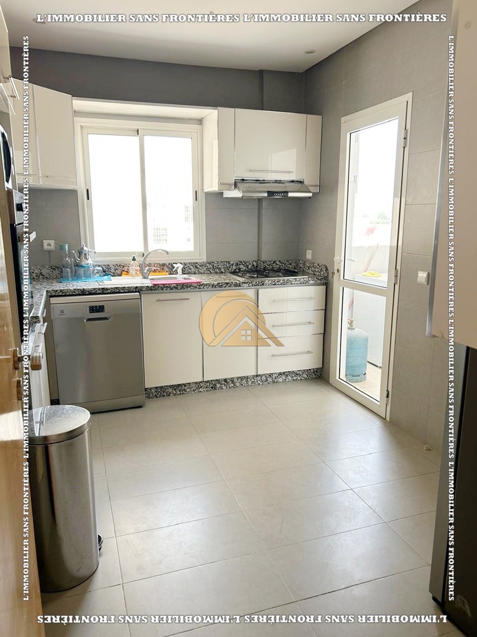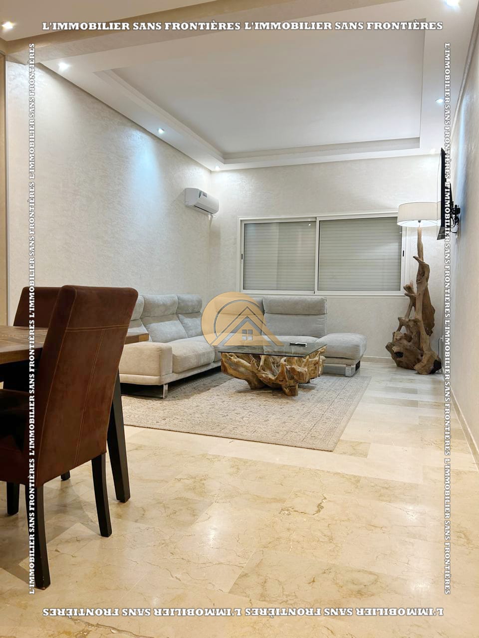 Real Estate Without Borders offers this new furnished 100 m² apartment for sale in Hamria, Meknès, located on the 3rd floor of a residential building. The area is described as calm and secure, and the building is presented with several facilities. Floors are stated as marble and parquet.