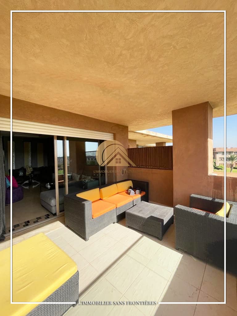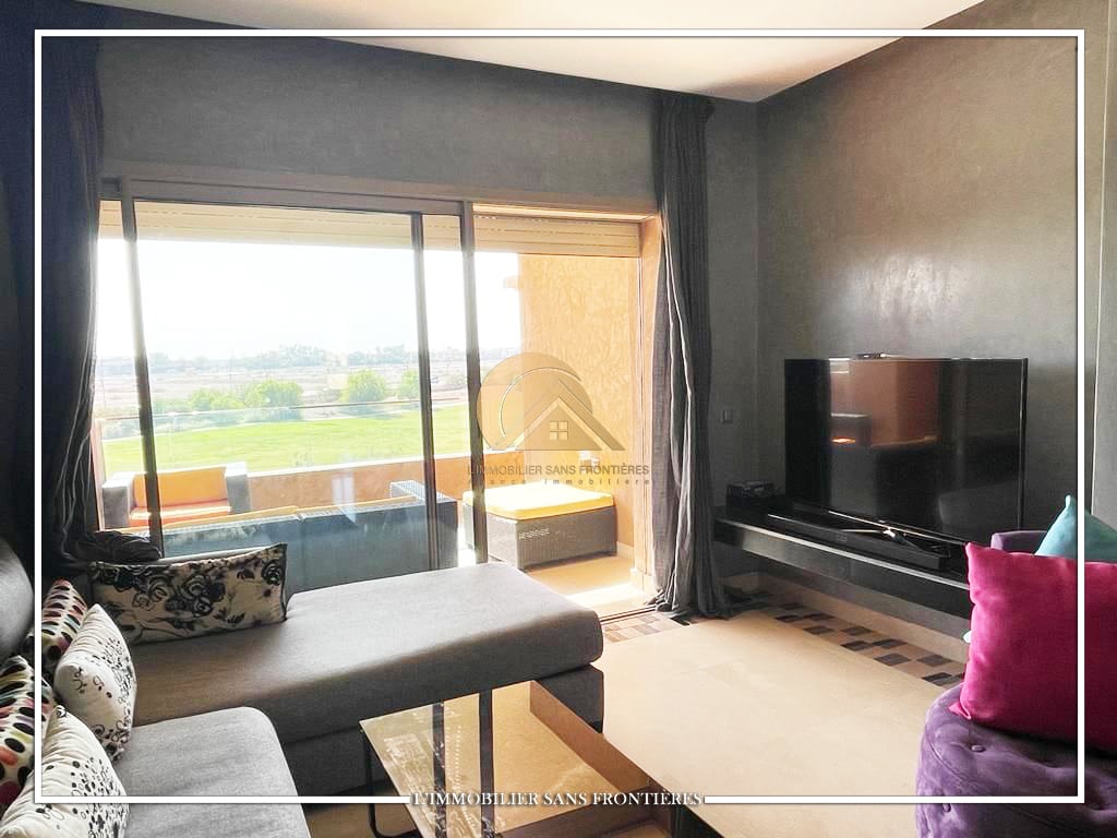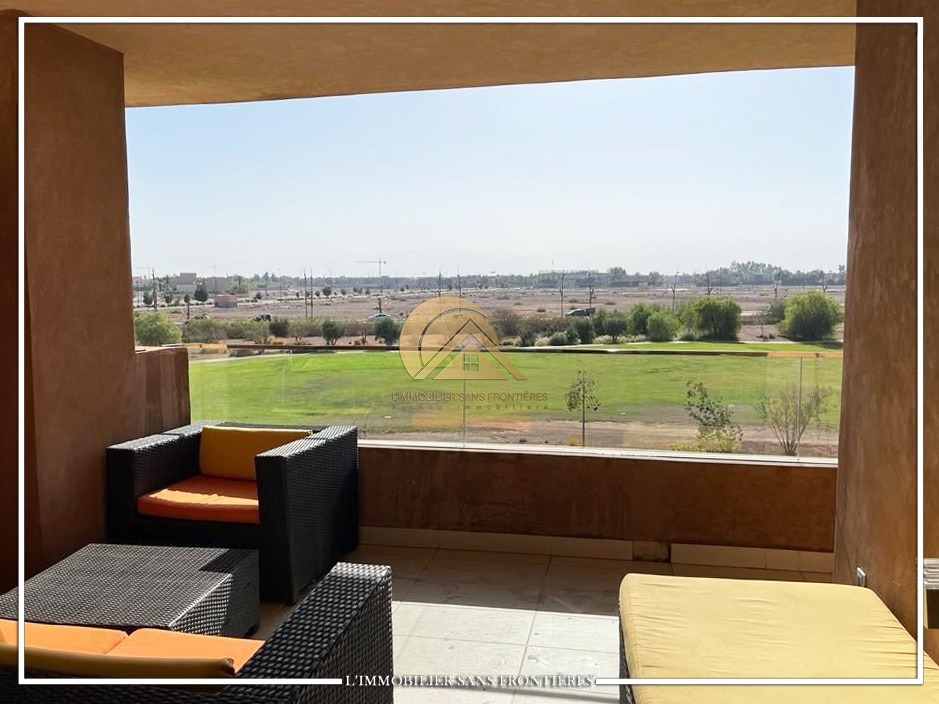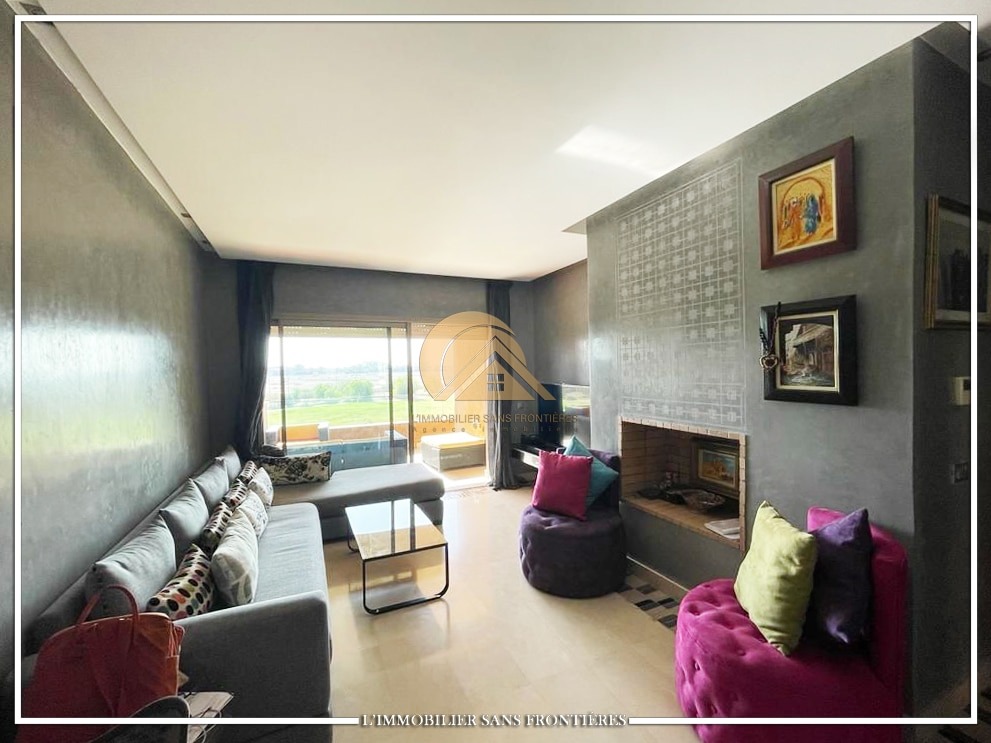 Real Estate Without Borders offers this furnished apartment for sale in Prestigia, Marrakech, with a shared pool and shared gardens as stated. The description mentions a golf course view.
