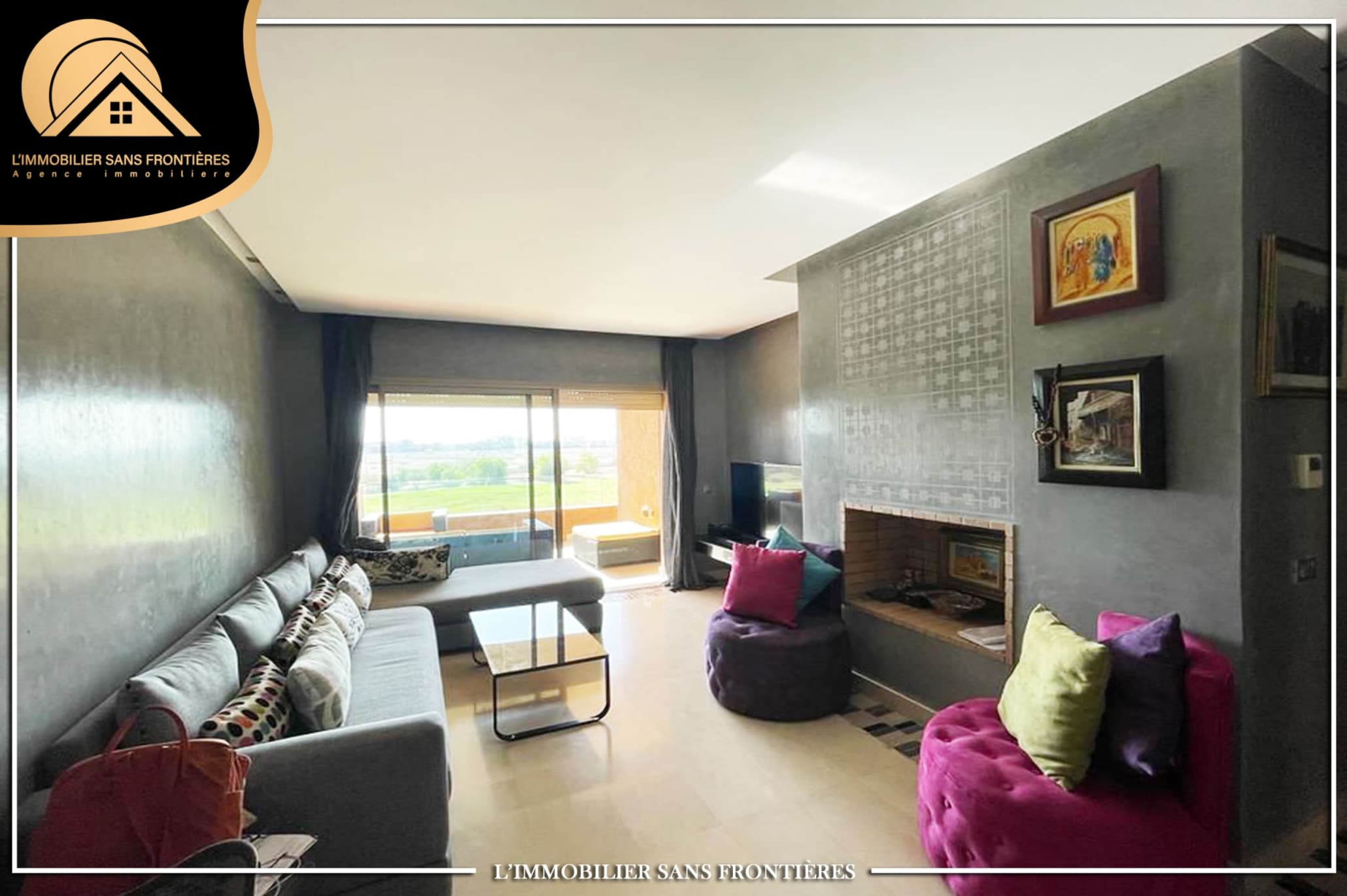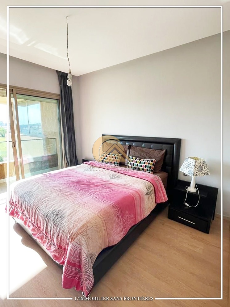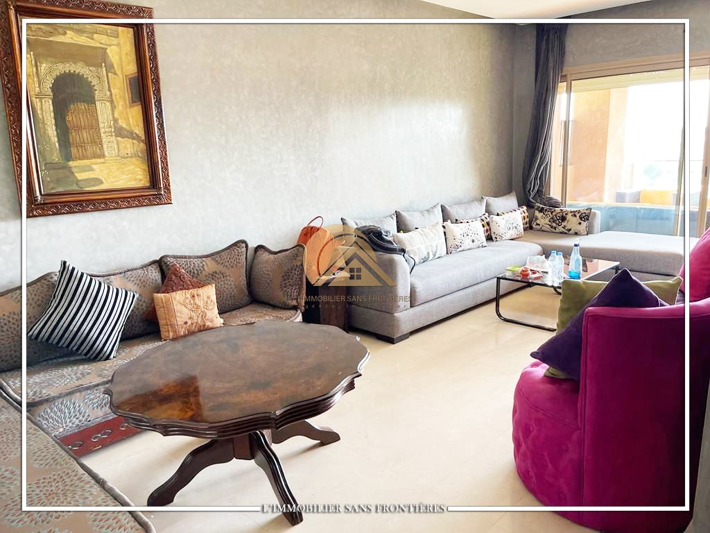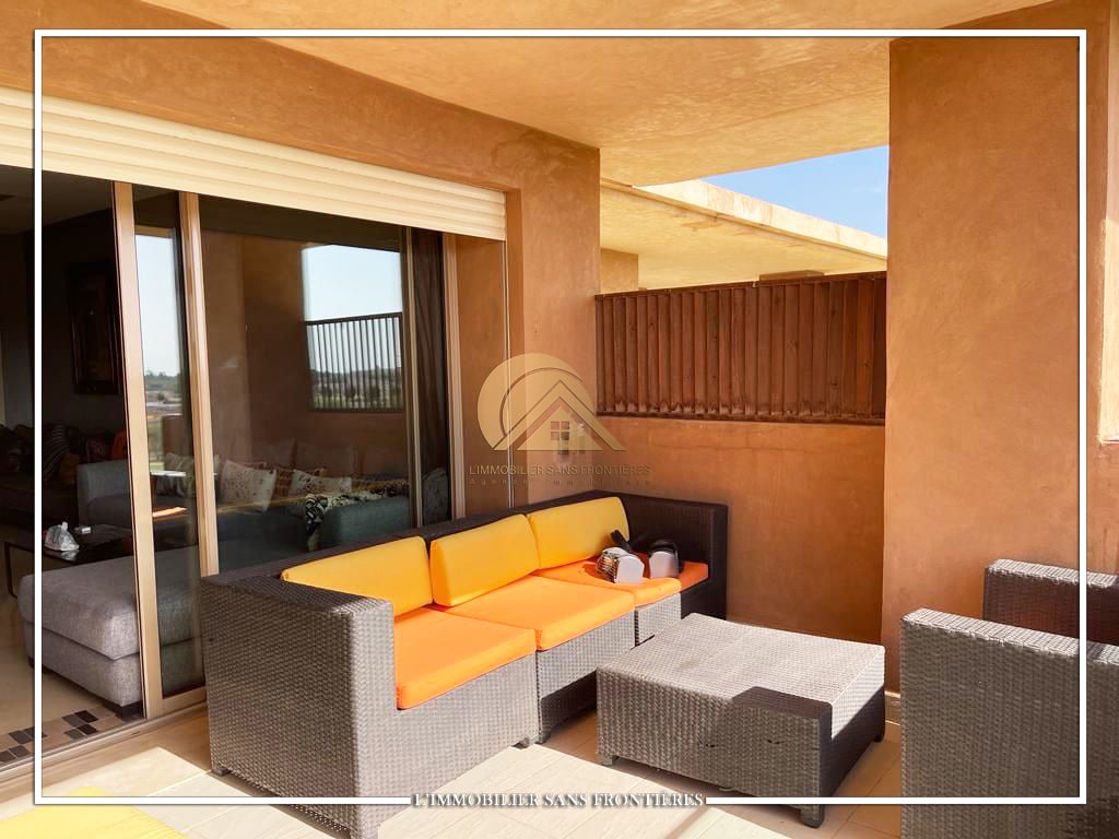 Real Estate Without Borders offers this furnished apartment for sale in Prestigia, Marrakech, with a shared pool and shared gardens as stated. The description mentions a golf course view.