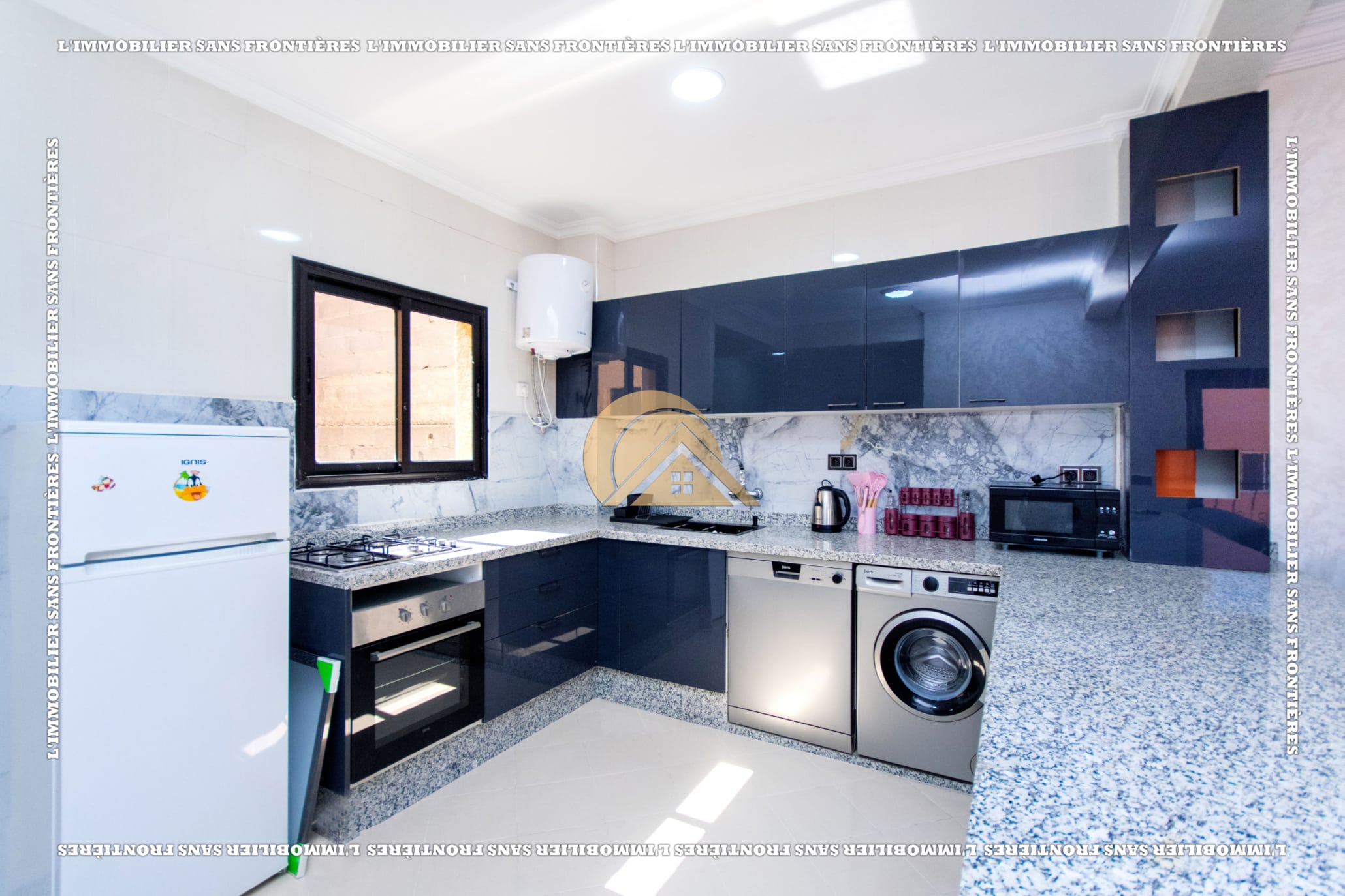 Real Estate Without Borders offers this new furnished apartment for rent in Hay Charaf, Marrakech, in a stated calm and secured area. With 90 m², it is presented in a building with an elevator and parking.