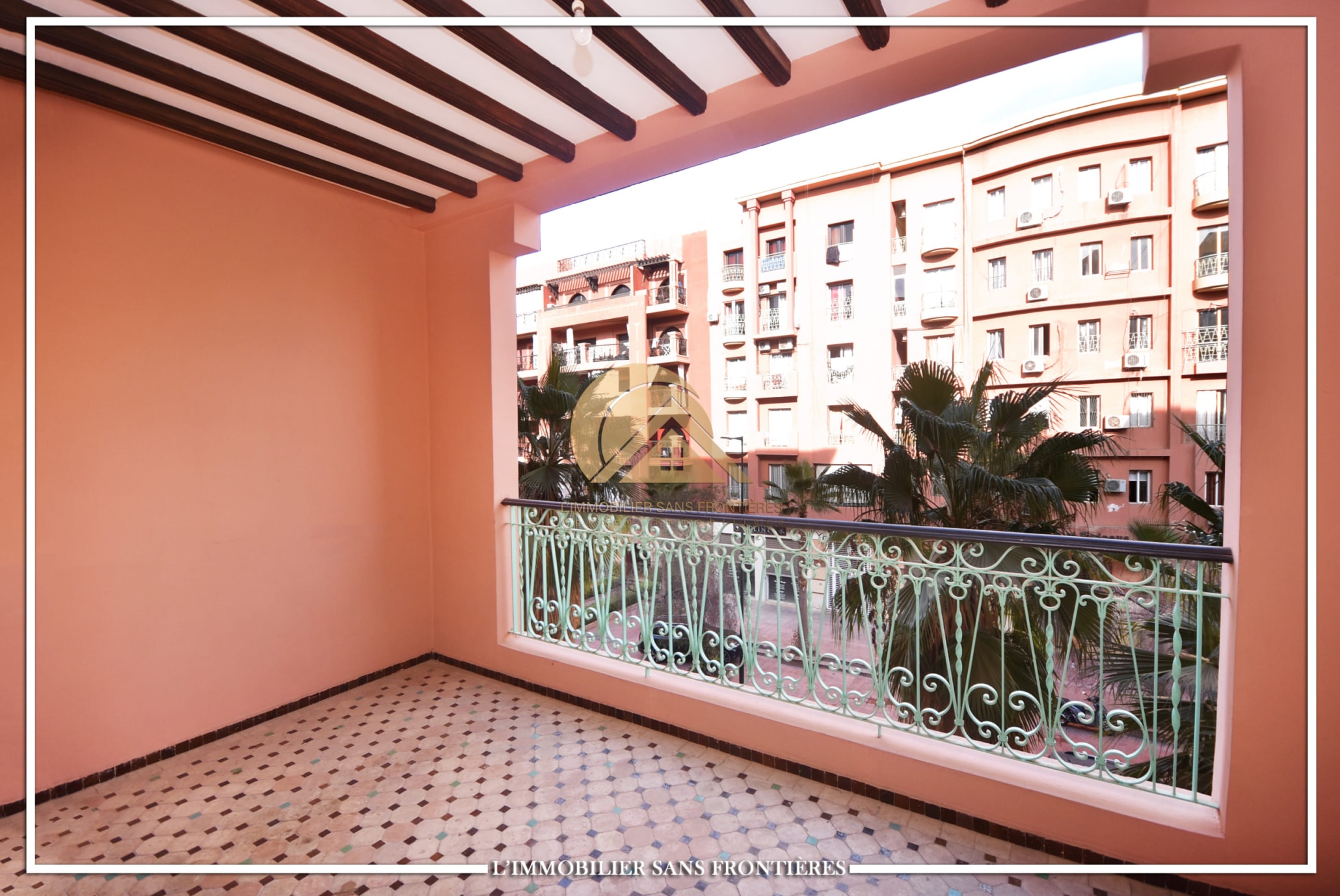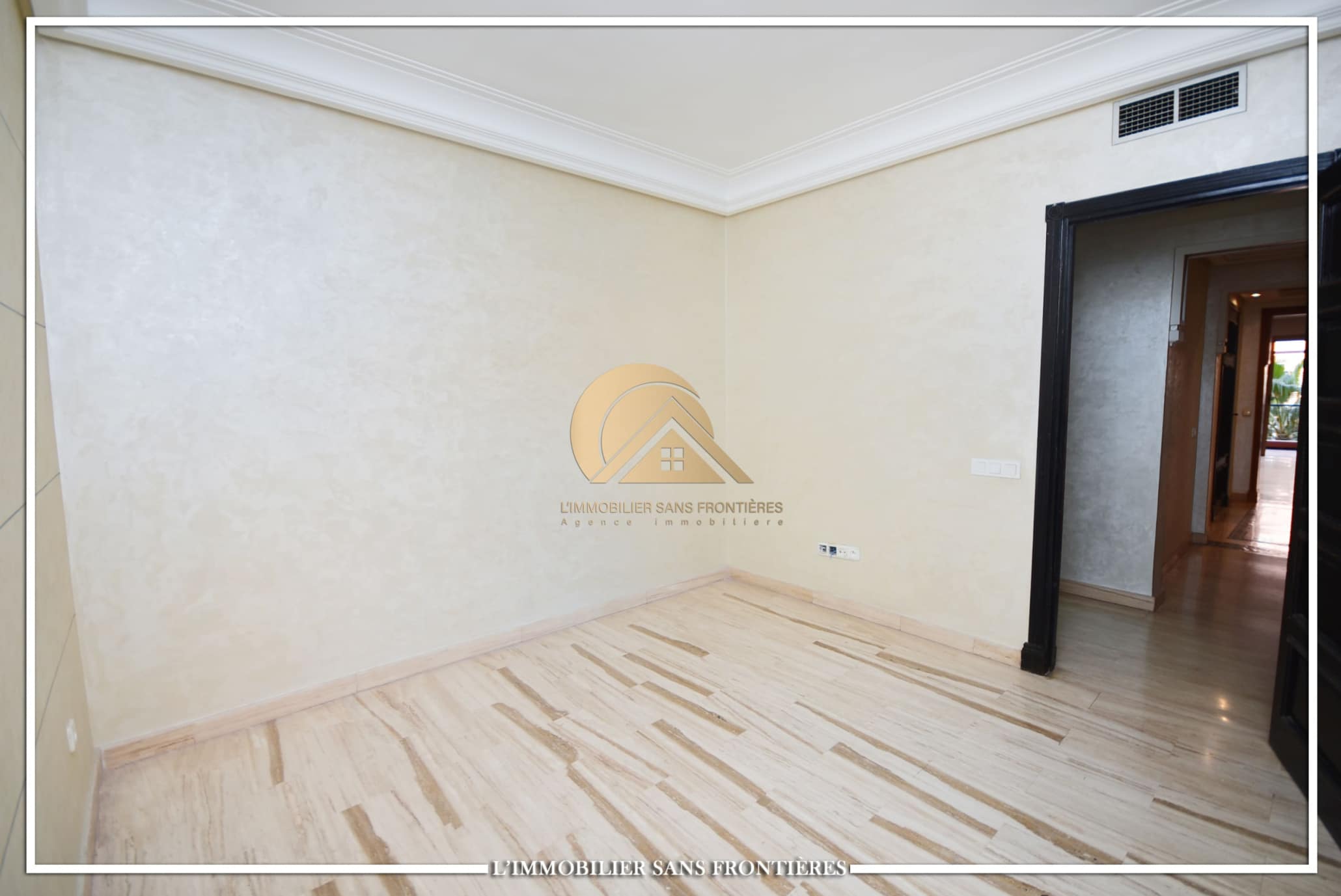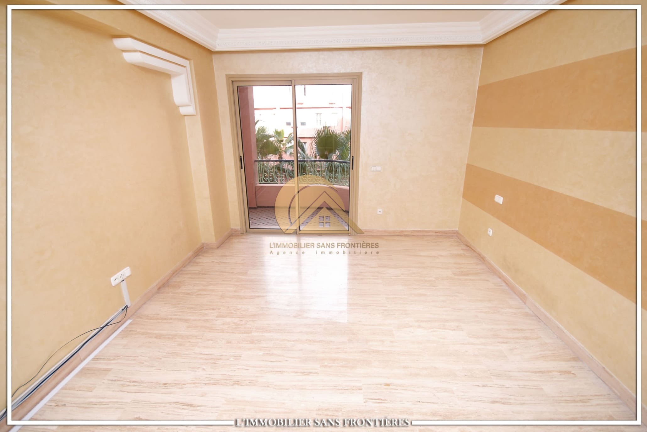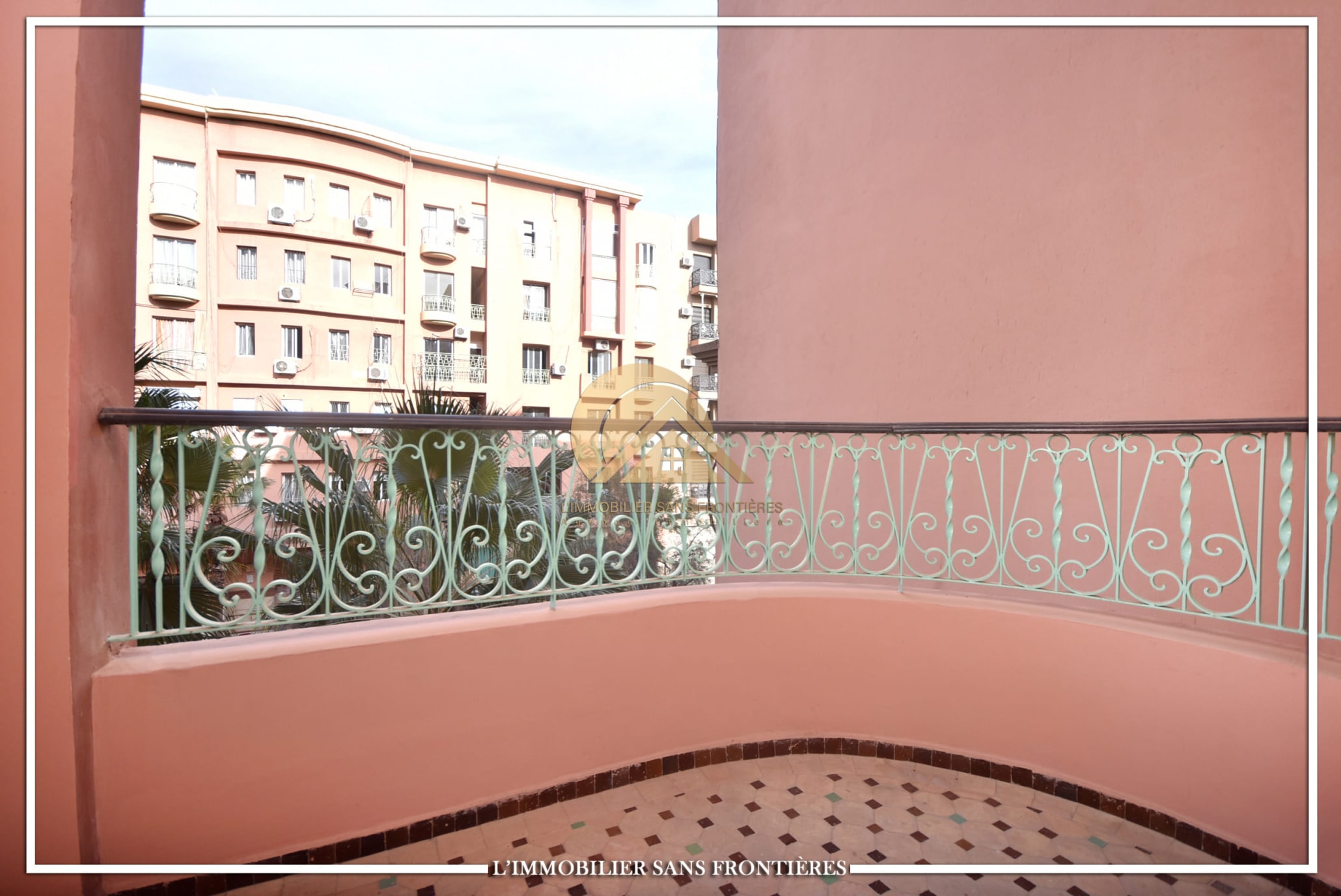 Real Estate Without Borders offers this unfurnished apartment for rent in Gueliz, Marrakech, stated close to amenities. The listing states a calm residence, a unit on the 2nd floor, and 147 m². Central A/C and basement parking are mentioned.