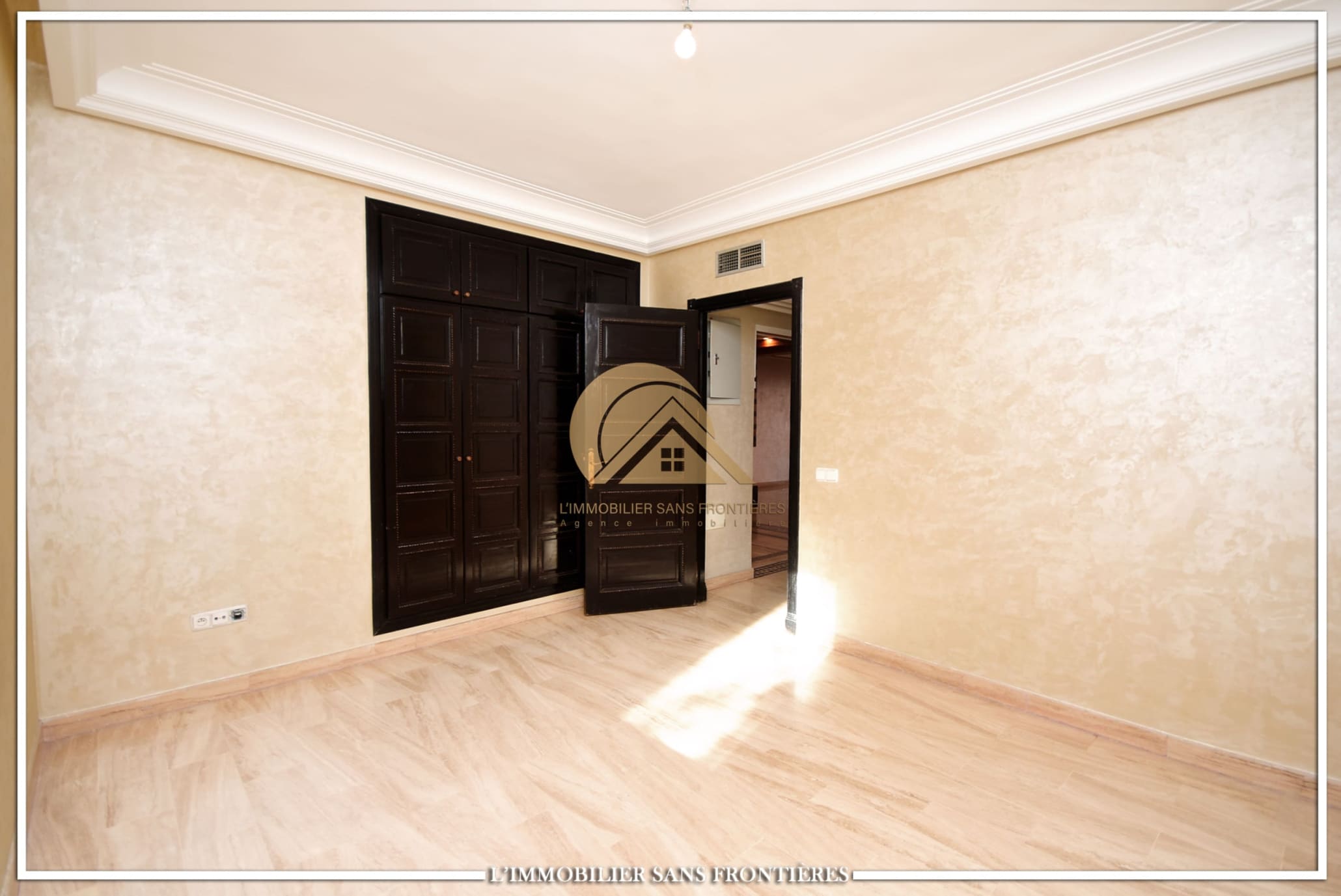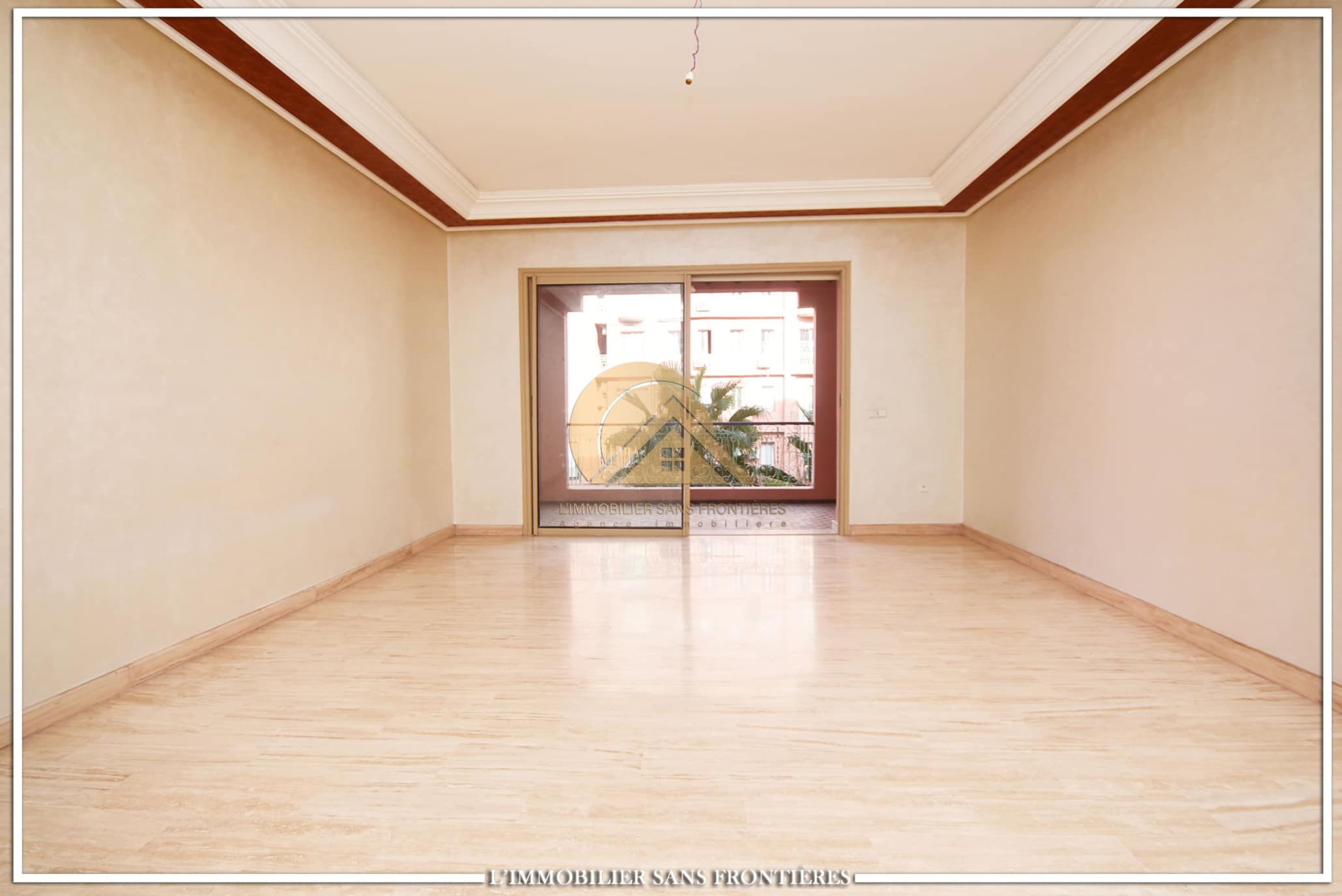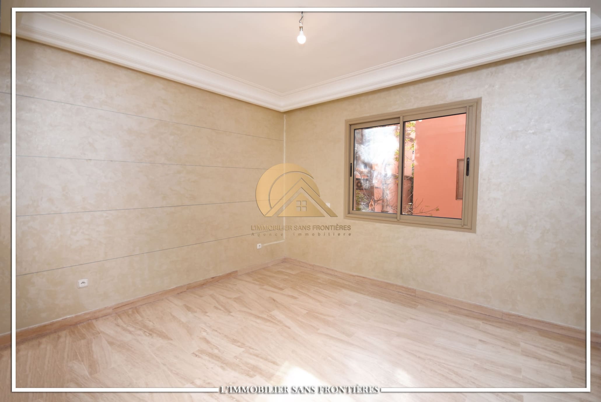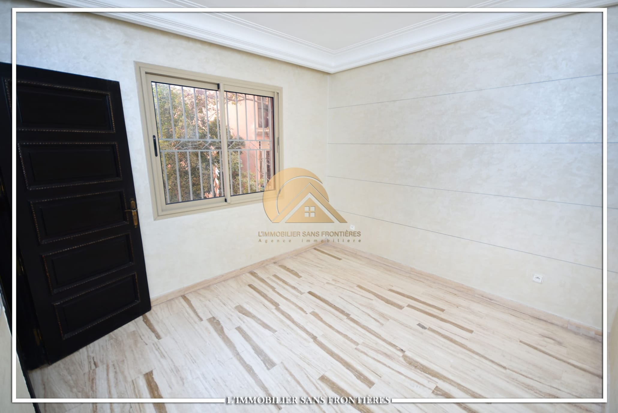 Real Estate Without Borders offers this unfurnished apartment for rent in Gueliz, Marrakech, stated close to amenities. The listing states a calm residence, a unit on the 2nd floor, and 147 m². Central A/C and basement parking are mentioned.