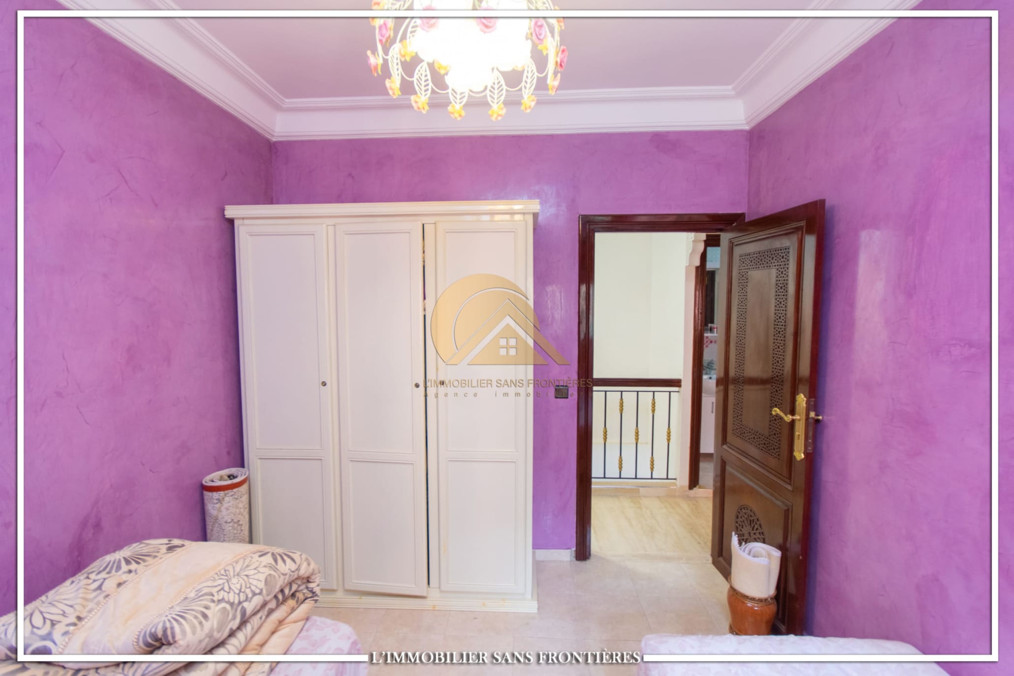 Real Estate Without Borders offers this unfurnished duplex for sale on the ground floor in Jnane Awrad, Marrakech. The text describes a distinctive style with spaces stated as bright, within a secured residence.