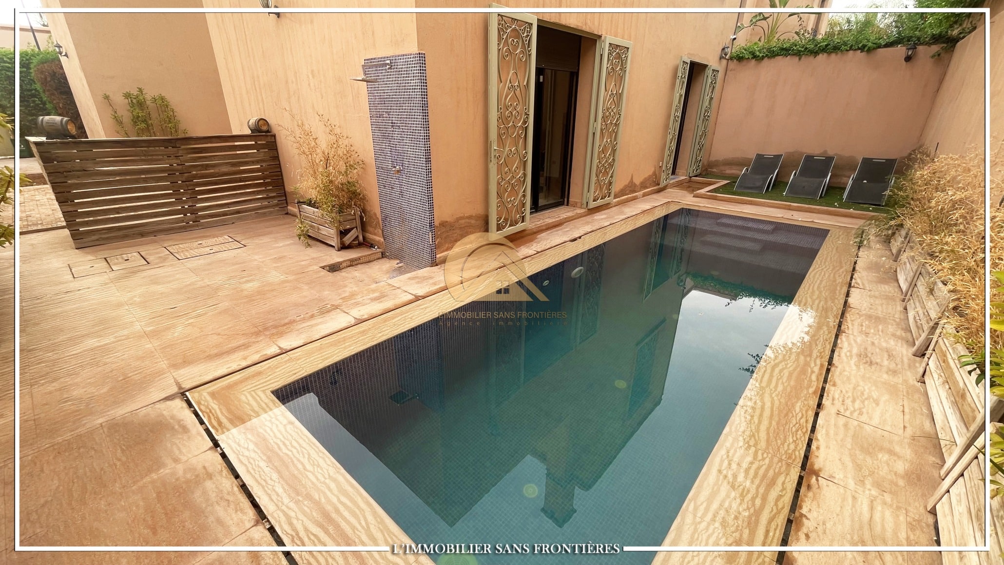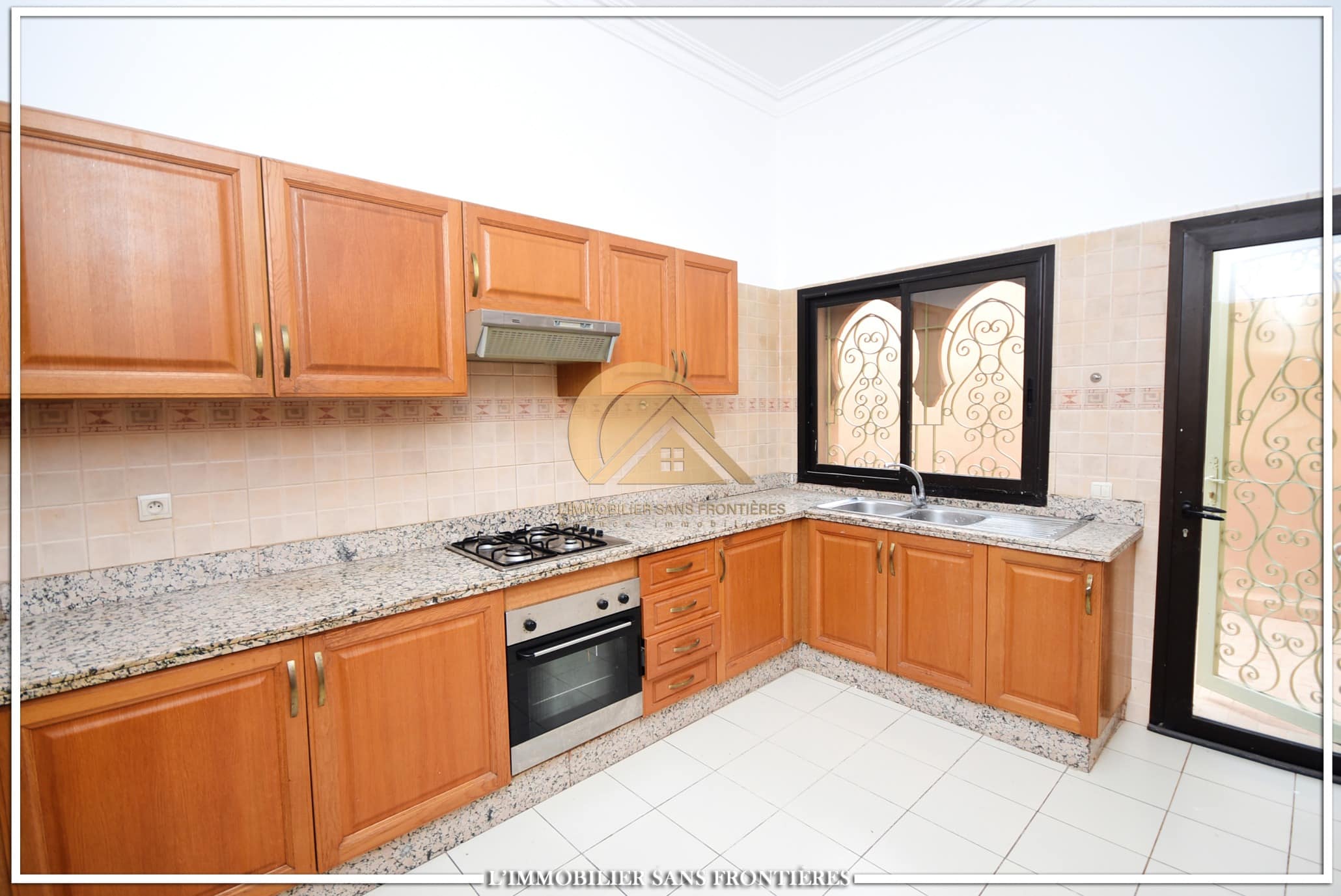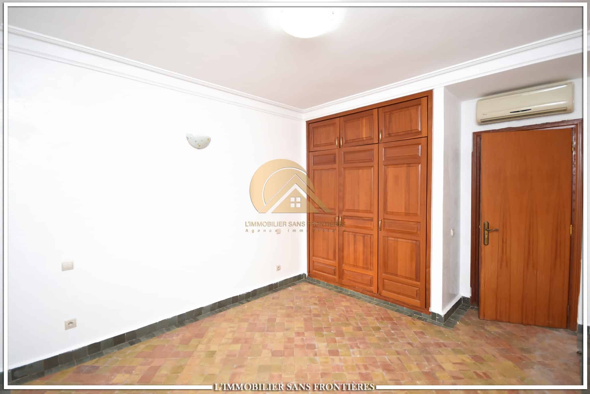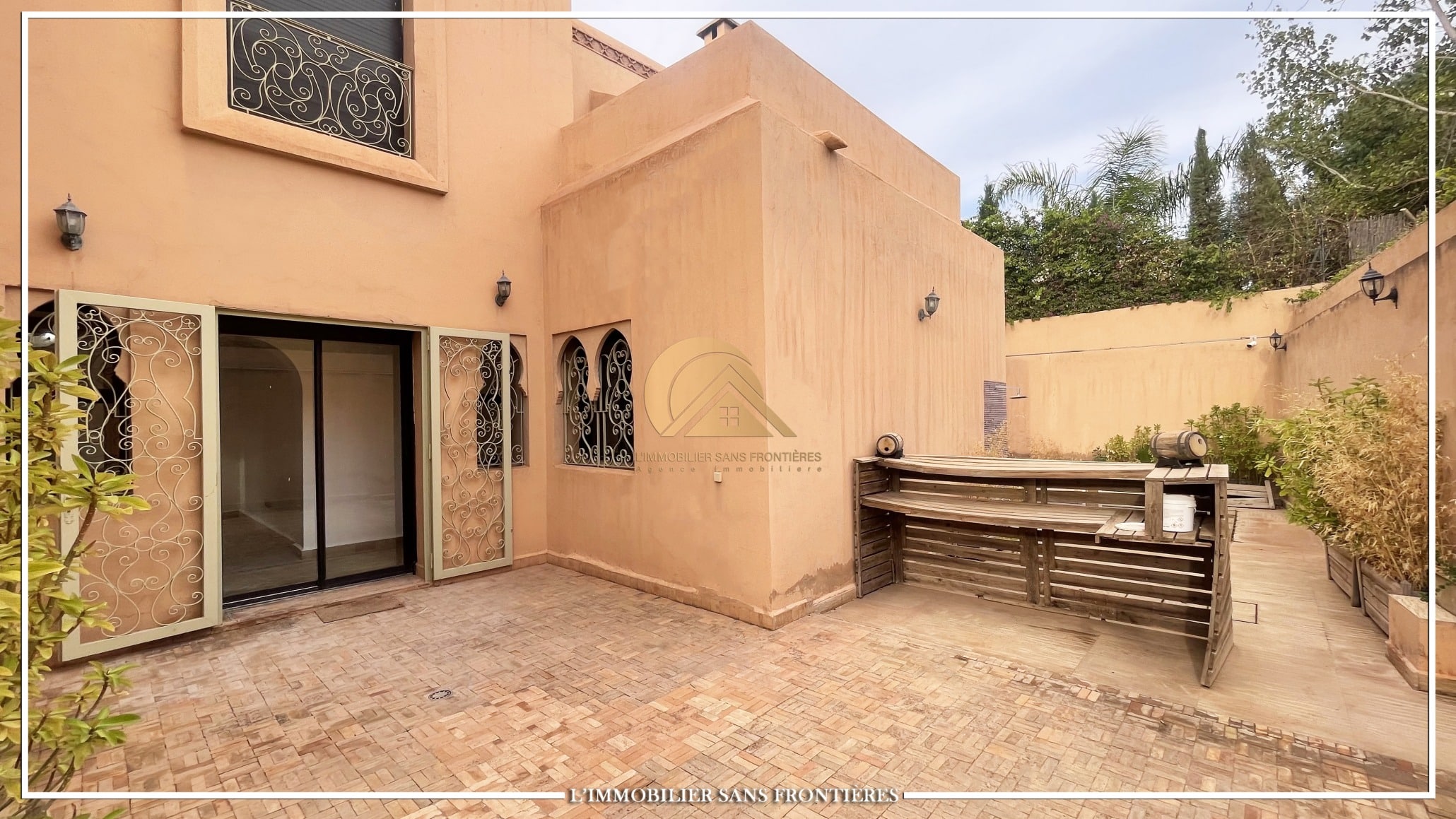 Real Estate Without Borders offers this empty villa for rent within a secure residence in Targa, Marrakech, in a calm residential setting. Built on a 350 m² plot with 260 m² of living space, it includes a private garden and a pool.