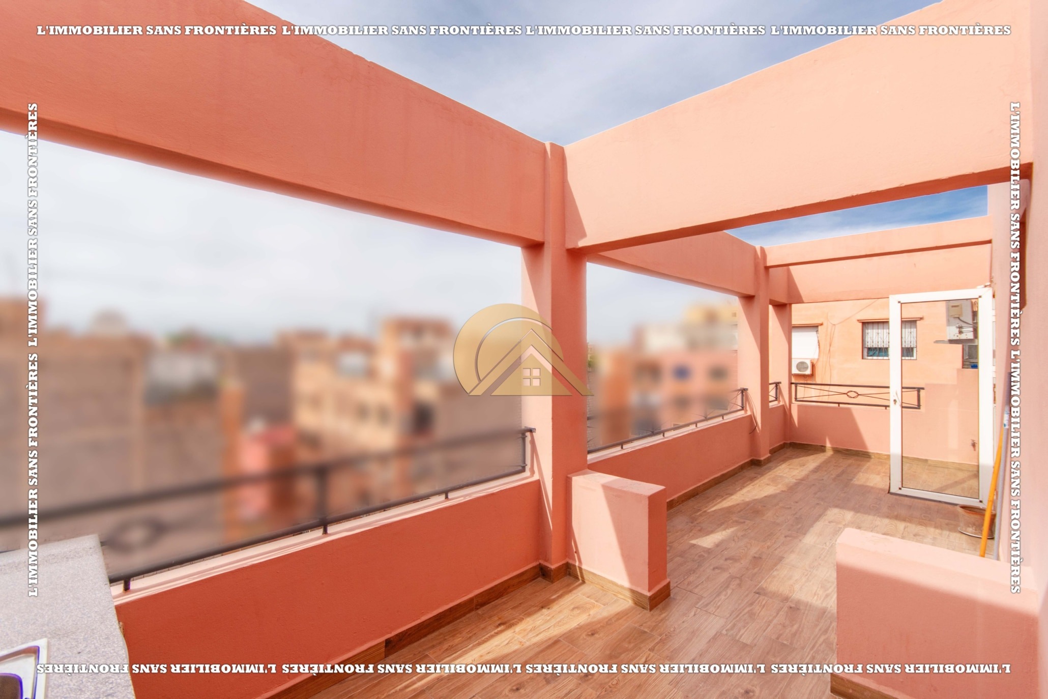 Real Estate Without Borders offers for rent this 120 sqm furnished apartment on the 5th floor in Guéliz, Marrakech. The property is stated with two façades and several outdoor spaces. The layout includes a fitted terrace with an outdoor kitchenette.