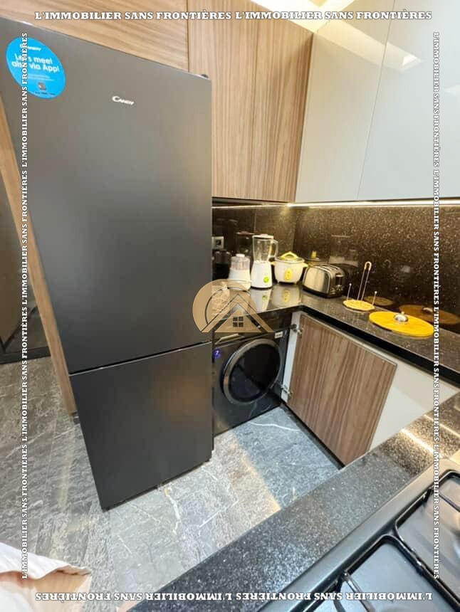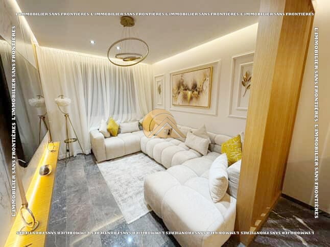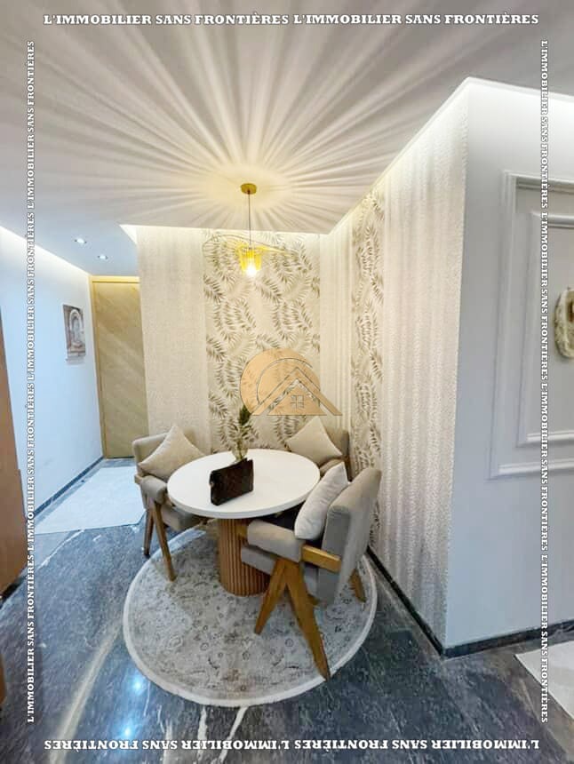 Real Estate Without Borders offers this furnished apartment for rent in Izdihar, Marrakech. Located on the 5th floor of a residence with an elevator, the text describes it as functional and bright, close to neighborhood amenities.