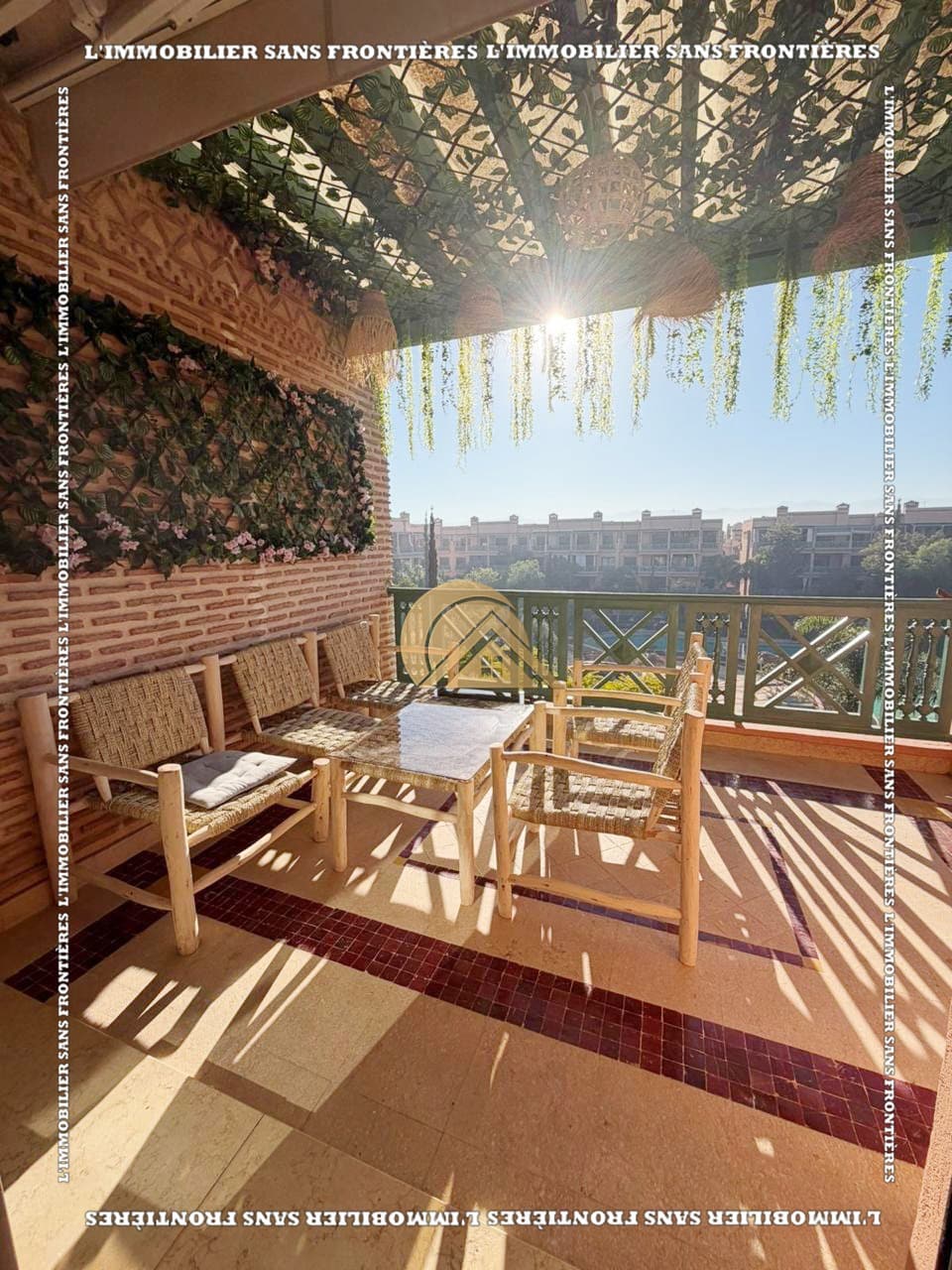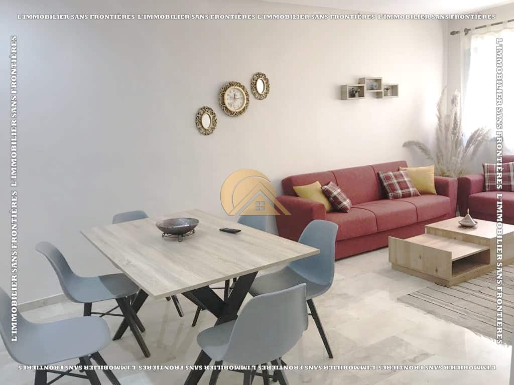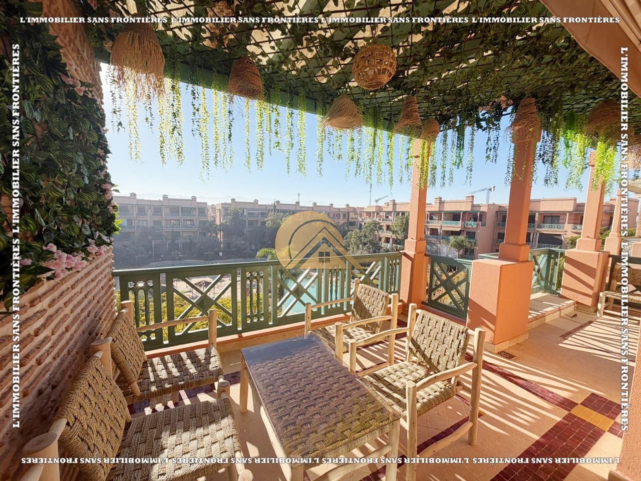 Real Estate Without Borders offers this furnished apartment for rent in Agdal, Marrakech, on the 3rd floor of a secure and well-maintained residence. The stated area is 106 m², with a layout including a living room with fireplace and terraces. The residence mentions a shared pool, gym and parking.
