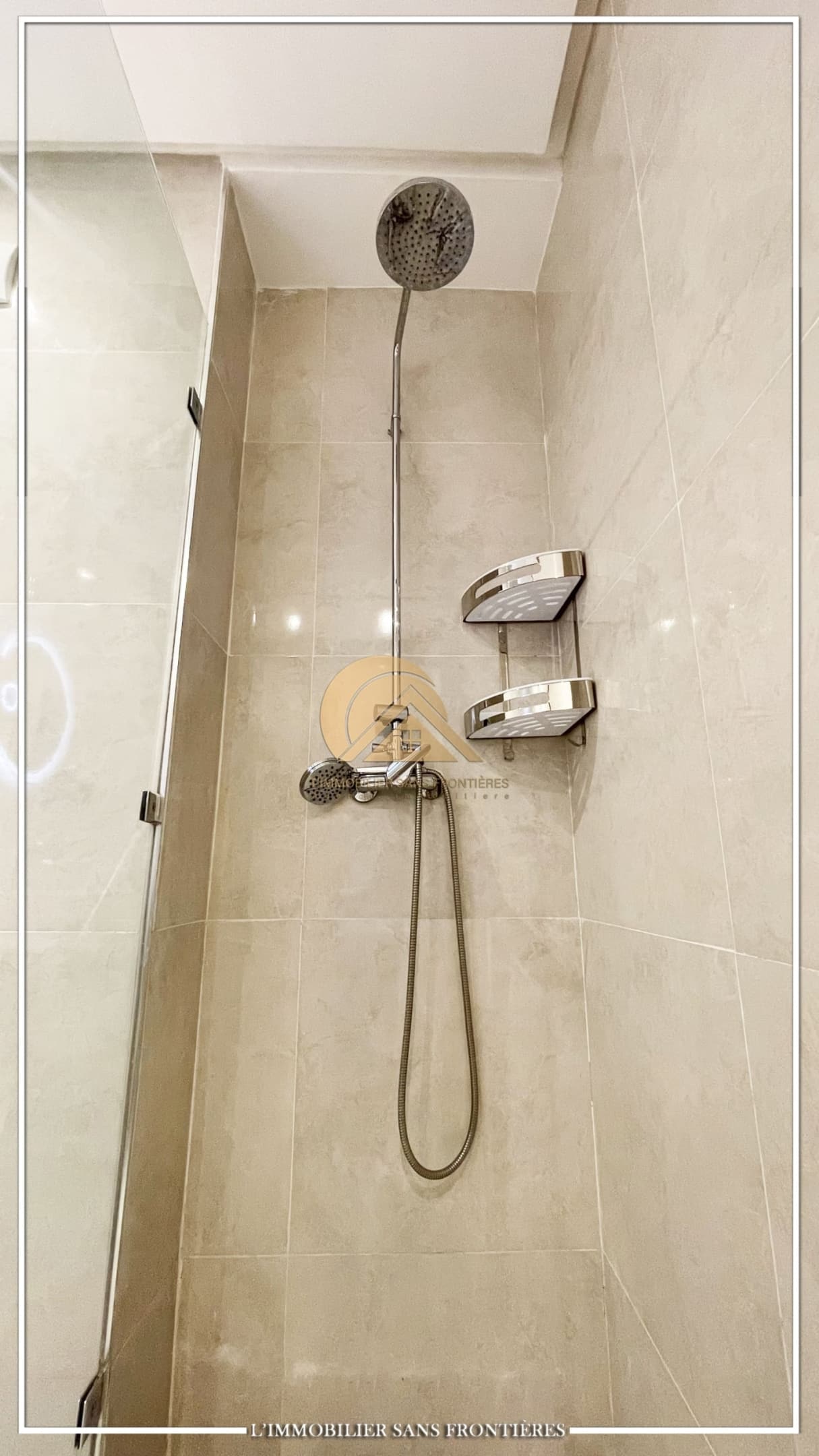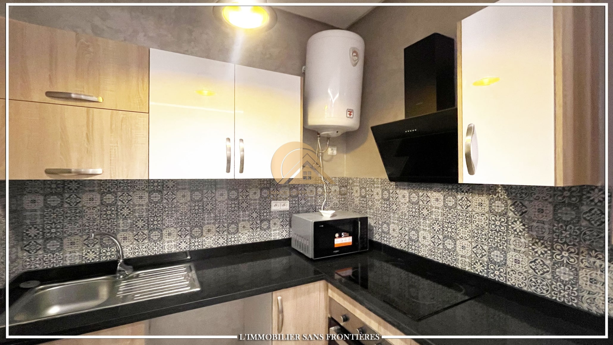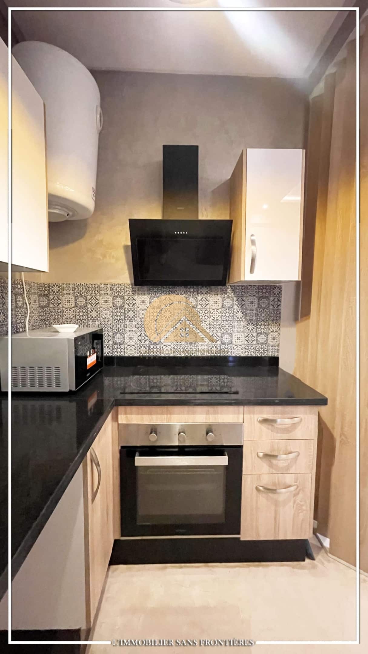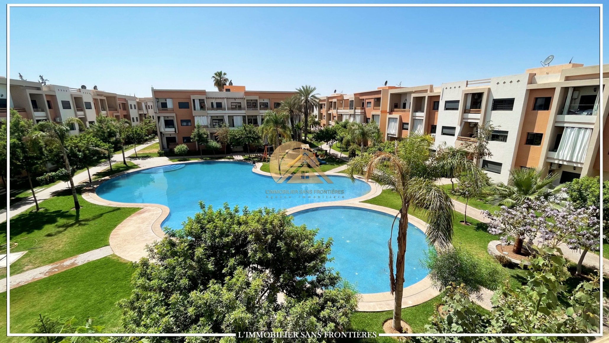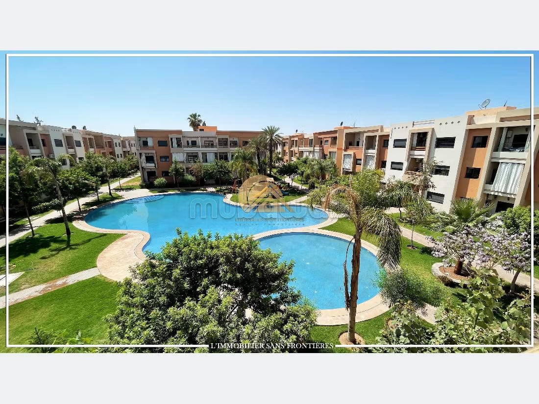 Real Estate Without Borders offers this furnished apartment for sale in Targa, Marrakech, on the garden level in a secured residence. The residence includes a shared pool and shared garden, and the apartment has a private garden. The listing indicates a basement parking space and titled parking.