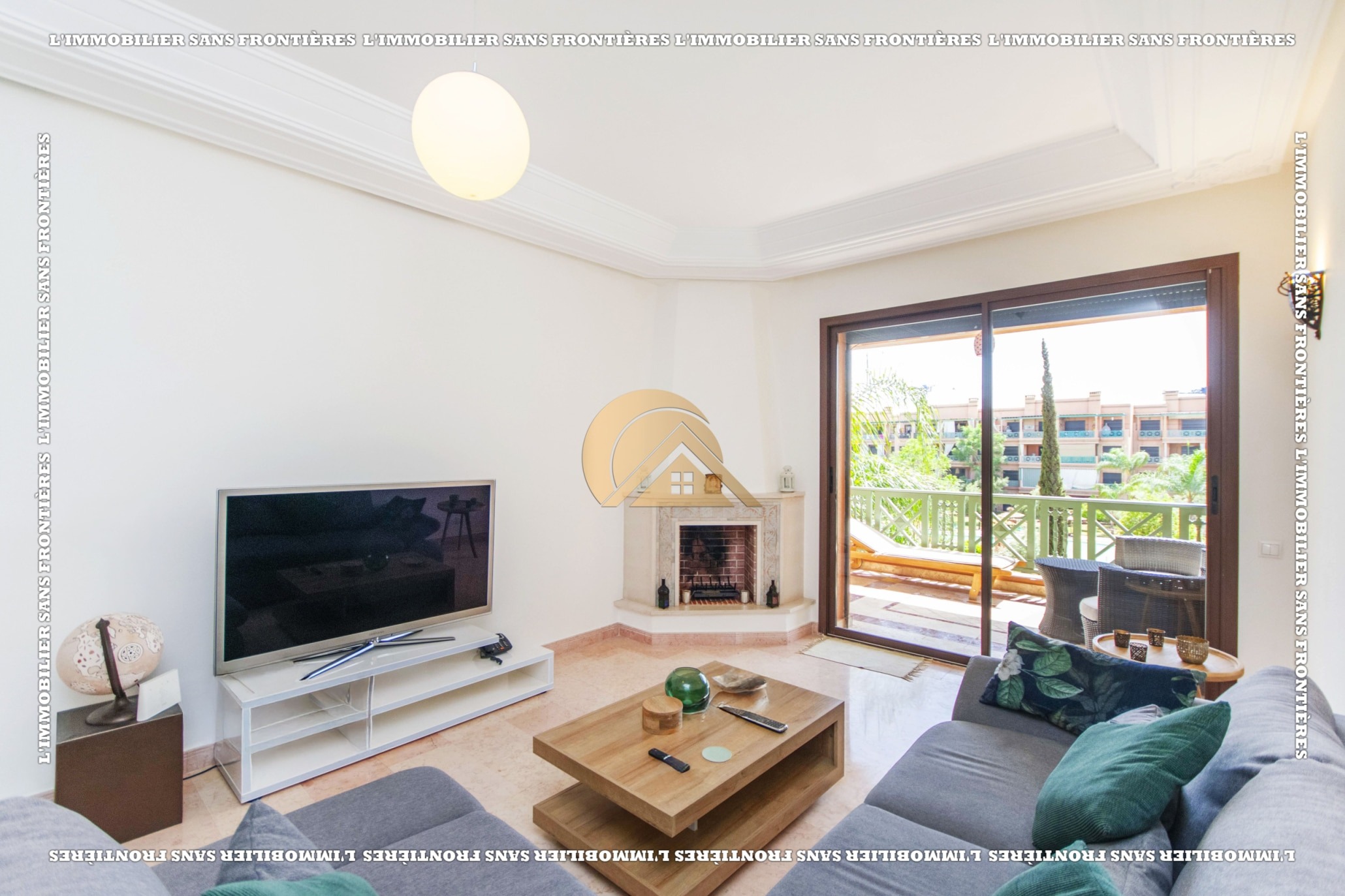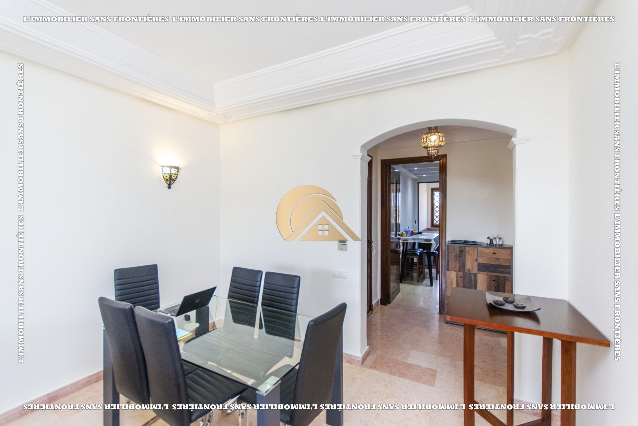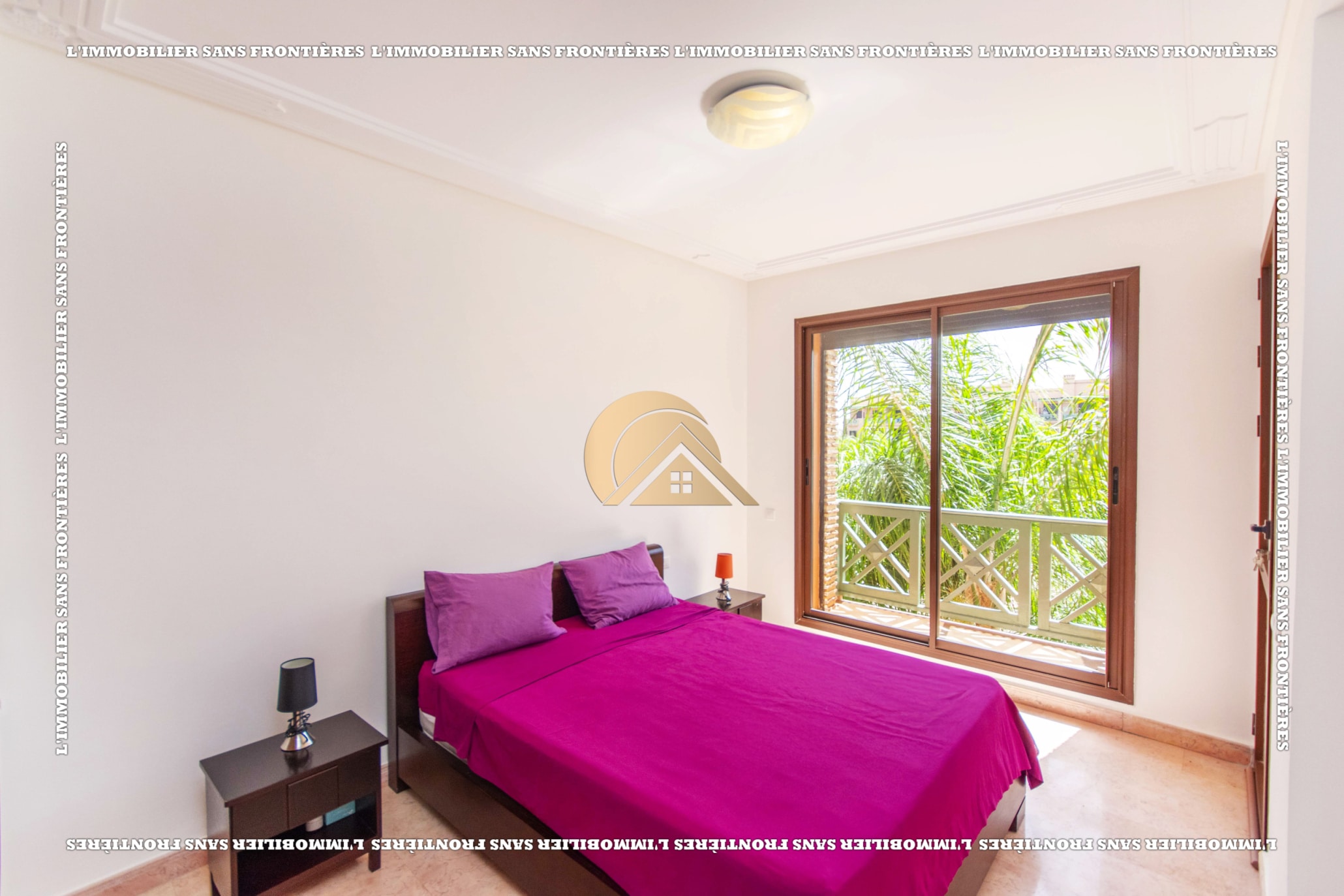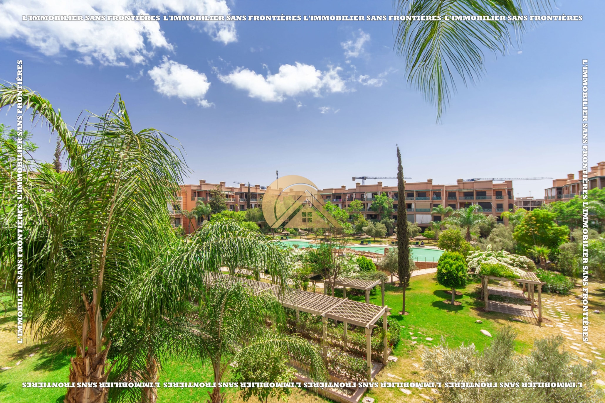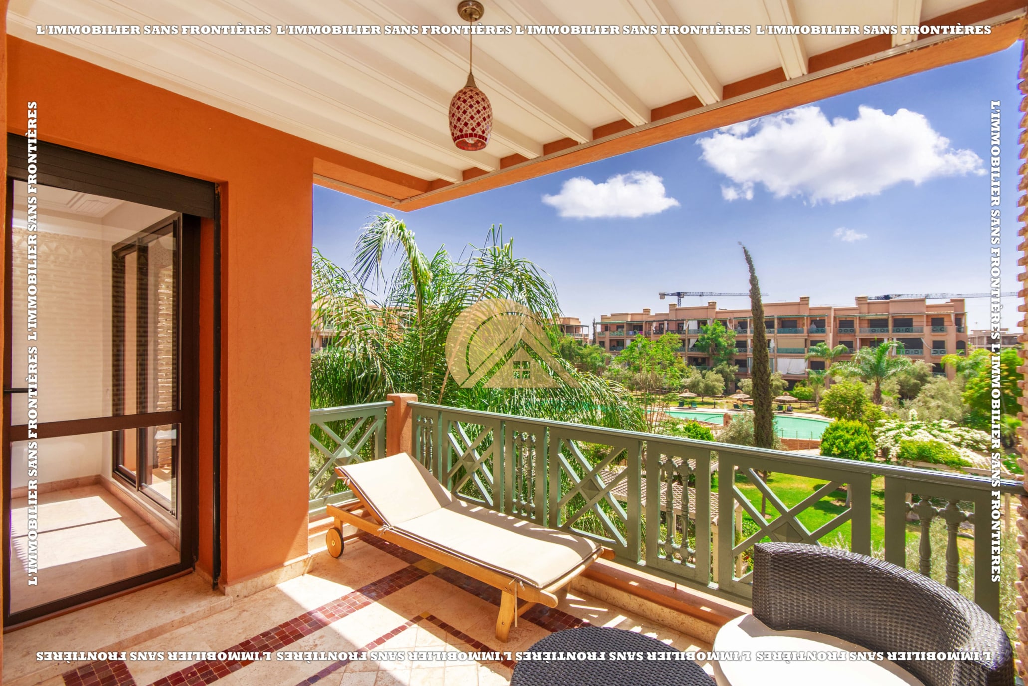 Real Estate Without Borders offers this furnished apartment for sale in Agdal, Marrakech, on the 2nd floor. It is in a calm, secure and well-maintained residence with an elevator, shared garden, shared pool and basement parking. The stated area is 104 m².