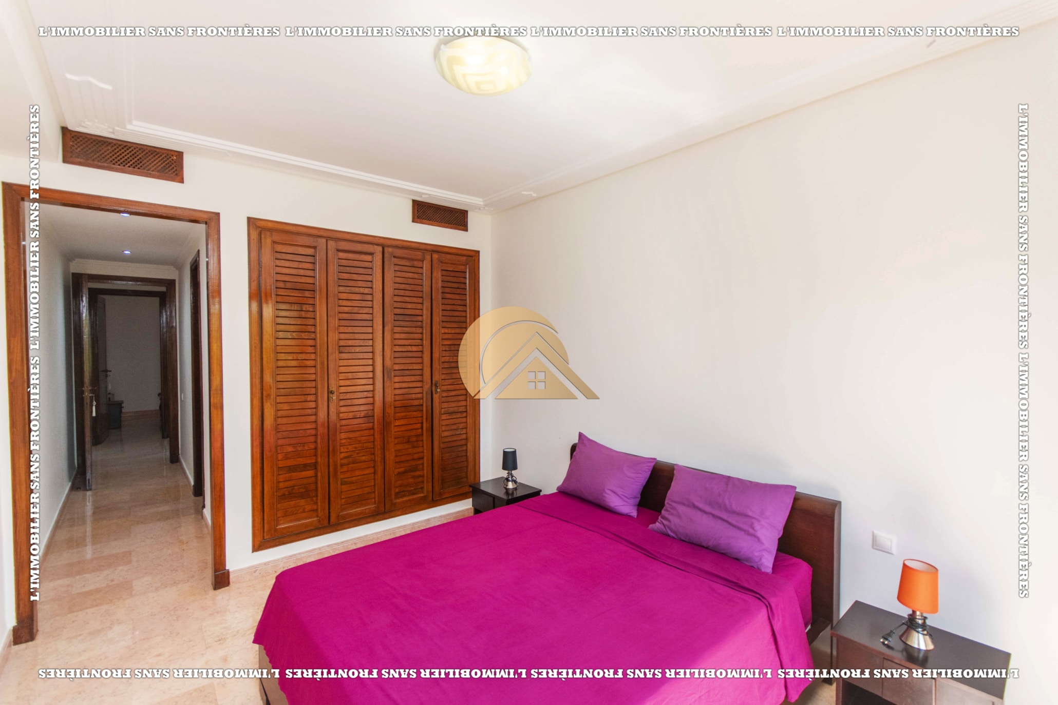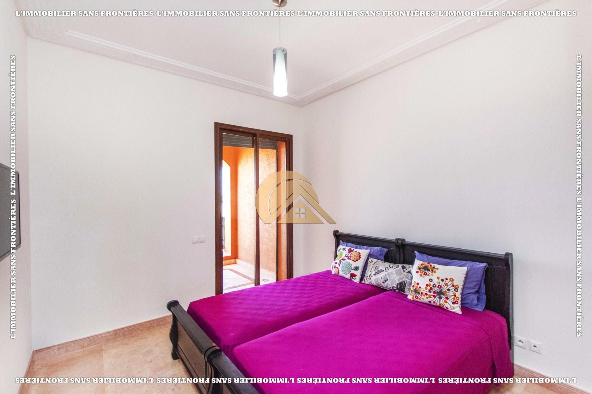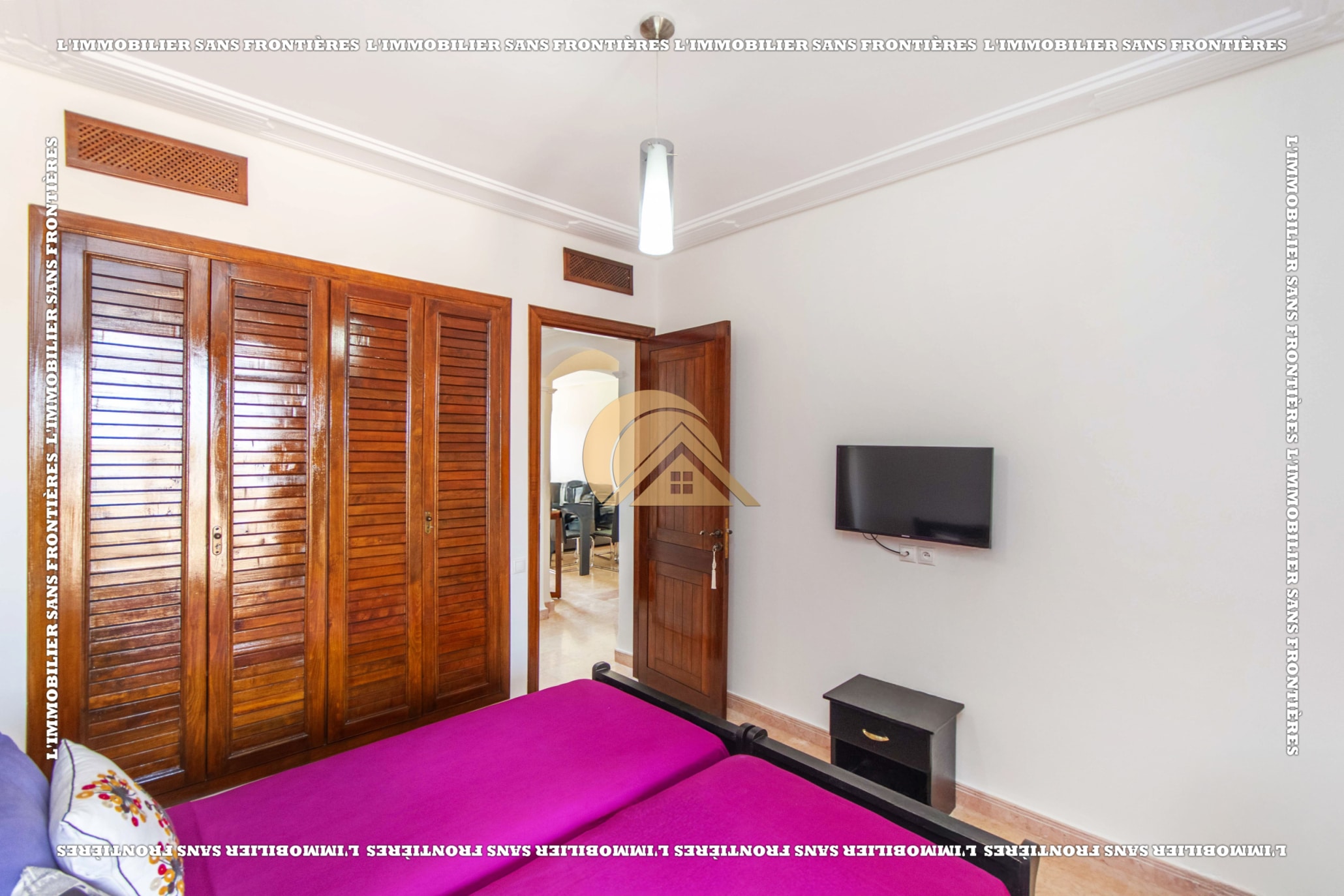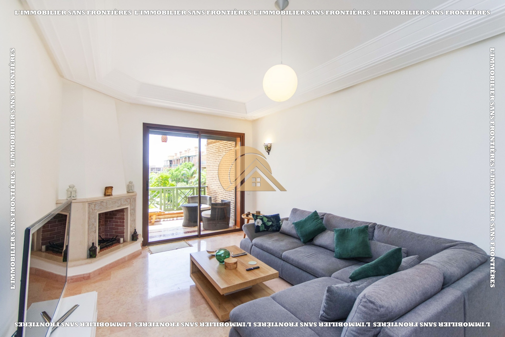 Real Estate Without Borders offers this furnished apartment for sale in Agdal, Marrakech, on the 2nd floor. It is in a calm, secure and well-maintained residence with an elevator, shared garden, shared pool and basement parking. The stated area is 104 m².