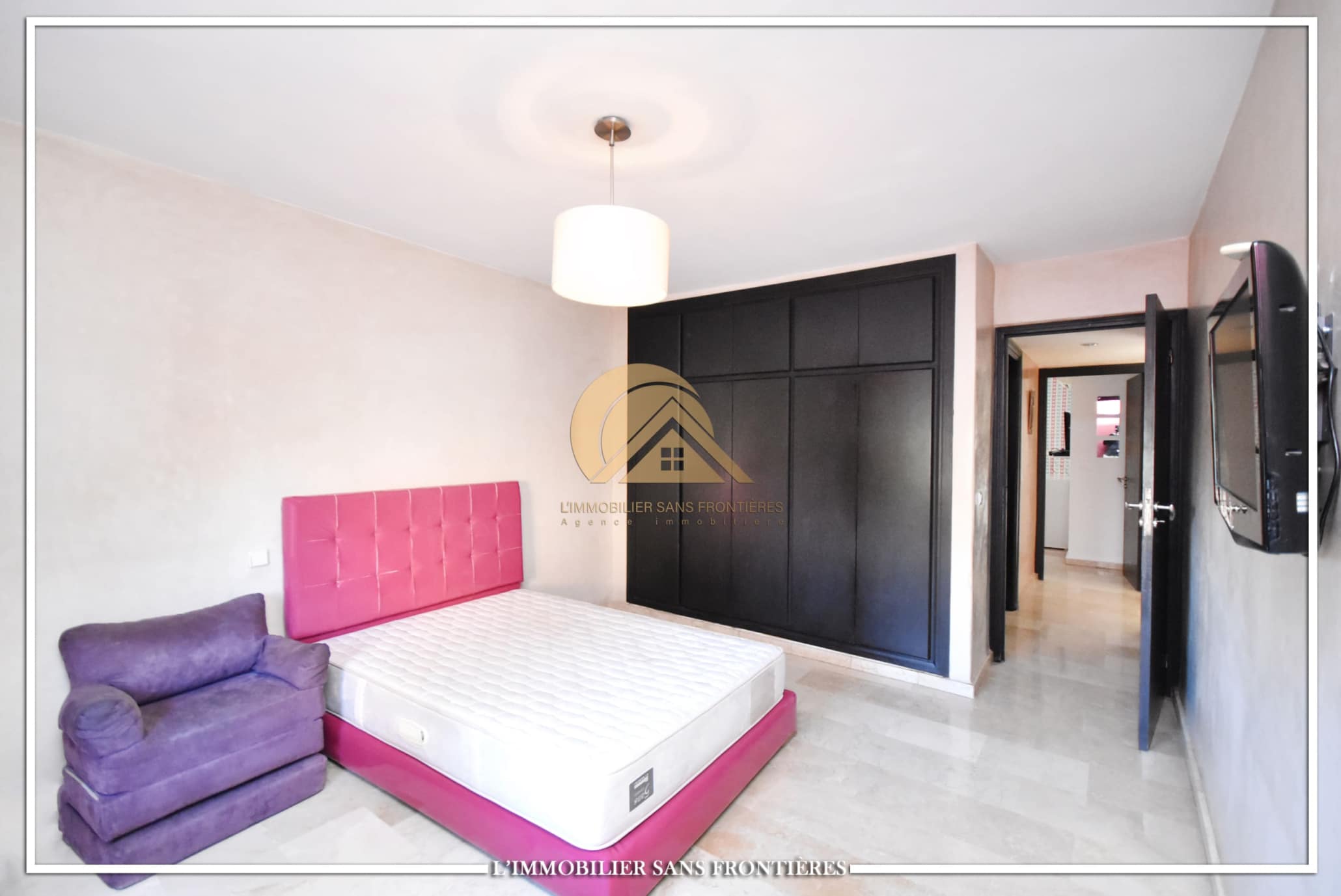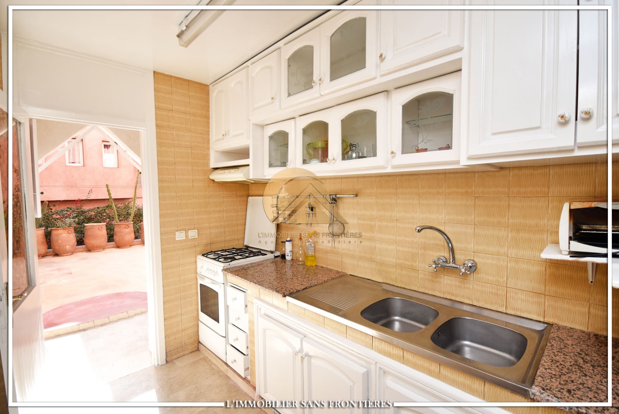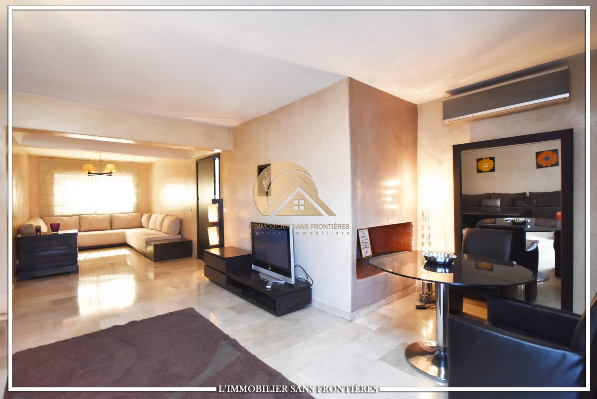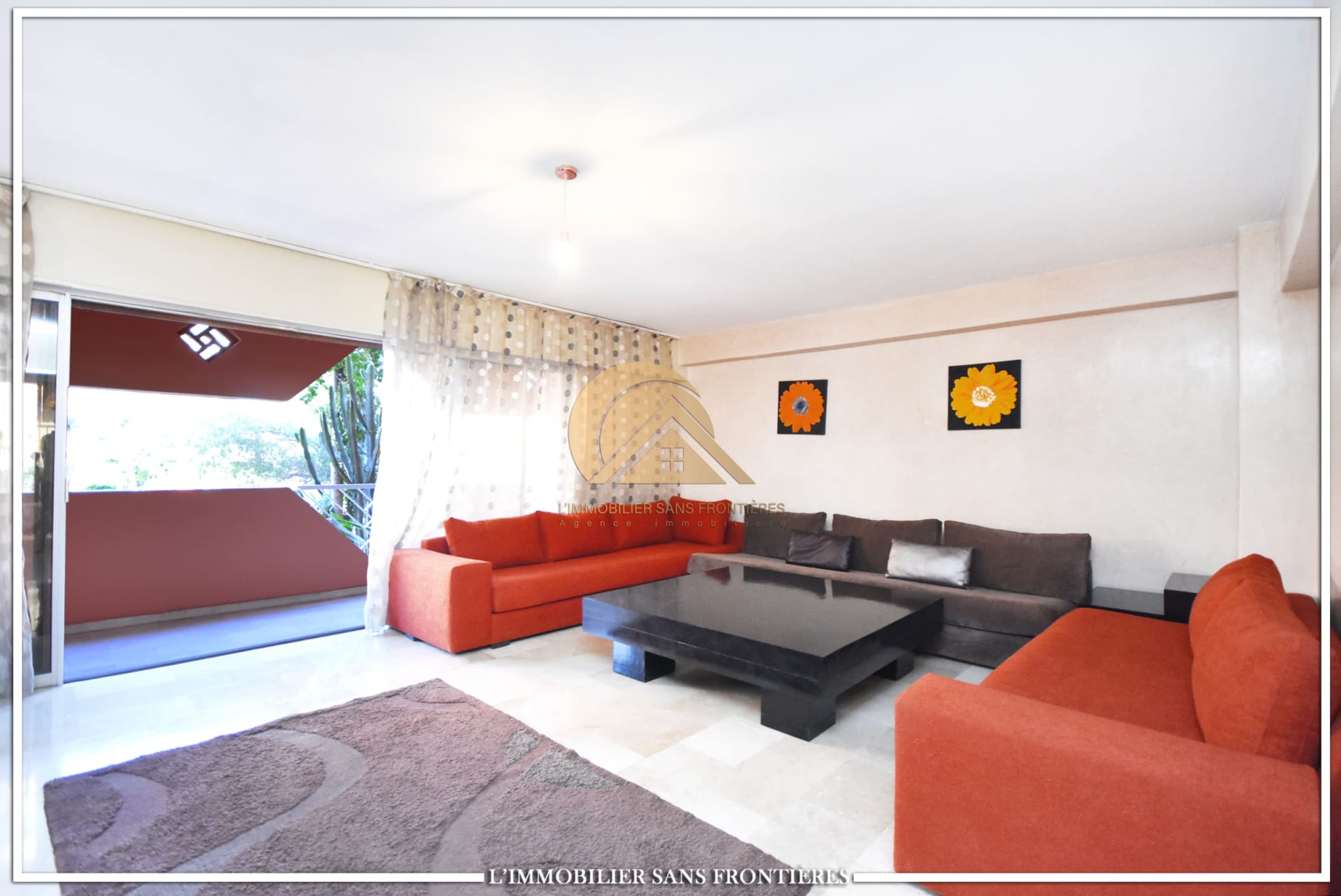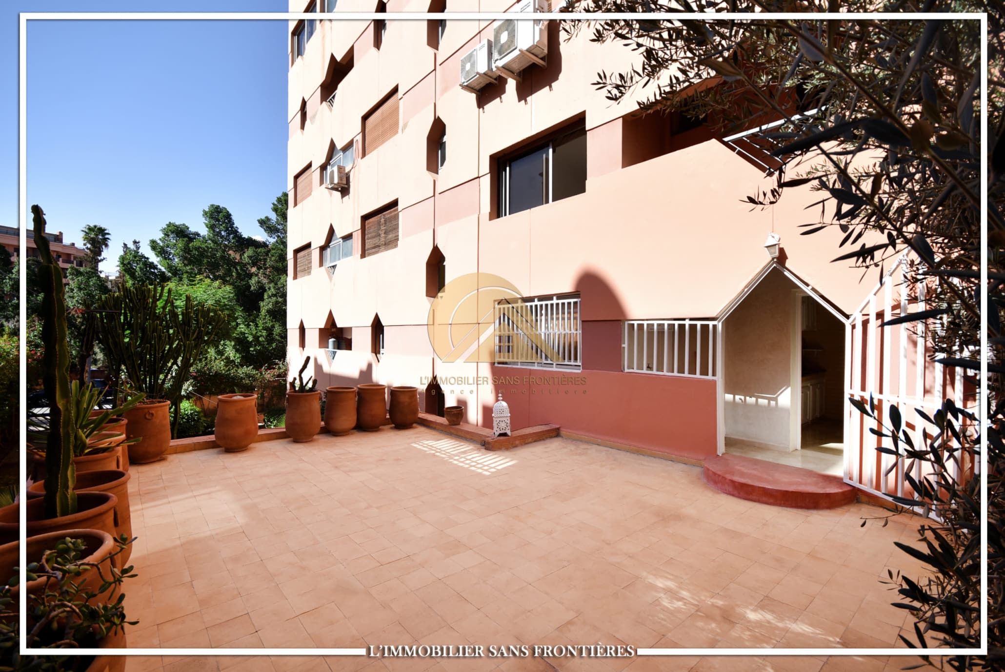Real Estate Without Borders offers this furnished apartment for rent in Hivernage, Marrakech, in a setting described as peaceful with a secured residence and a green garden. Area: 125m² including a 50m² terrace, on the 1st floor.