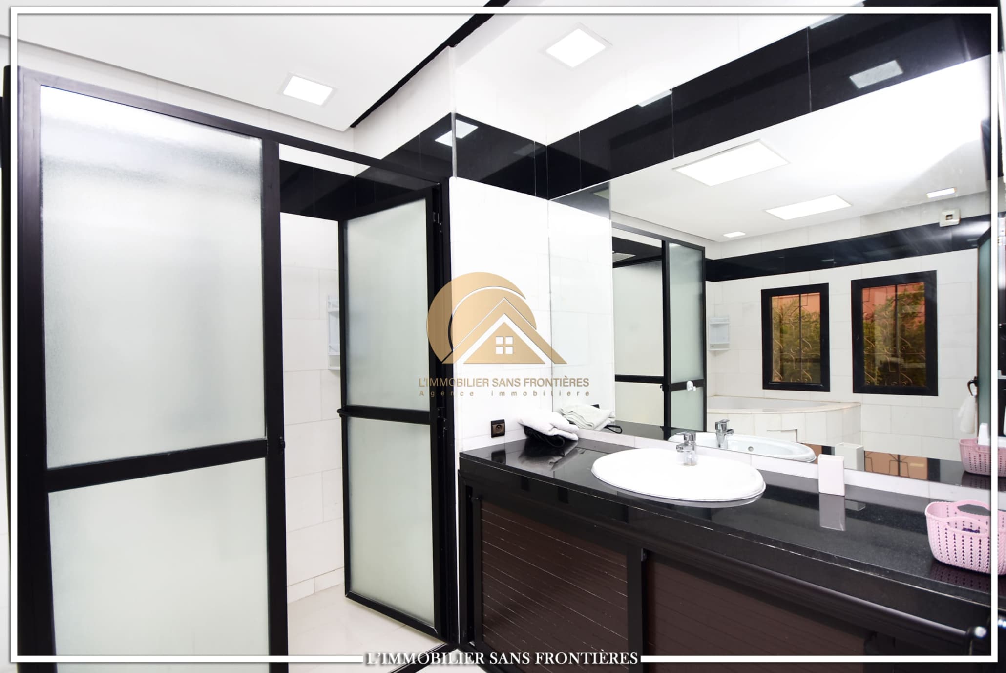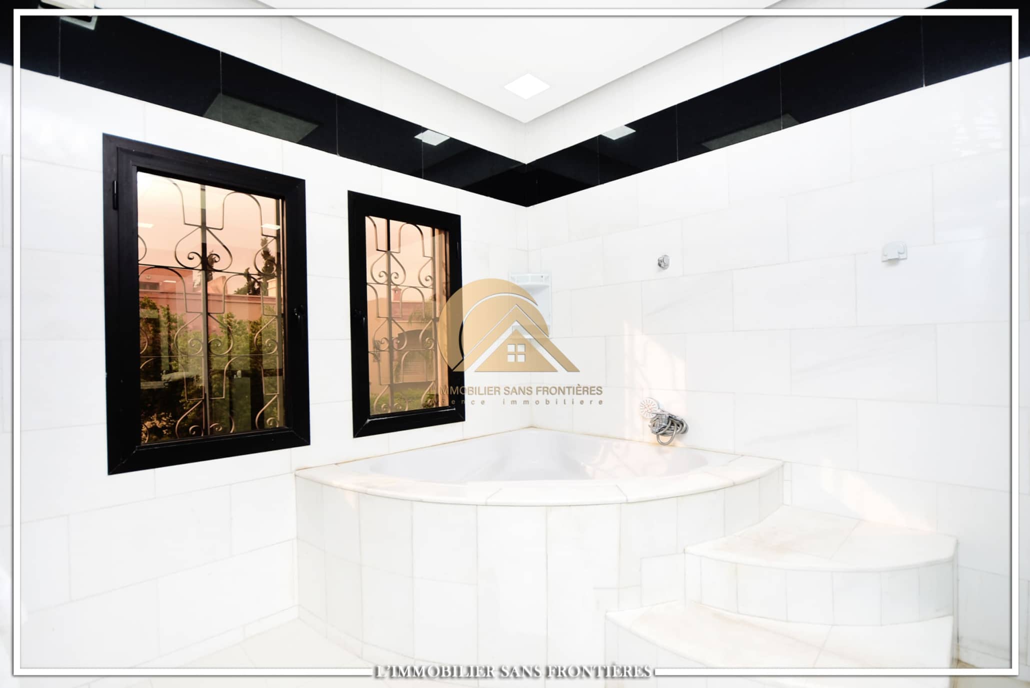 Real Estate Without Borders offers this furnished villa for rent in Targa, Marrakech, close to the mentioned daily amenities (shops, schools and services). The villa is described as bright, with a private pool and landscaped garden, and a construction style inspired by an American model.