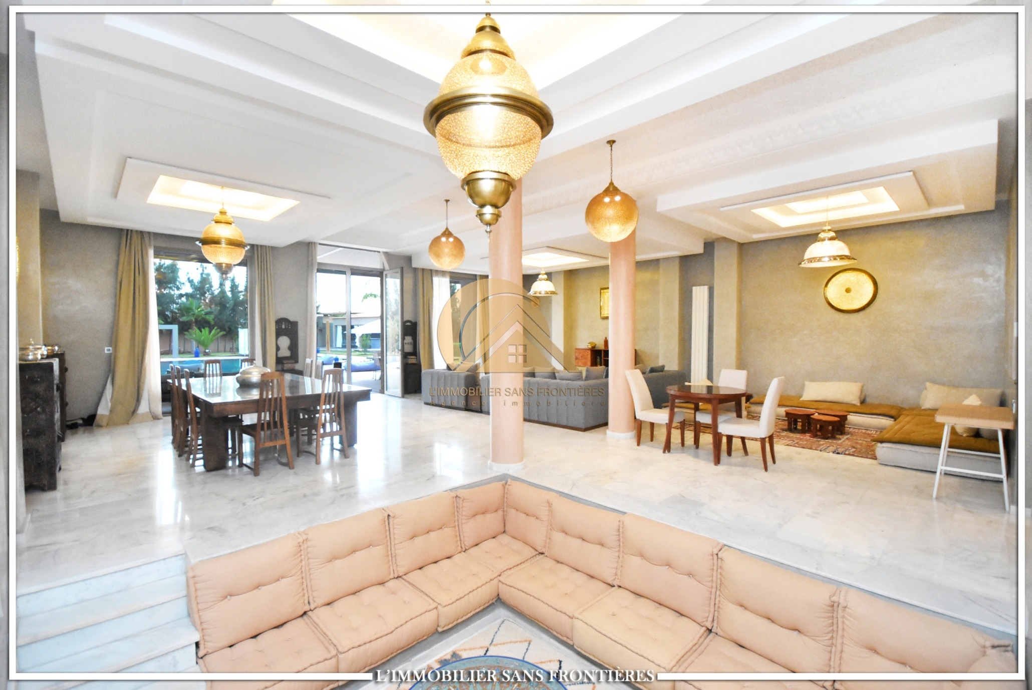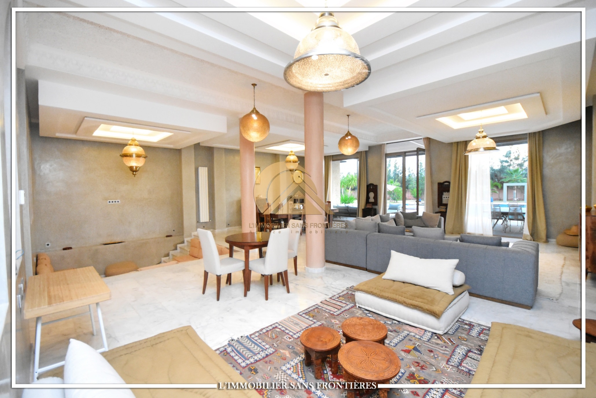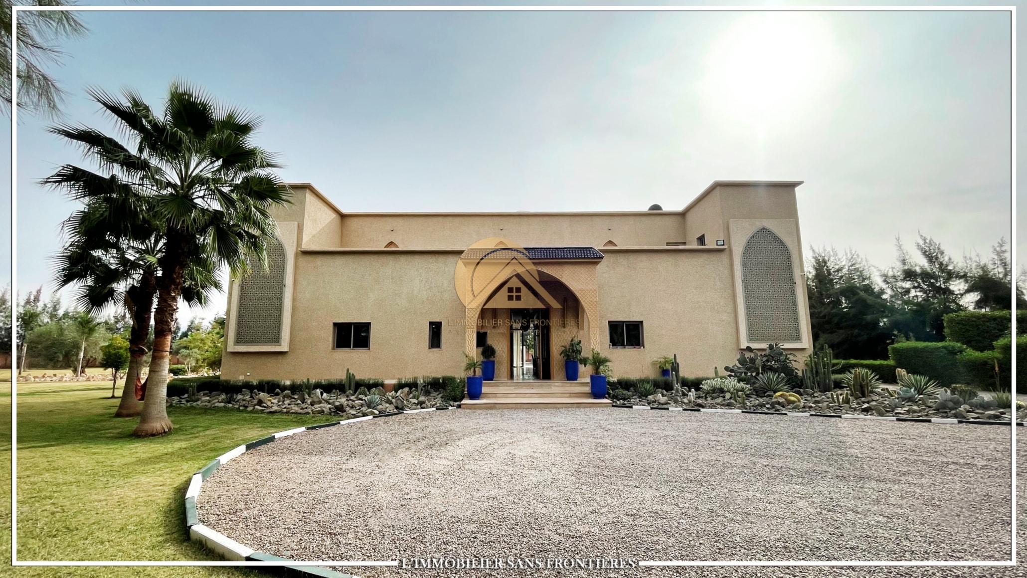 Real Estate Without Borders offers for sale this private furnished villa on Ouarzazate Road, 13 km from Marrakech. The stated land area is 7,500 m² and the stated living area is 600 m².