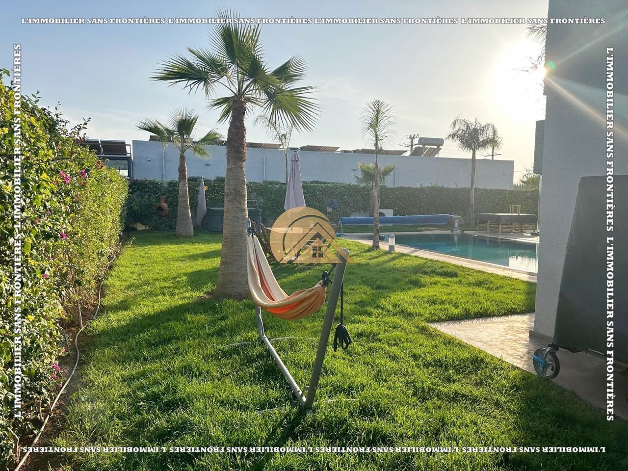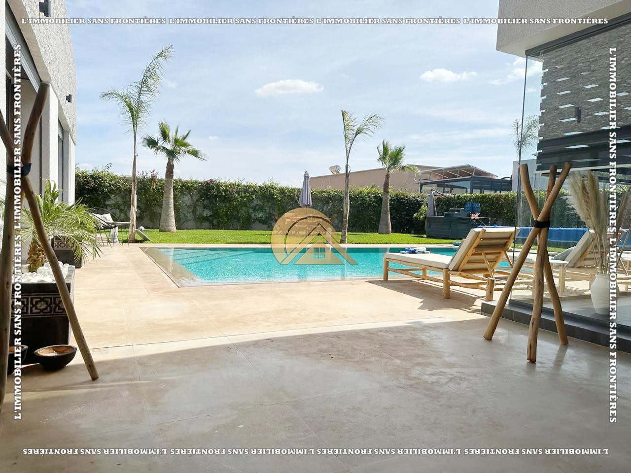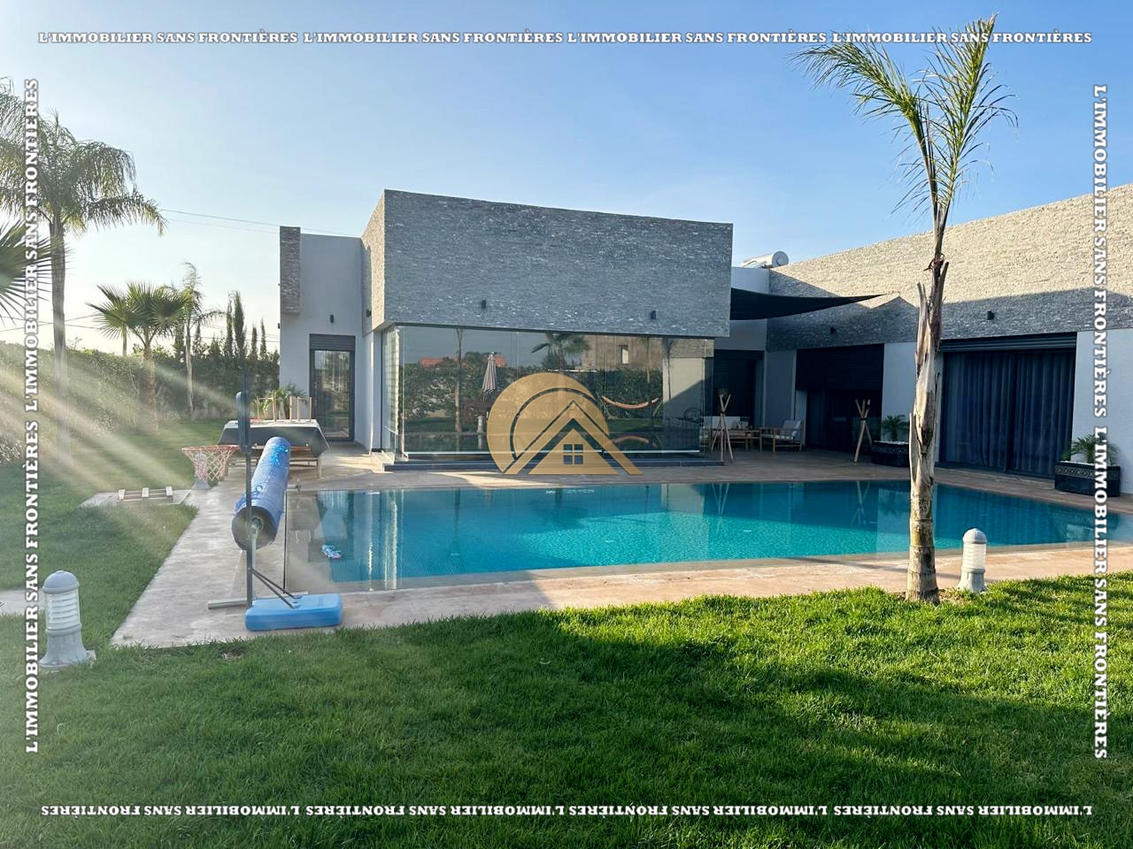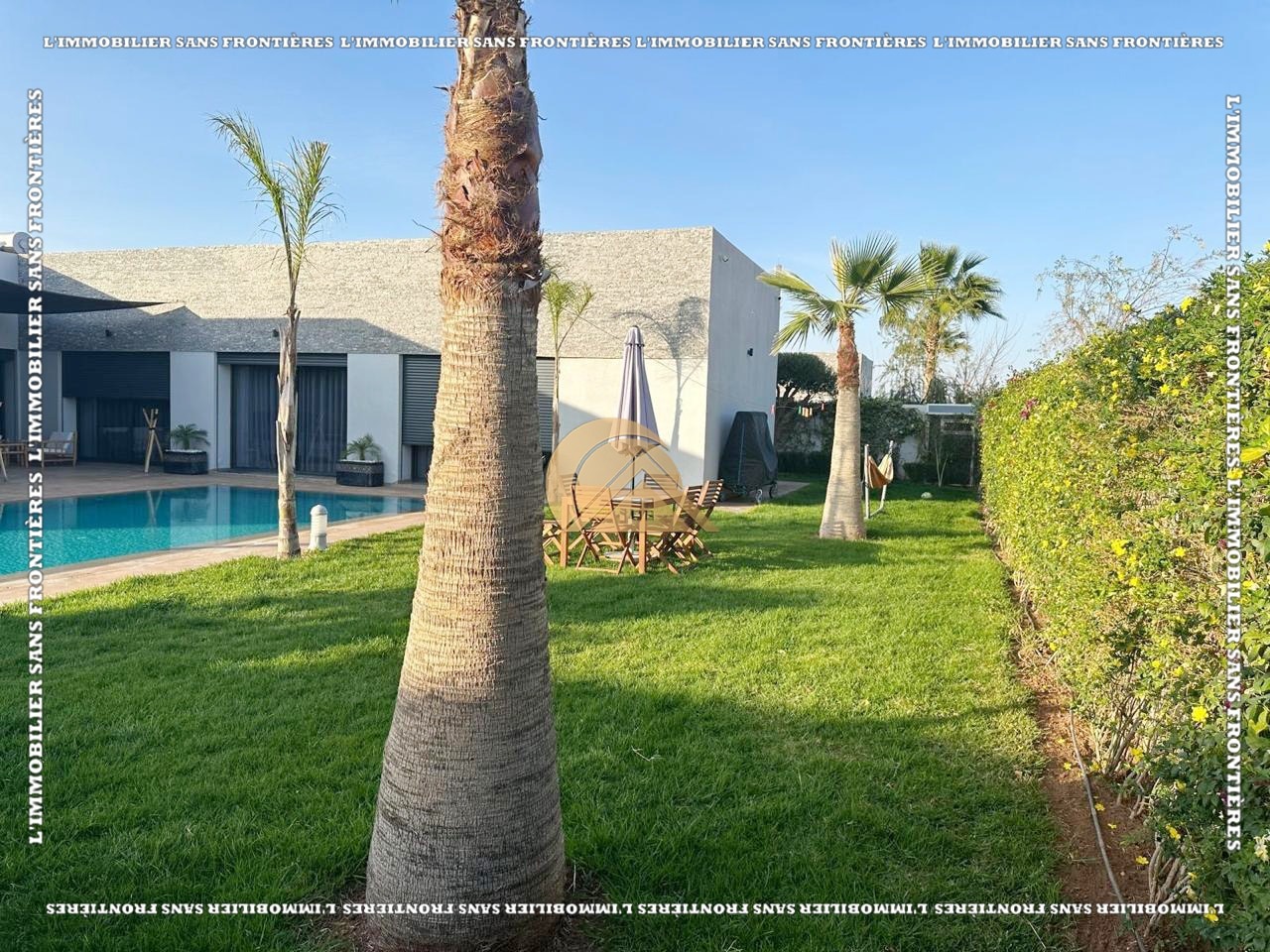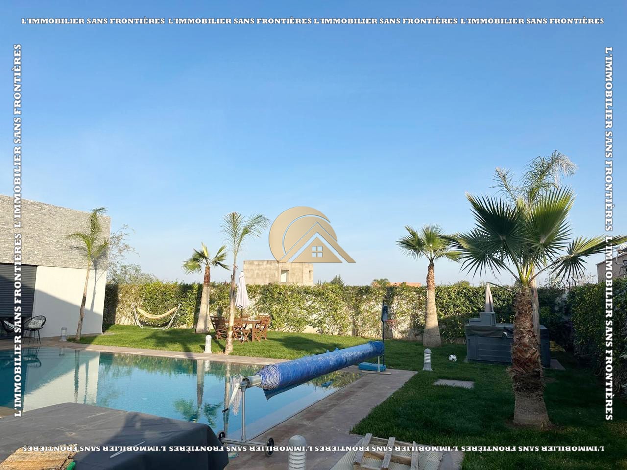 Real Estate Without Borders offers for sale this modern furnished villa on Ouarzazate Road km 16, Marrakech. The stated living area is 300 m² on a 1,100 m² plot. The text mentions a heated pool (11 x 6 m), 2 jacuzzis, and a steam hammam.