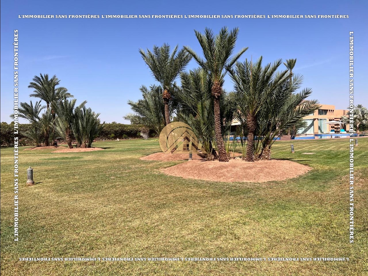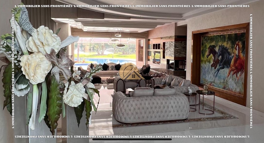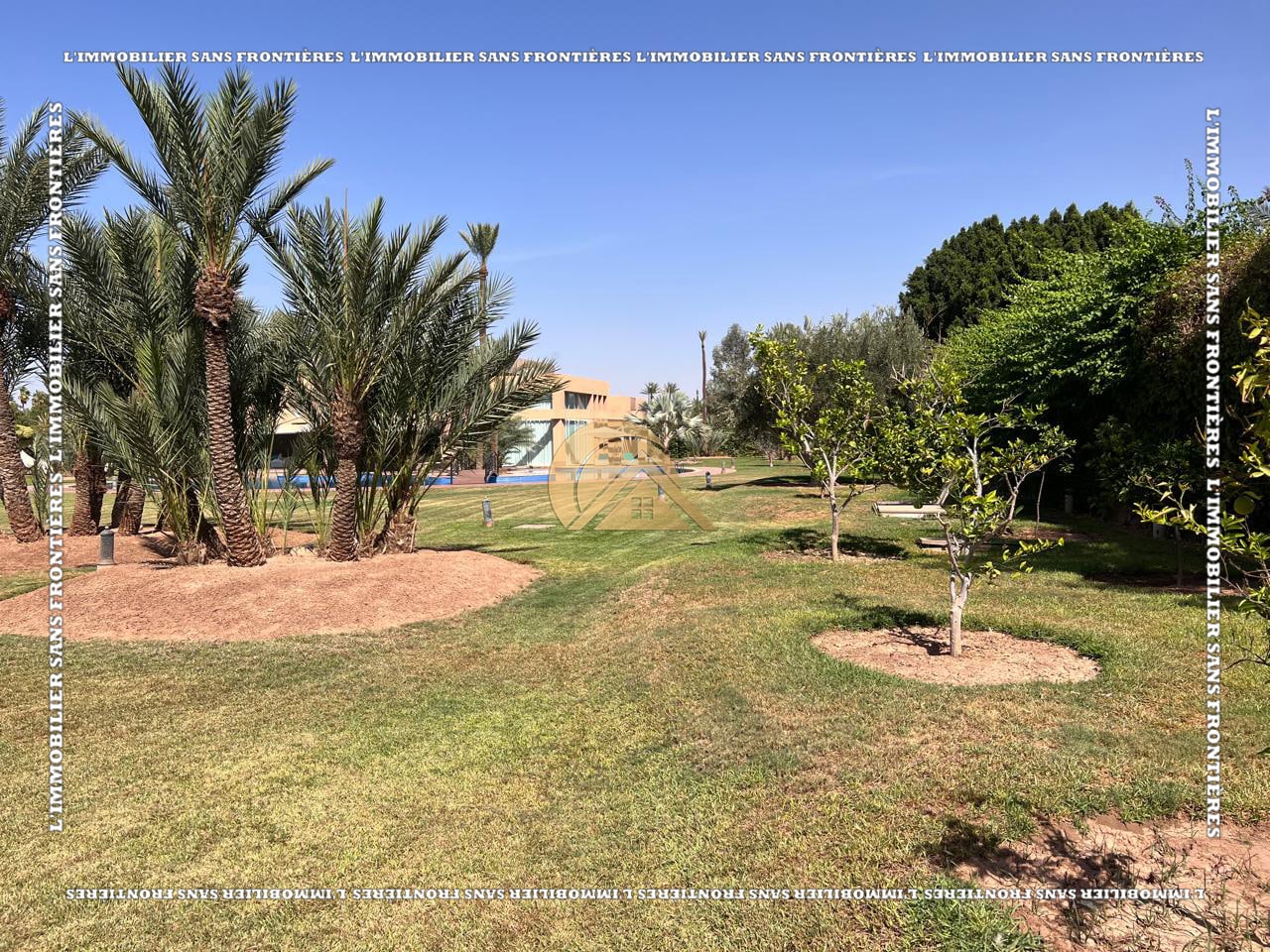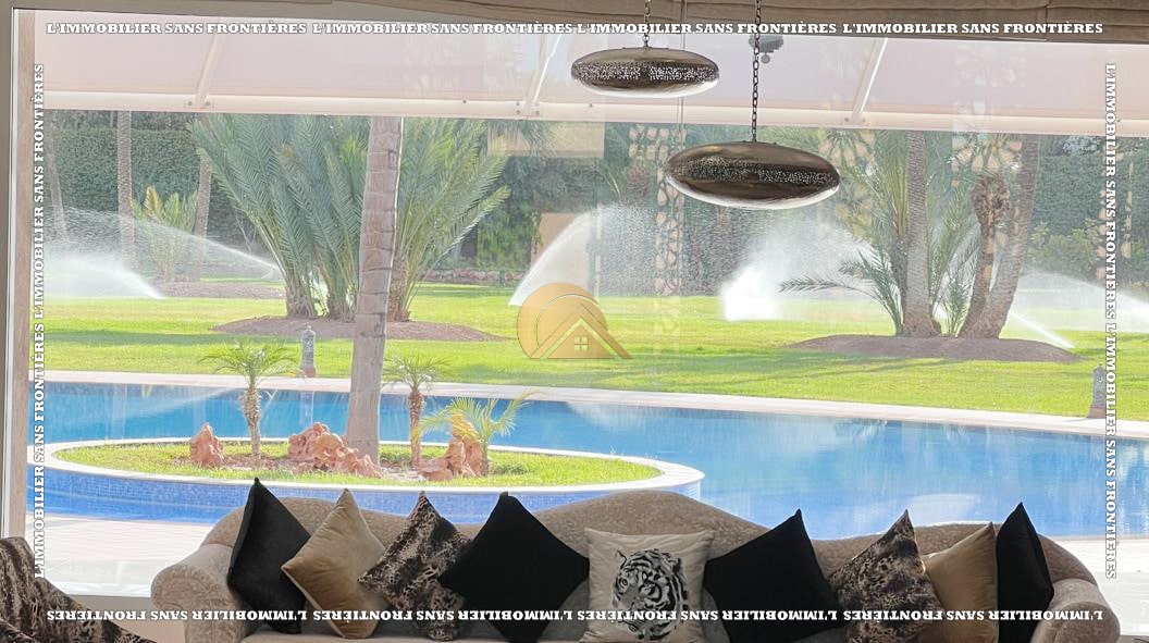 Real Estate Without Borders offers this furnished villa for sale in Palmeraie, Marrakech, on one-hectare land. The text indicates an occupancy permit, generous volumes, a large private garden with automatic irrigation, and a 500 m² pool (32 m x 16 m).