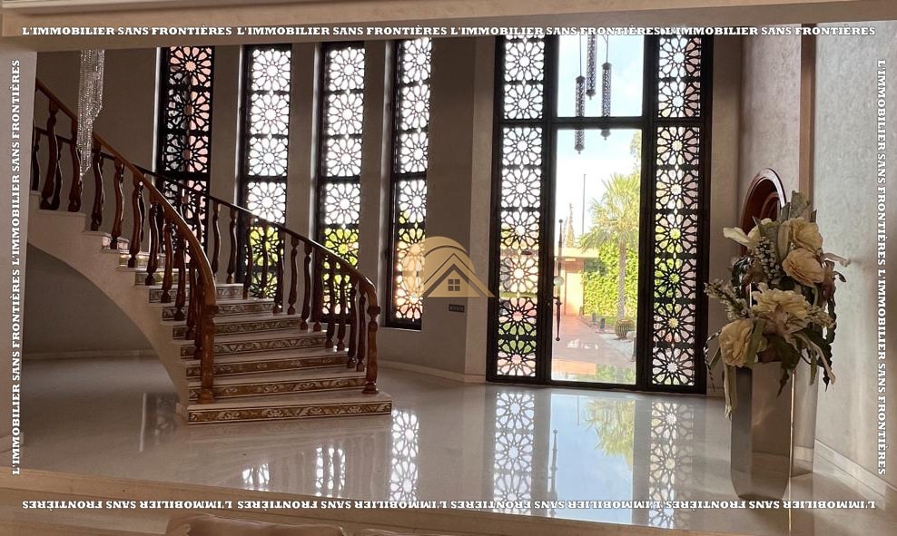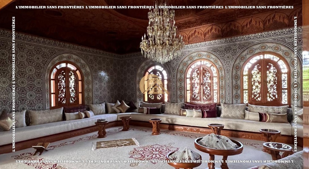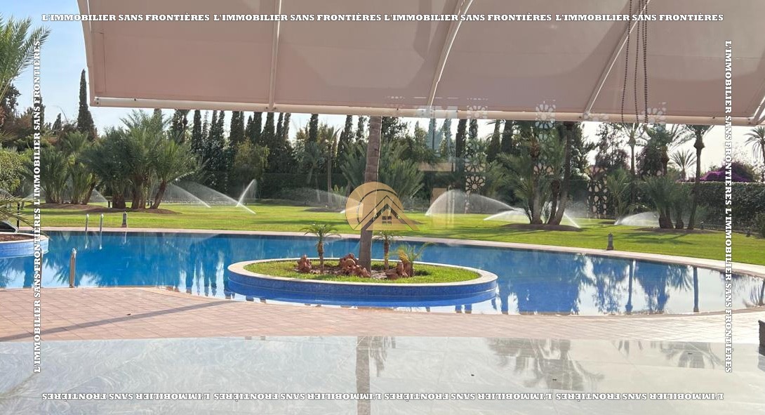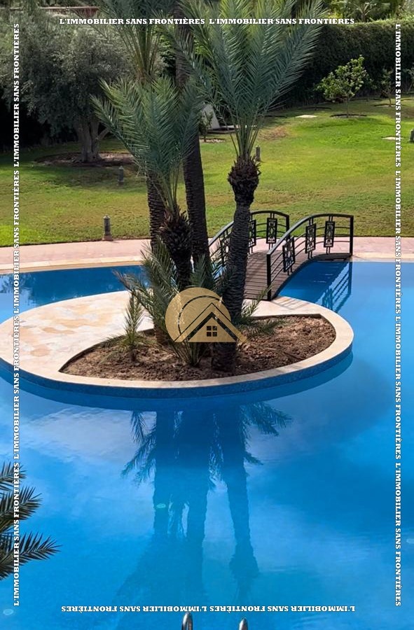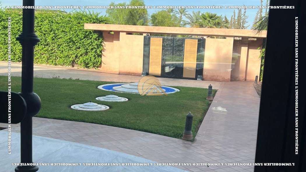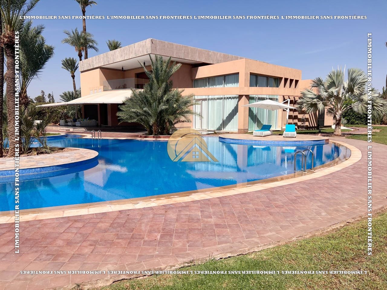 Real Estate Without Borders offers this furnished villa for sale in Palmeraie, Marrakech, on one-hectare land. The text indicates an occupancy permit, generous volumes, a large private garden with automatic irrigation, and a 500 m² pool (32 m x 16 m).