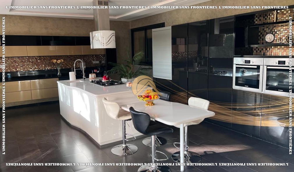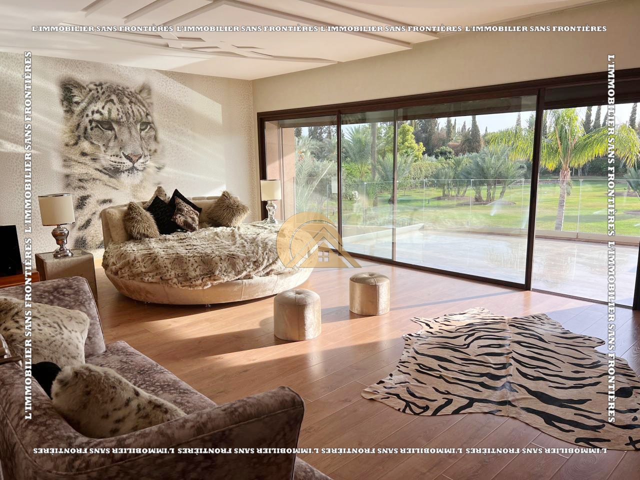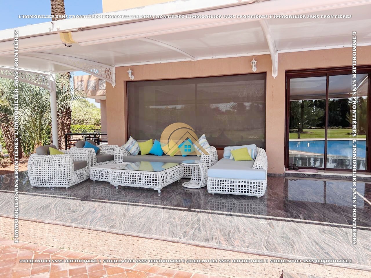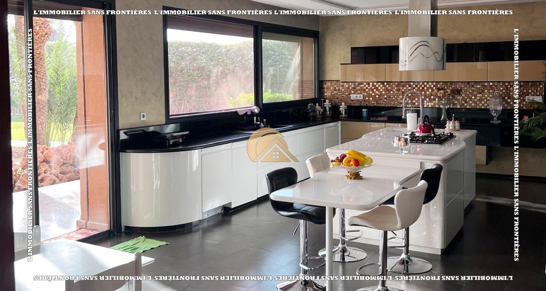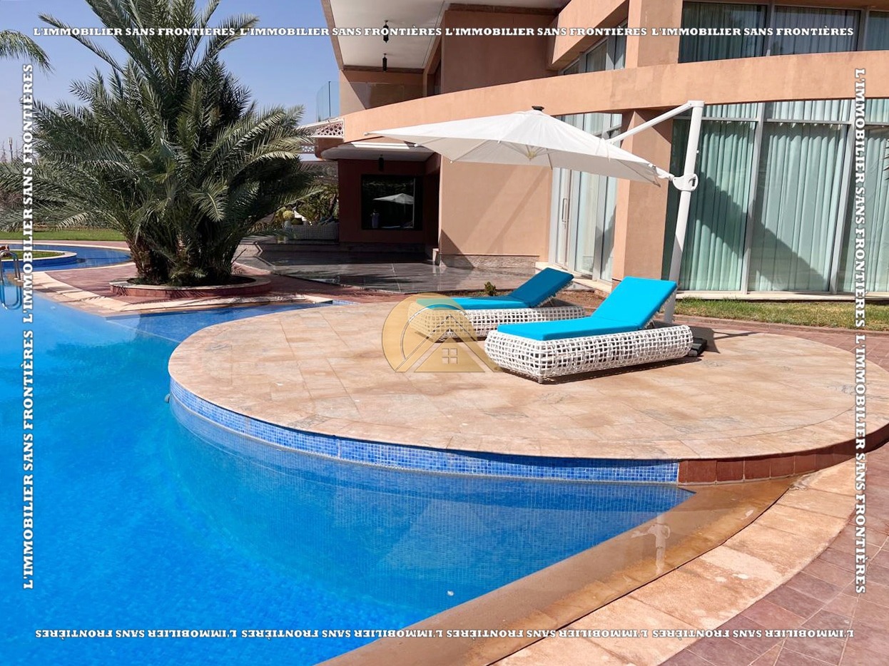 Real Estate Without Borders offers this furnished villa for sale in Palmeraie, Marrakech, on one-hectare land. The text indicates an occupancy permit, generous volumes, a large private garden with automatic irrigation, and a 500 m² pool (32 m x 16 m).