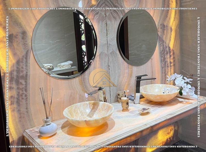 Ground floor (650 m²): 4 European living rooms with bay windows and fireplace – Moroccan living room – Spacious sitting area – Guest washbasin toilet – Fully equipped kitchen with terrace access – Large terraces overlooking the pool – Central terrace in the middle of the pool