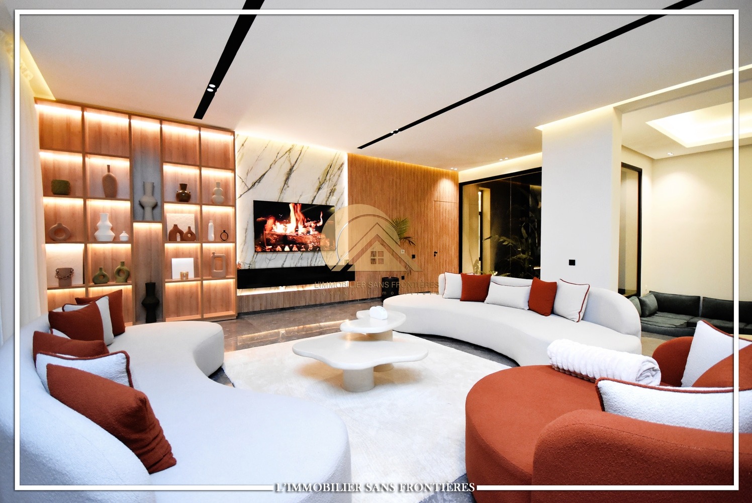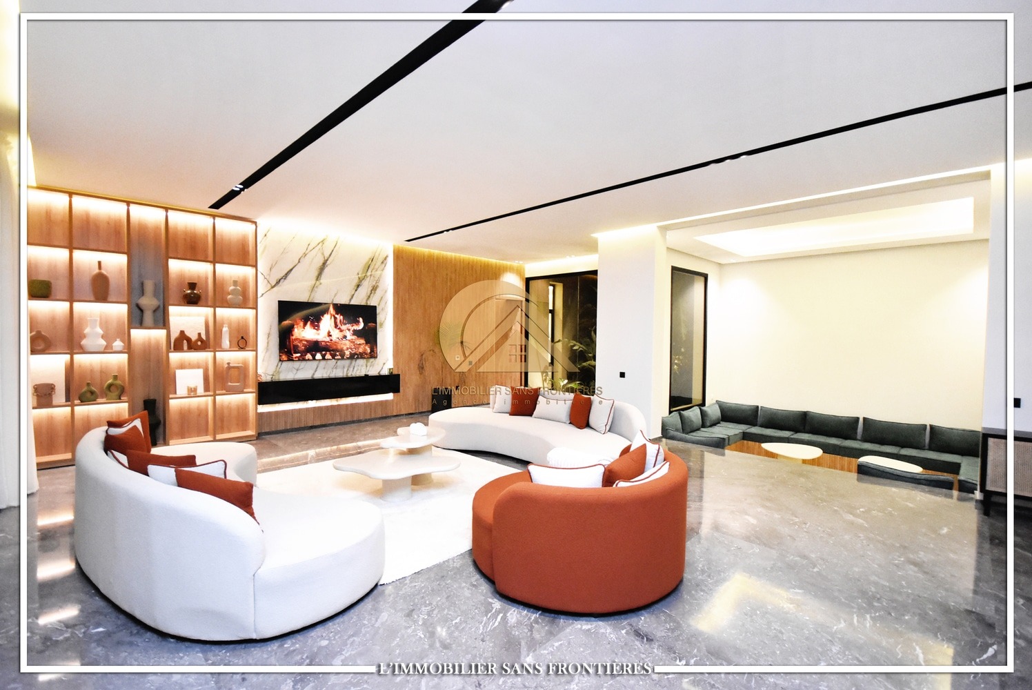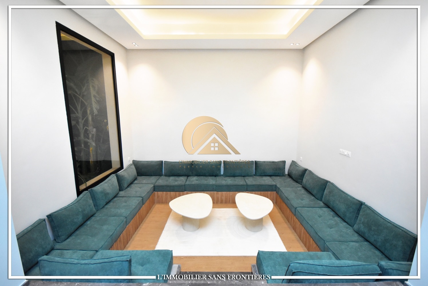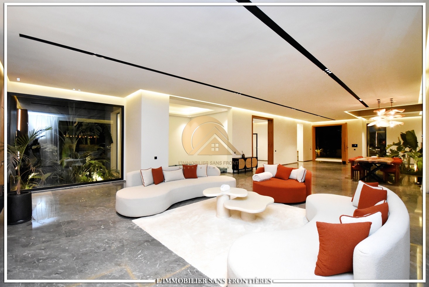 Moroccan living room – European living room – sitting area – 4 suites with bathrooms, dressings and A/C – kitchen – laundry area – guest toilets – terrace – bay window