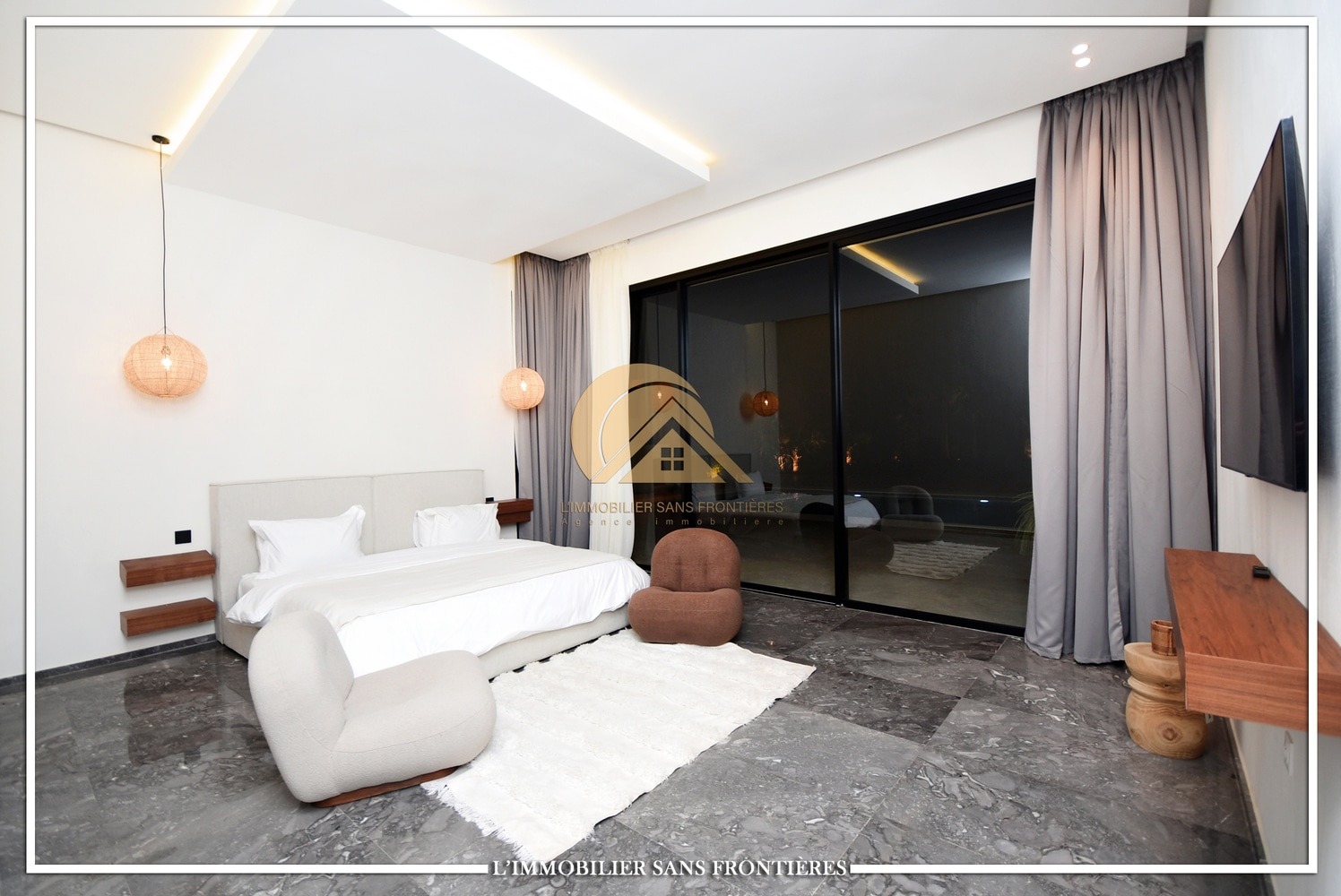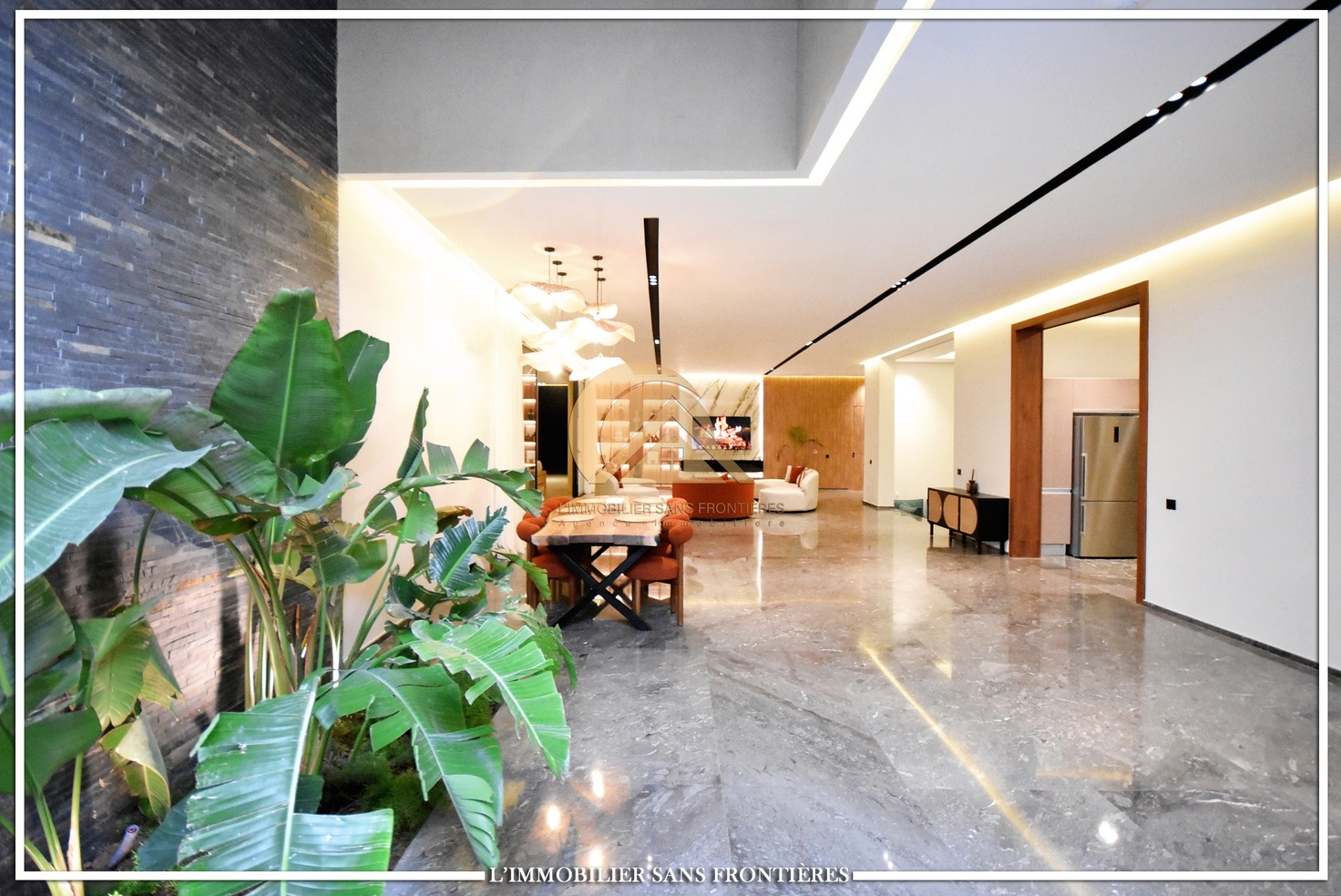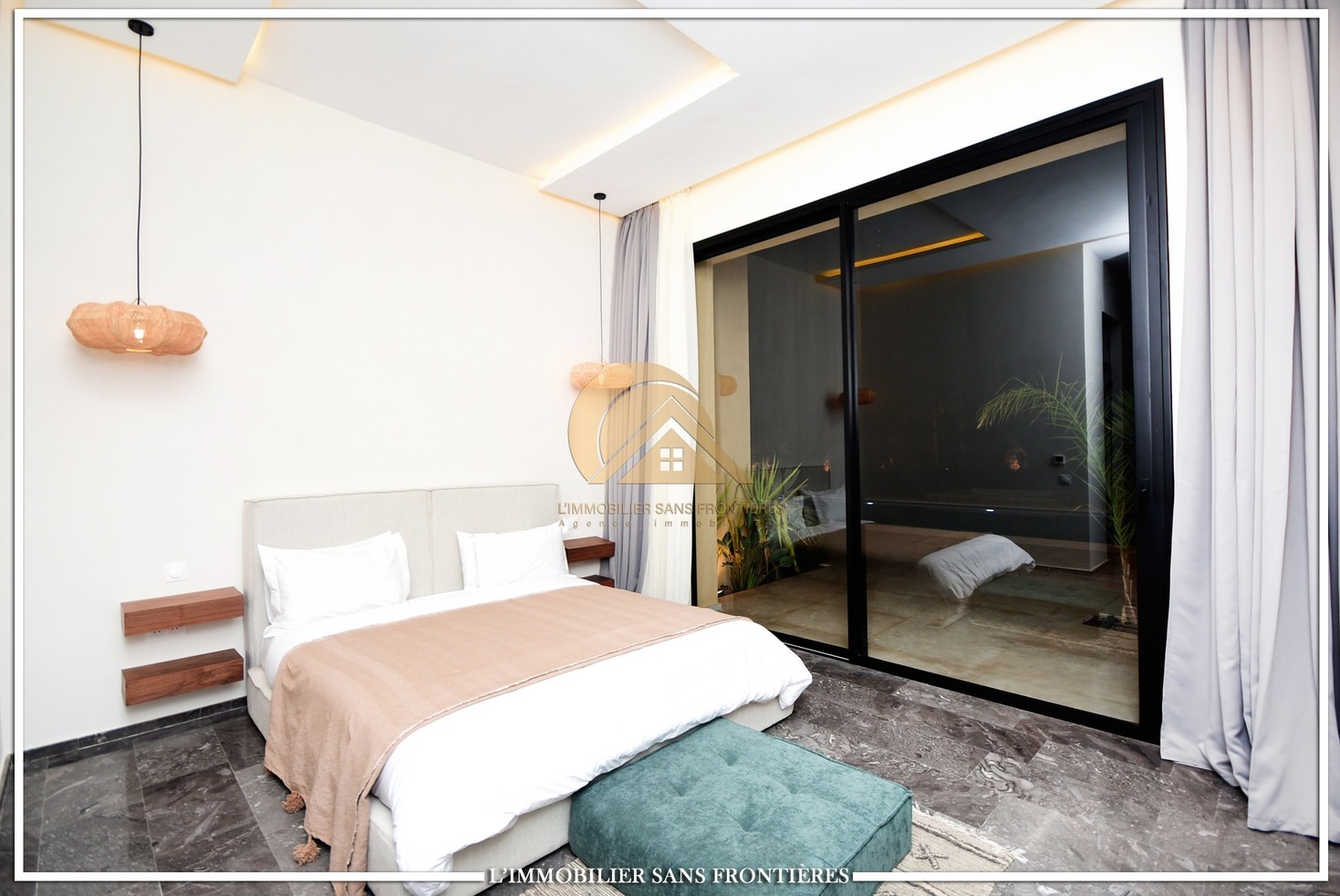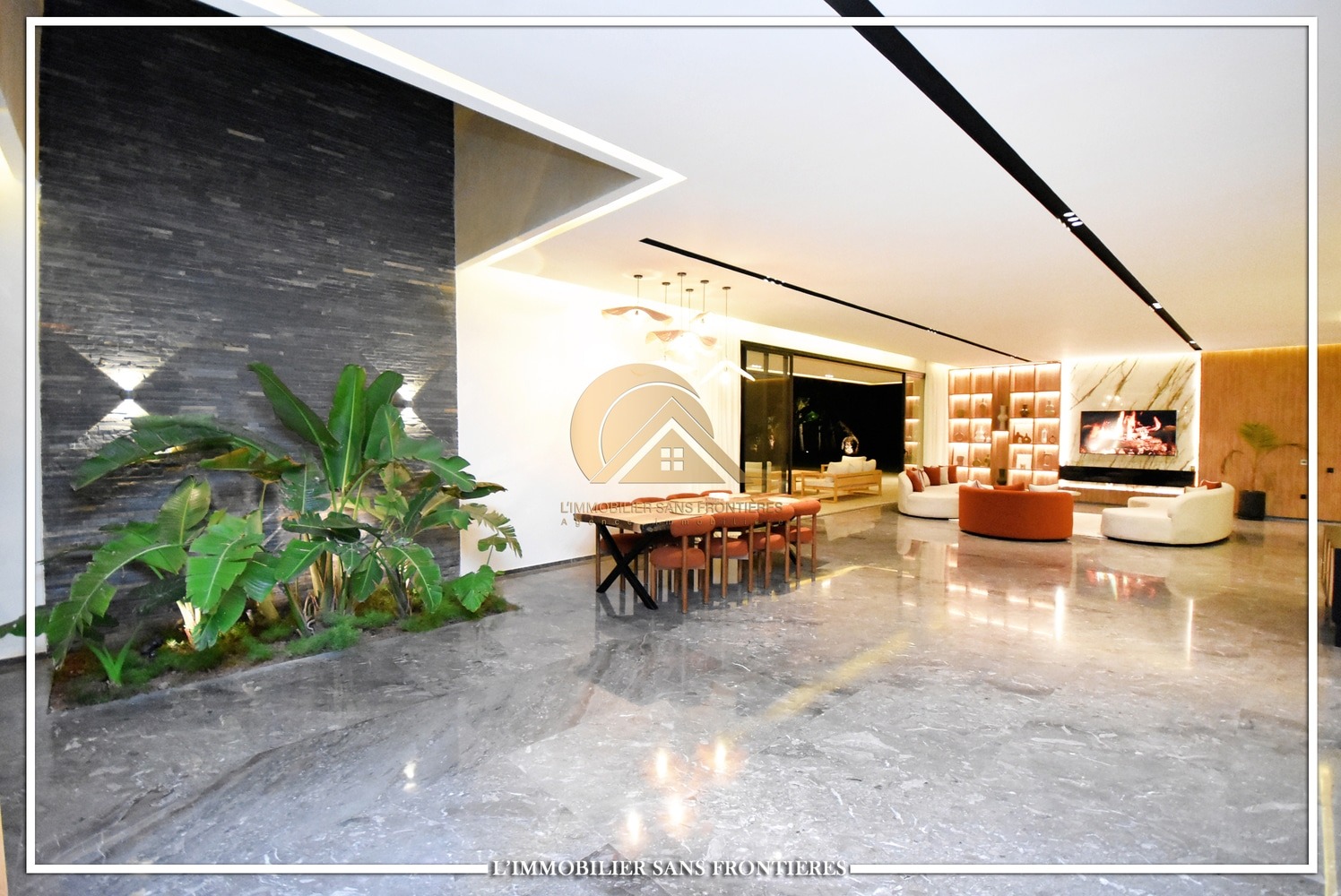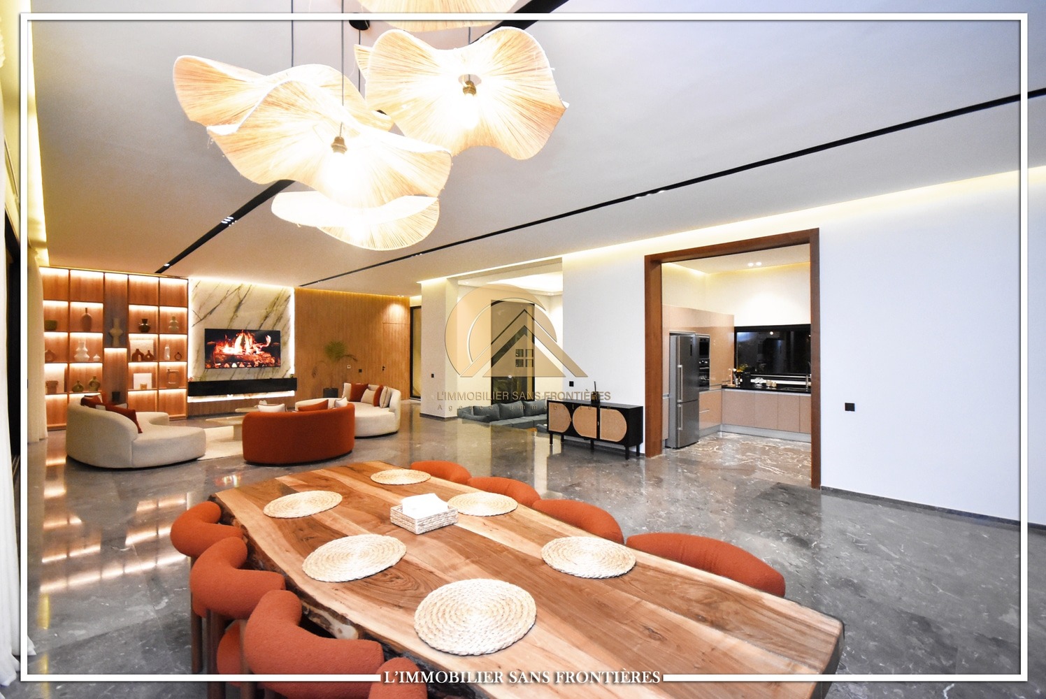 Moroccan living room – European living room – sitting area – 4 suites with bathrooms, dressings and A/C – kitchen – laundry area – guest toilets – terrace – bay window