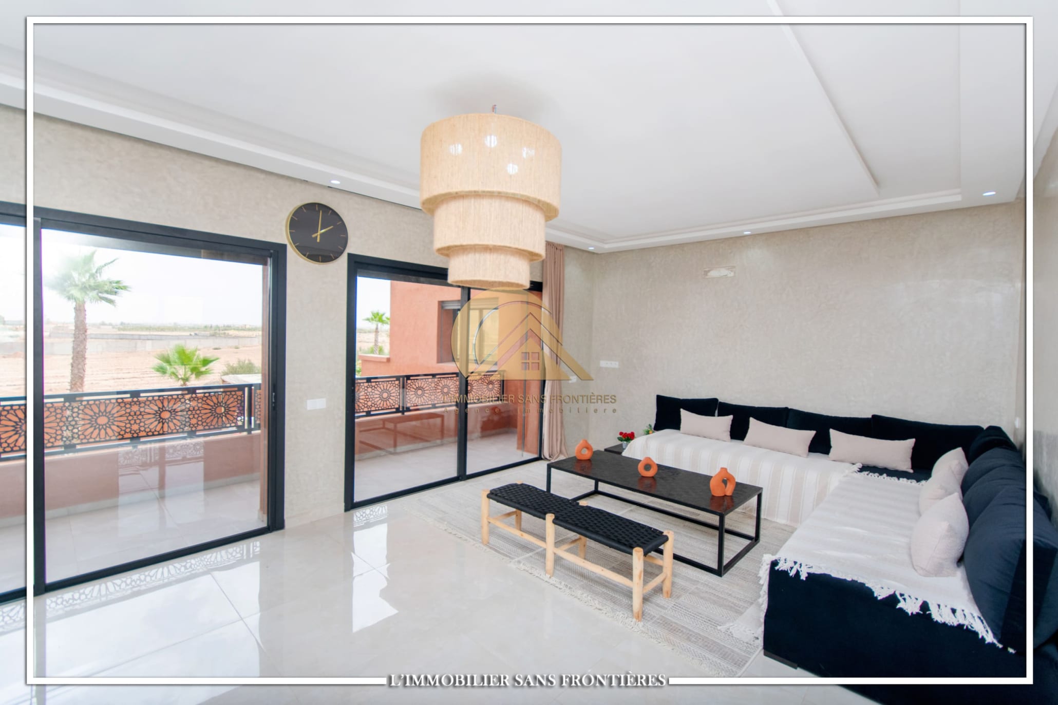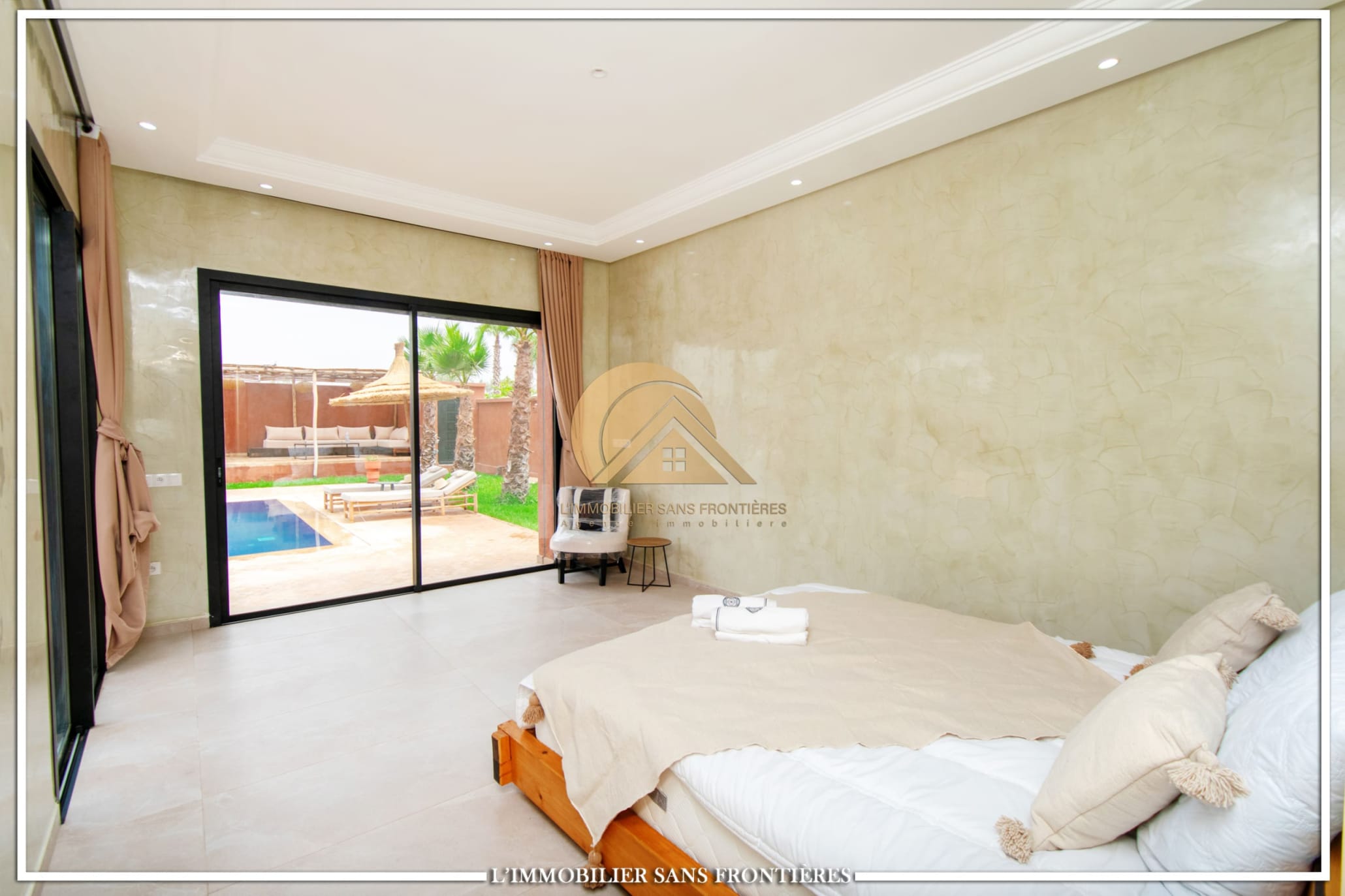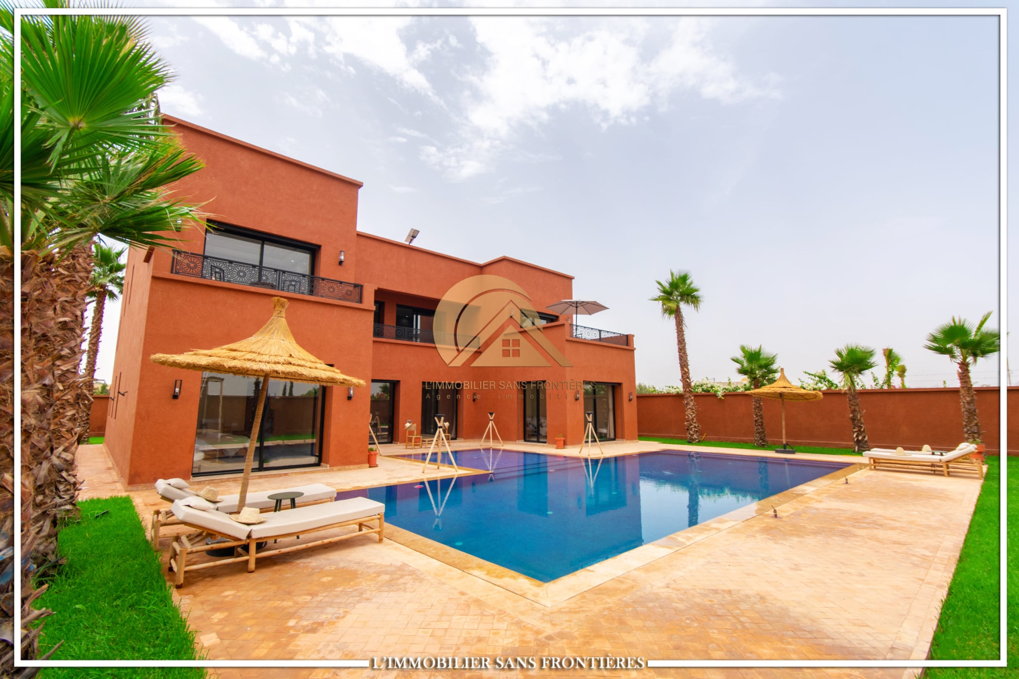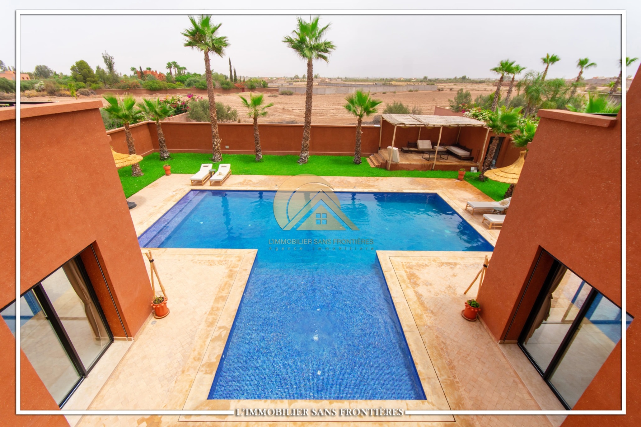 Real Estate Without Borders offers this furnished villa for sale on Route de l’Ourika km 17, Marrakech, with access via a 1 km track. The villa is described as modern, with a pool and landscaped private gardens, and panoramic mountain views.