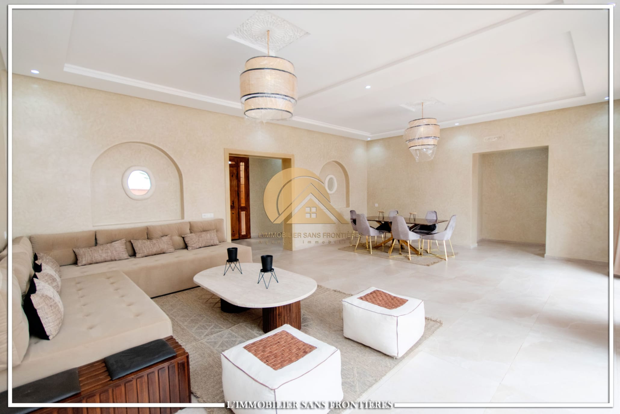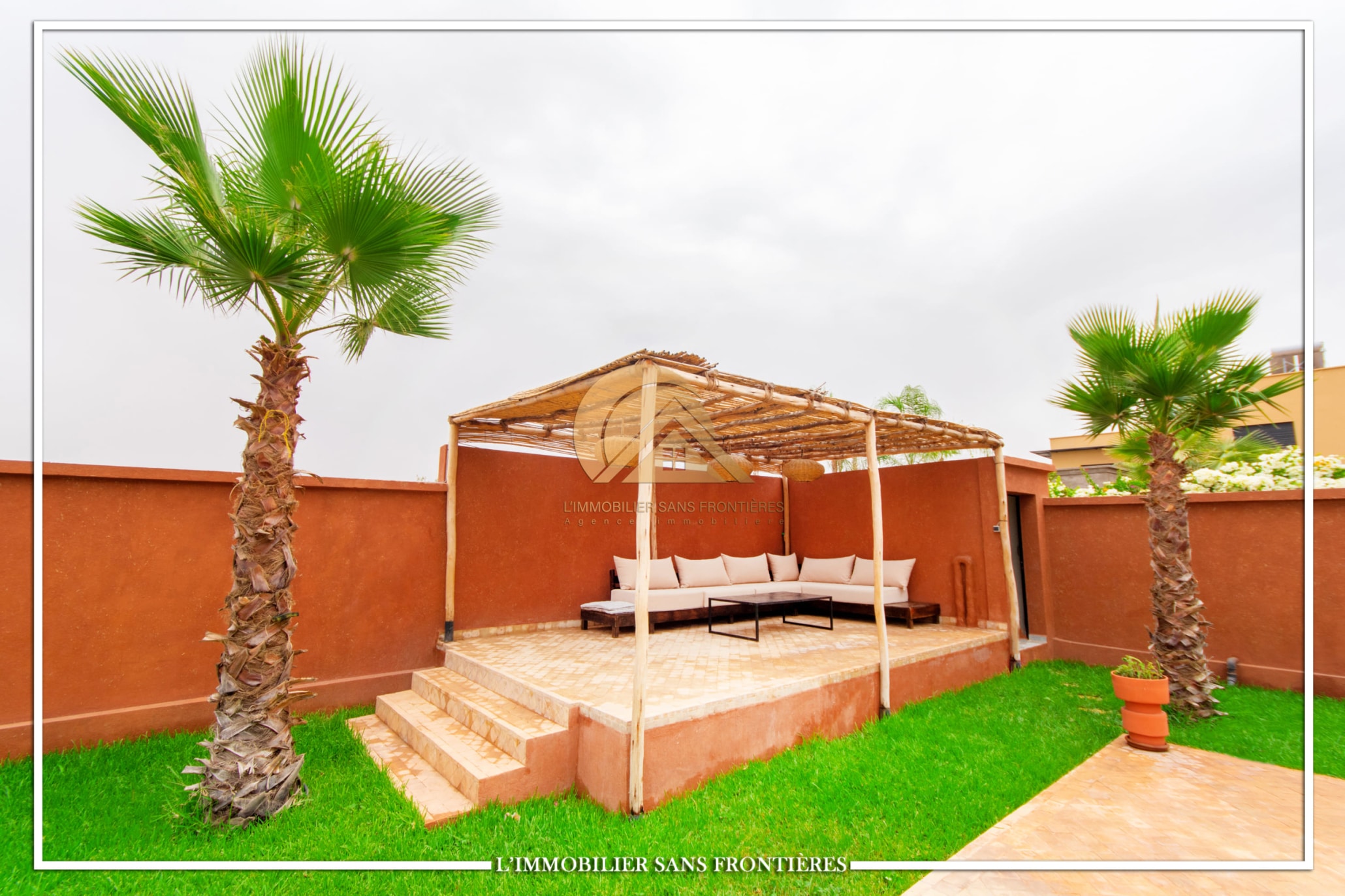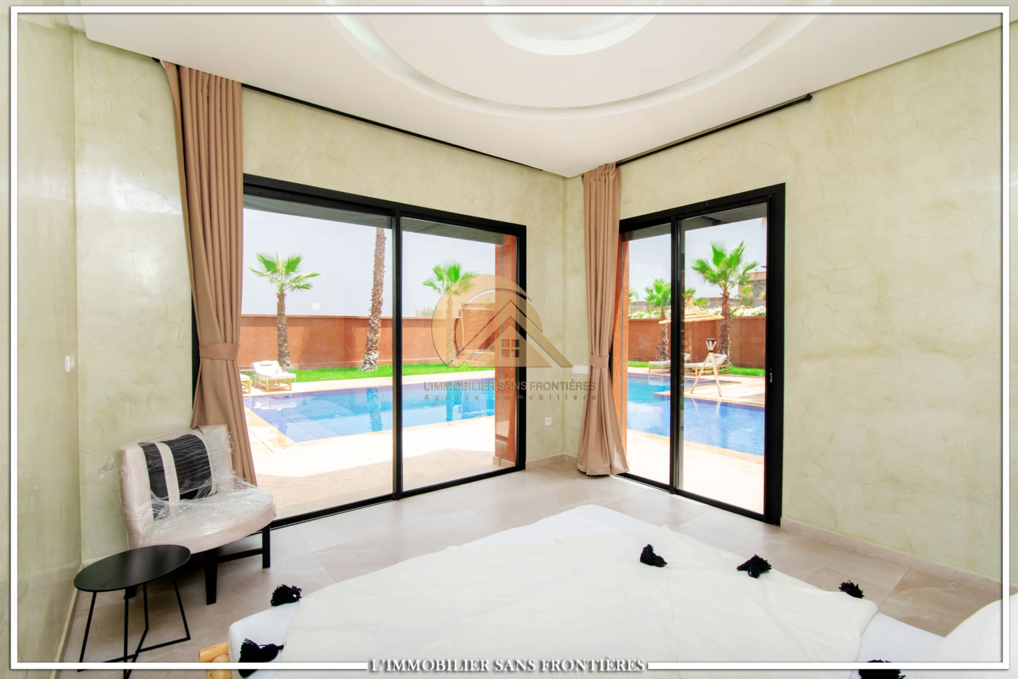 Real Estate Without Borders offers this furnished villa for sale on Route de l’Ourika km 17, Marrakech, with access via a 1 km track. The villa is described as modern, with a pool and landscaped private gardens, and panoramic mountain views.
