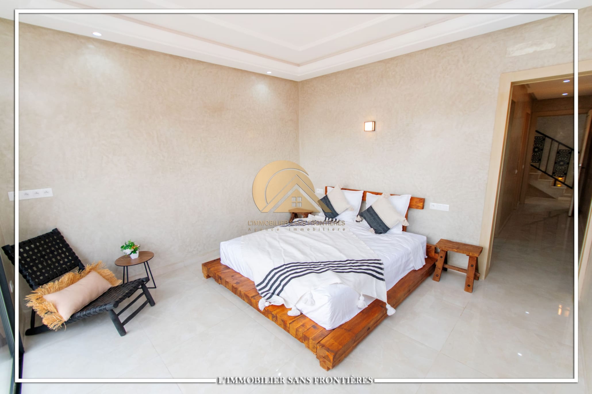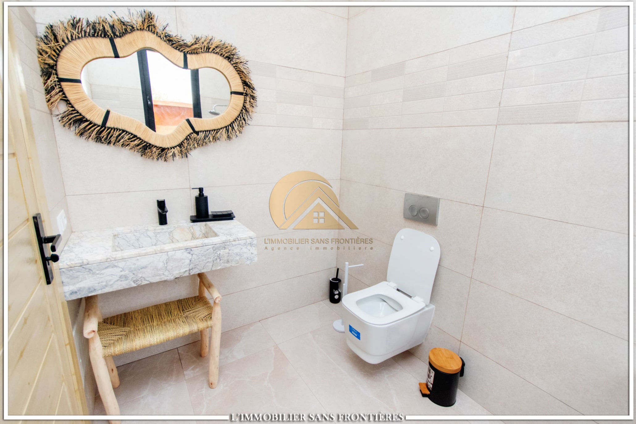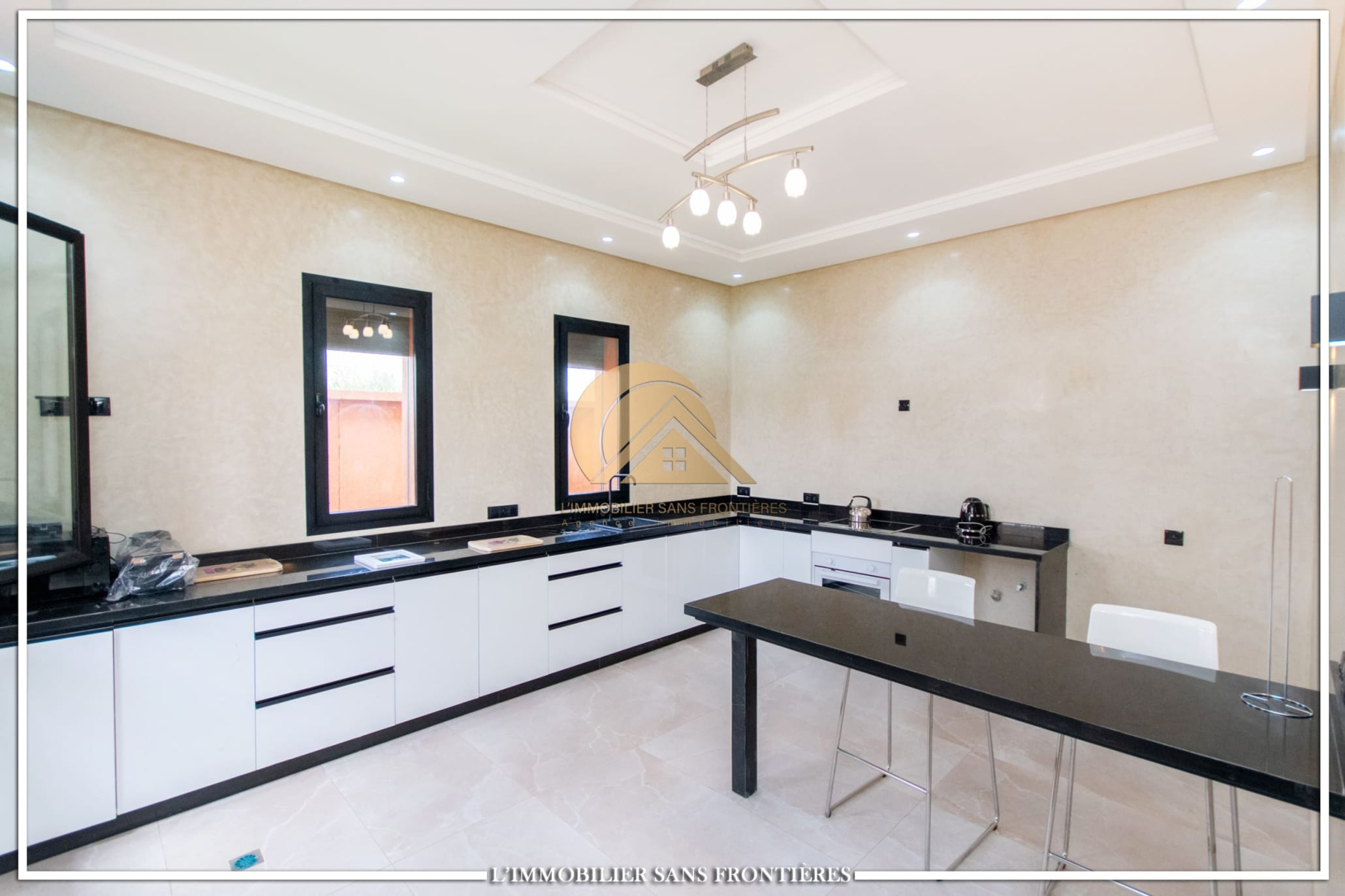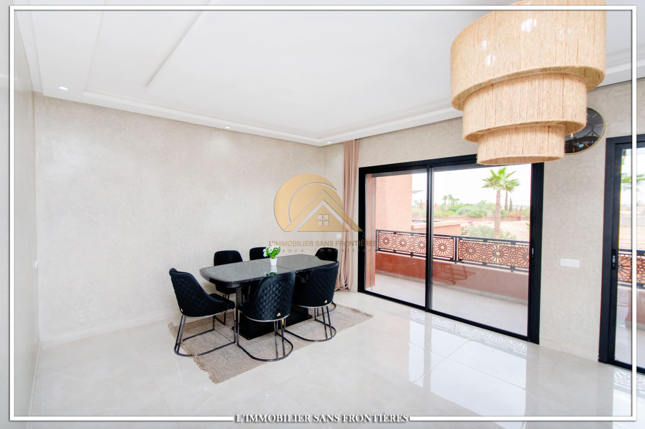 Real Estate Without Borders offers this furnished villa for sale on Route de l’Ourika km 17, Marrakech, with access via a 1 km track. The villa is described as modern, with a pool and landscaped private gardens, and panoramic mountain views.