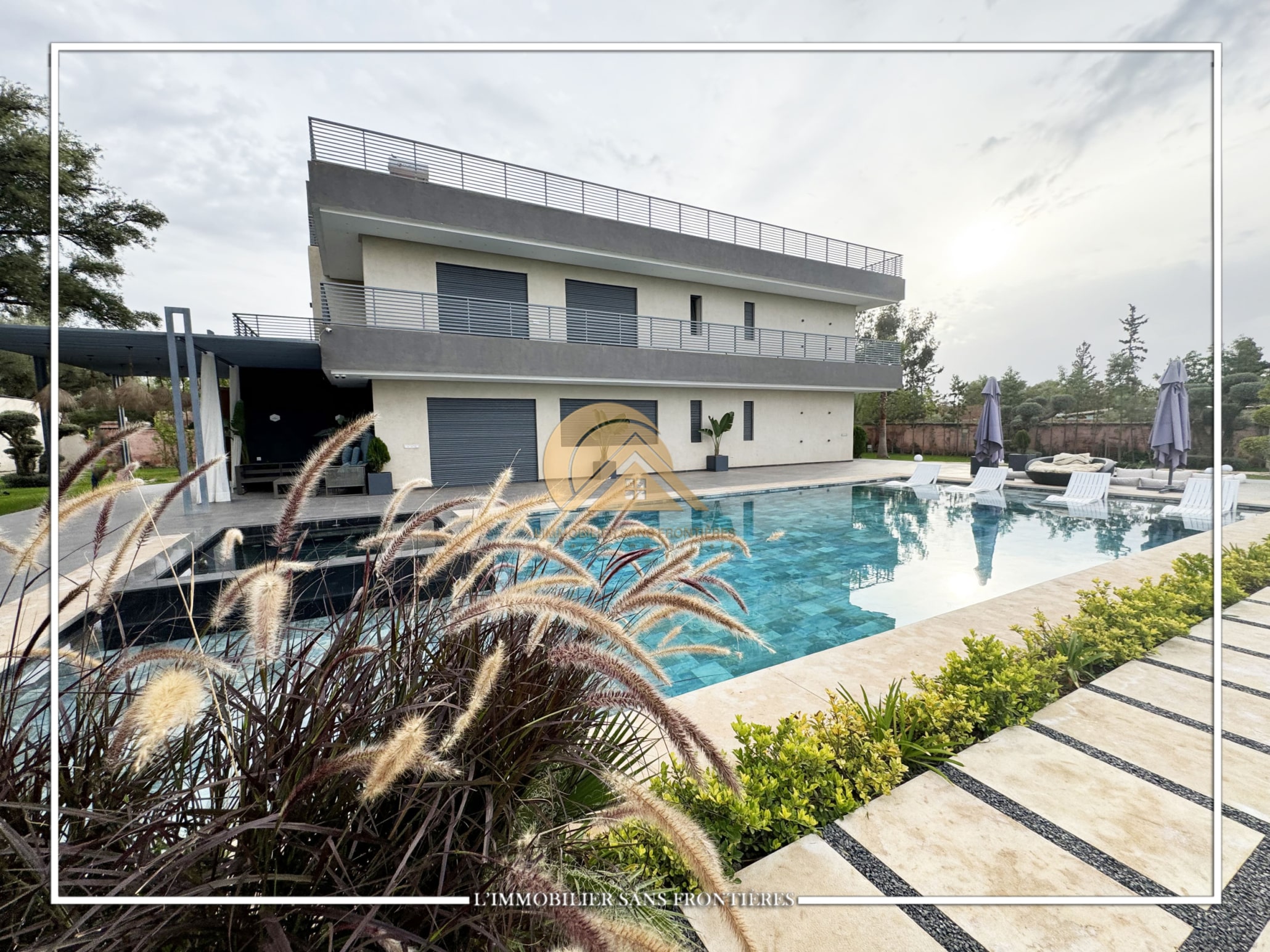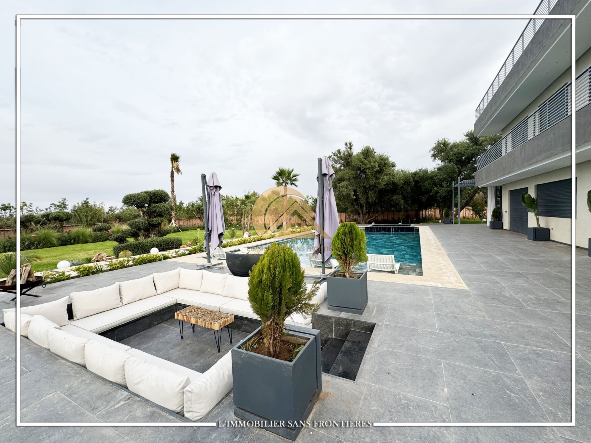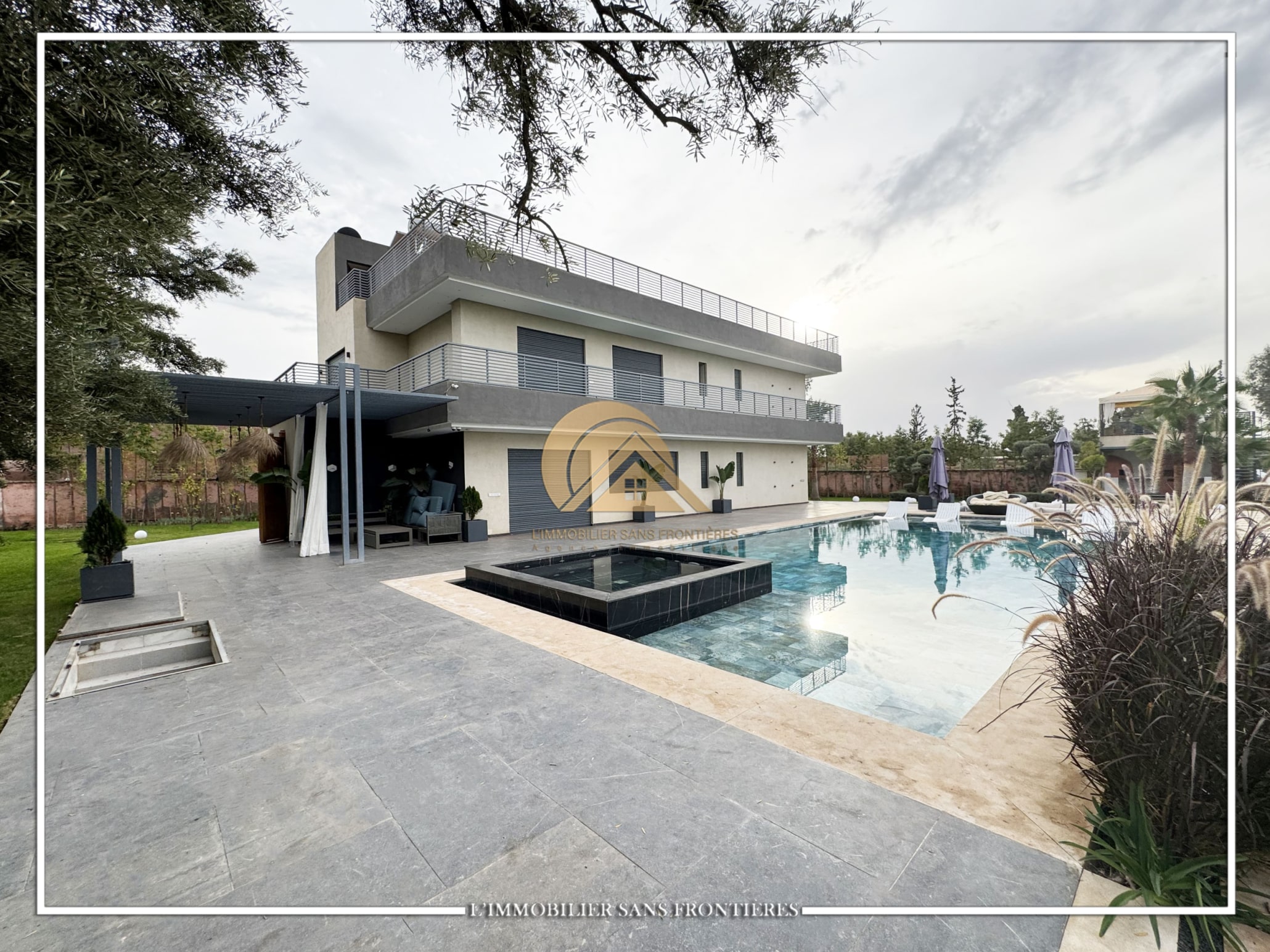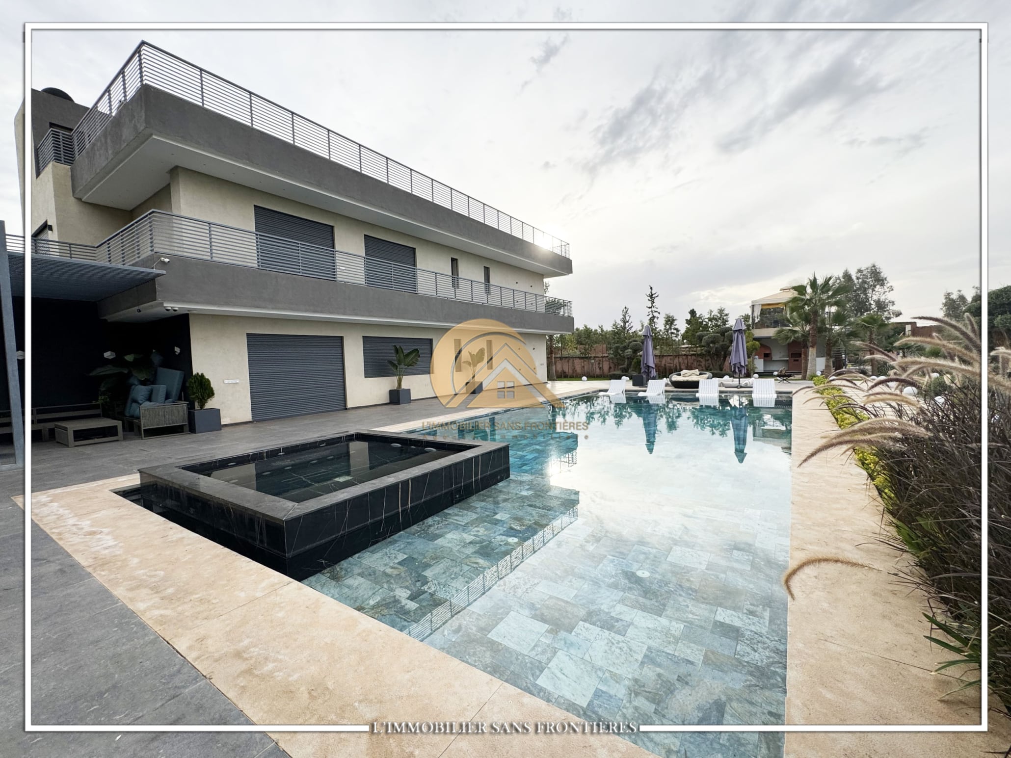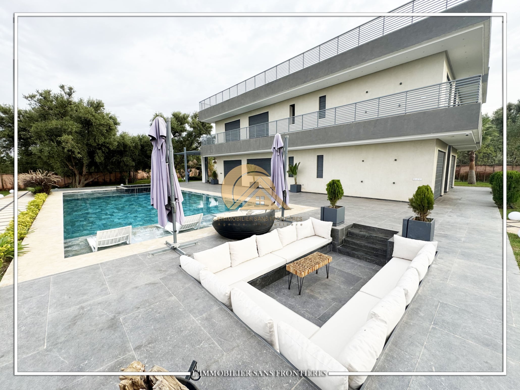 Real Estate Without Borders offers this furnished contemporary villa for sale on Route d’Ourika. The text indicates access via 200 meters of track and 1.5 km from paved road, as well as a large private garden and a private pool. Stated sizes: 3000m² land including 175m² living area.
