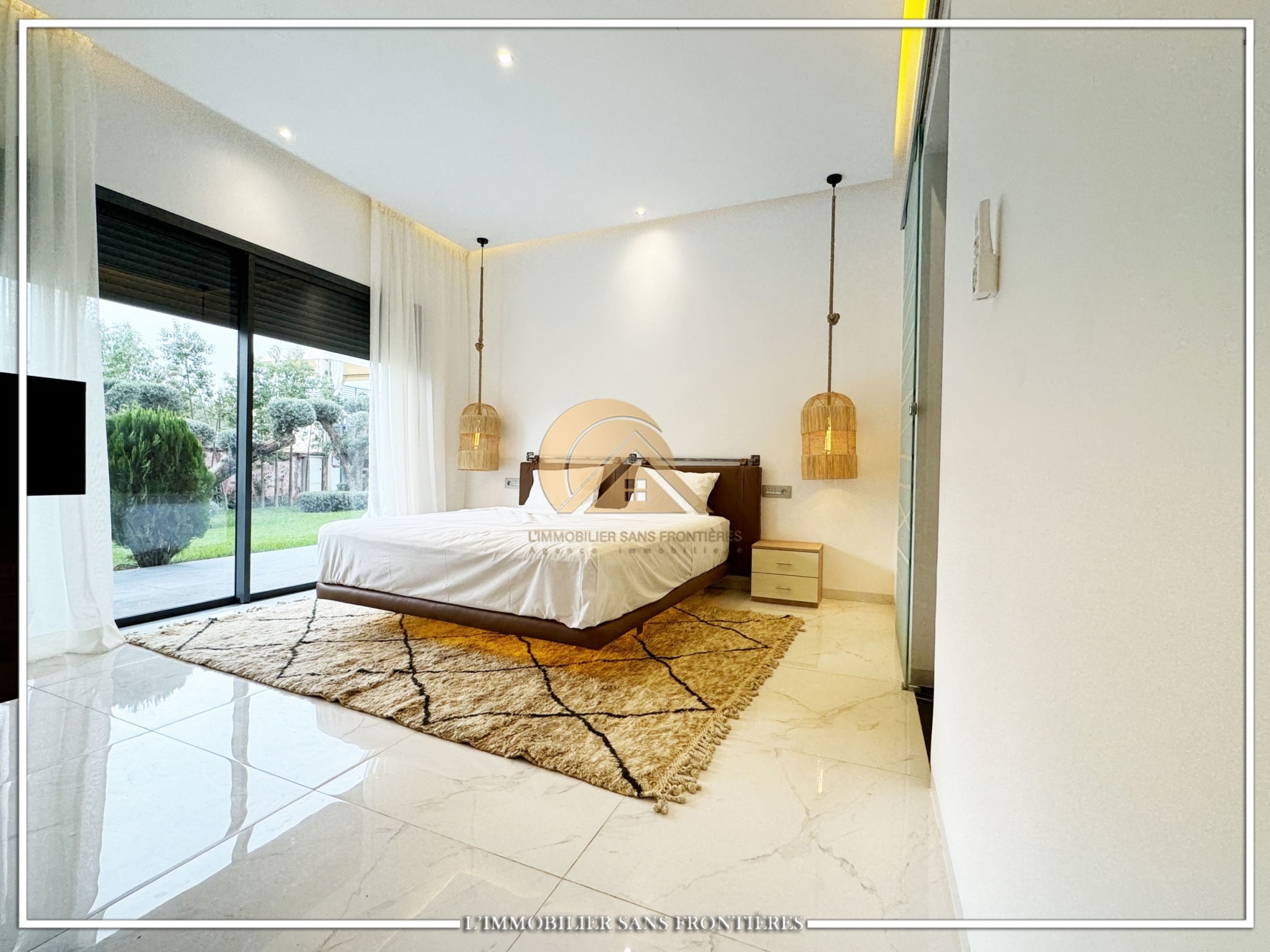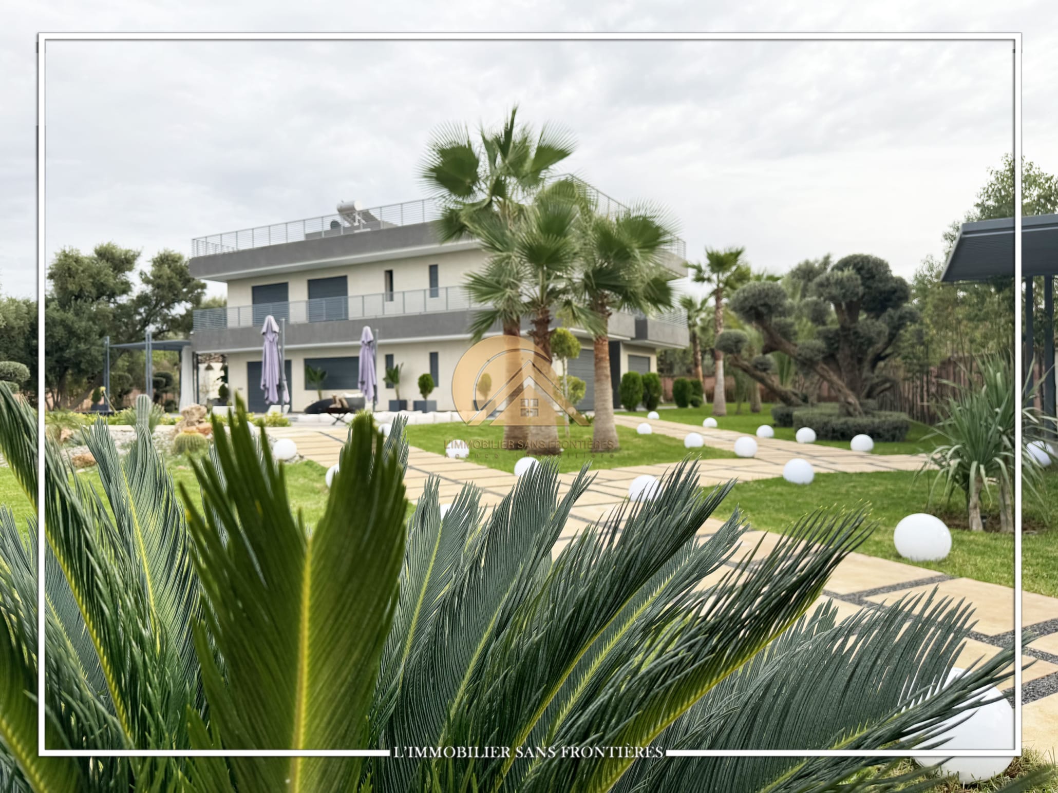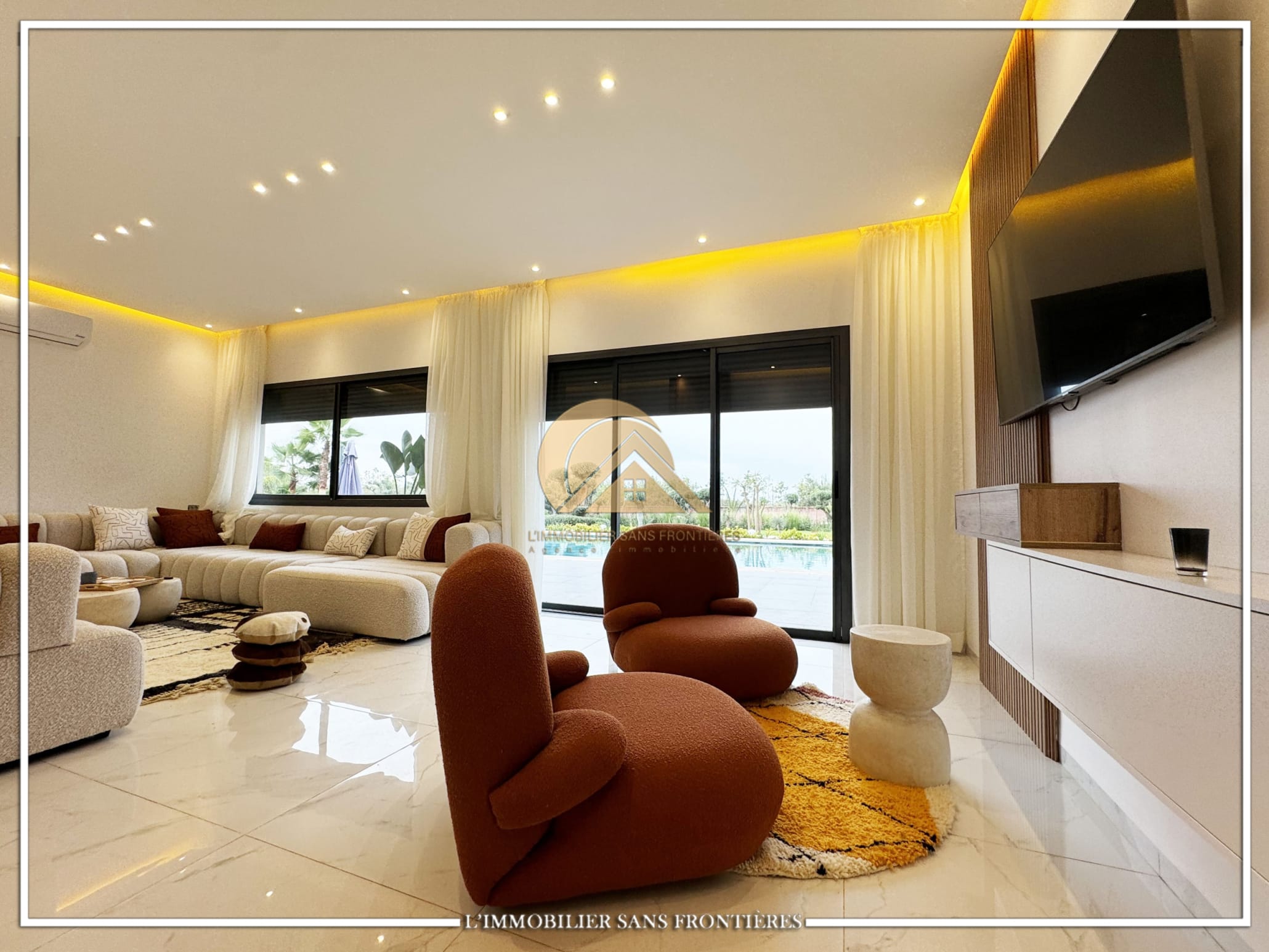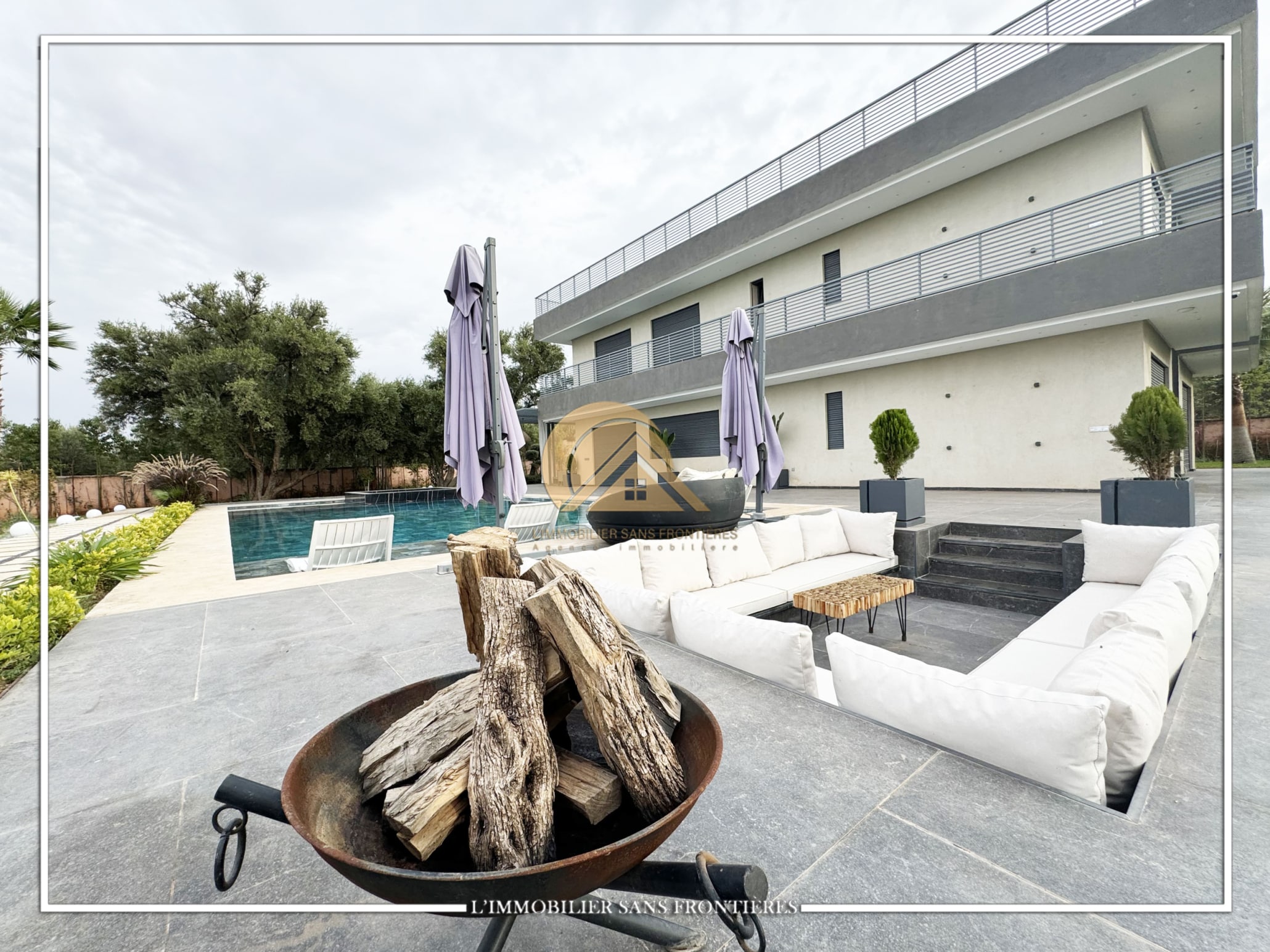 Real Estate Without Borders offers this furnished contemporary villa for sale on Route d’Ourika. The text indicates access via 200 meters of track and 1.5 km from paved road, as well as a large private garden and a private pool. Stated sizes: 3000m² land including 175m² living area.