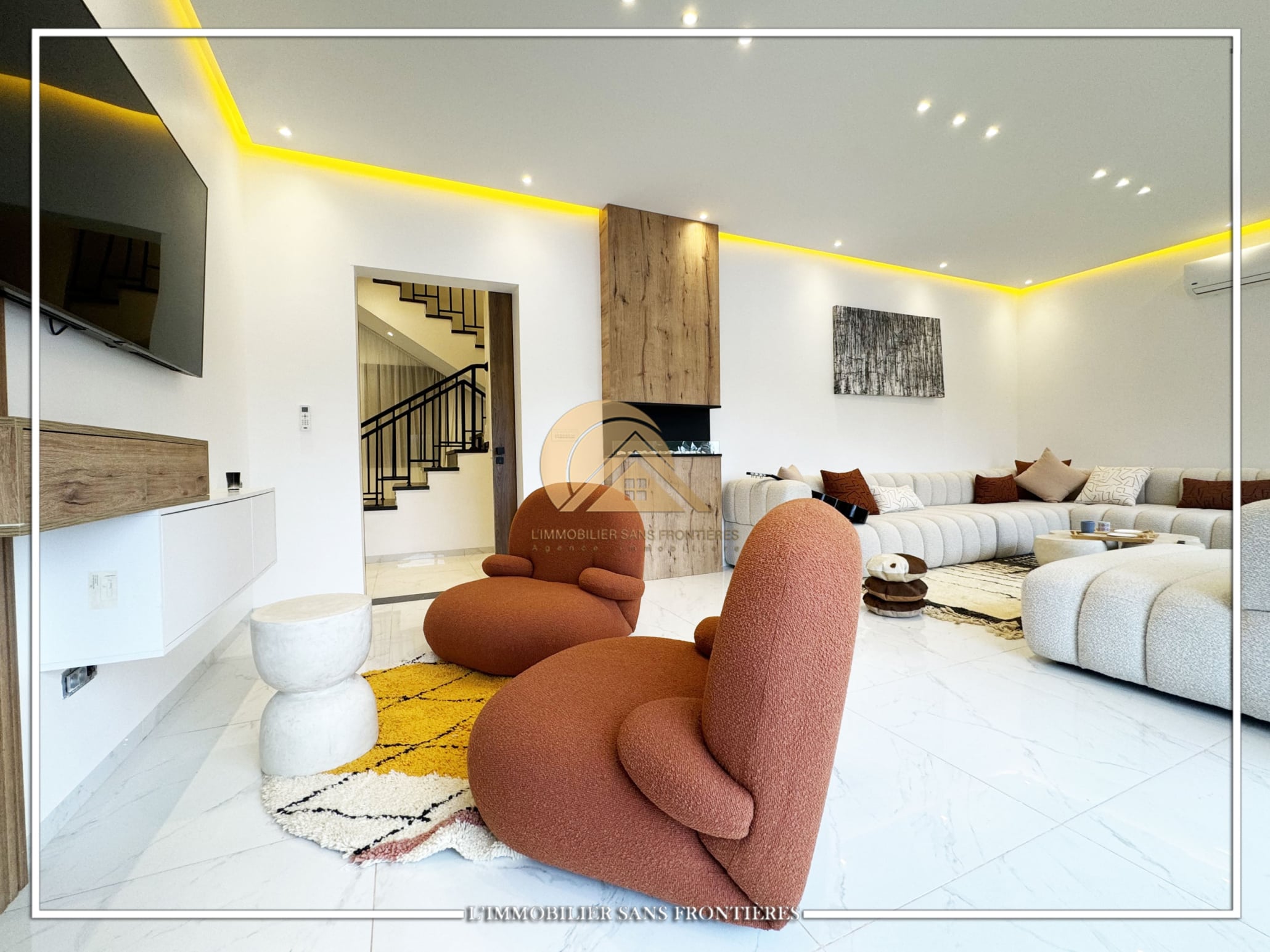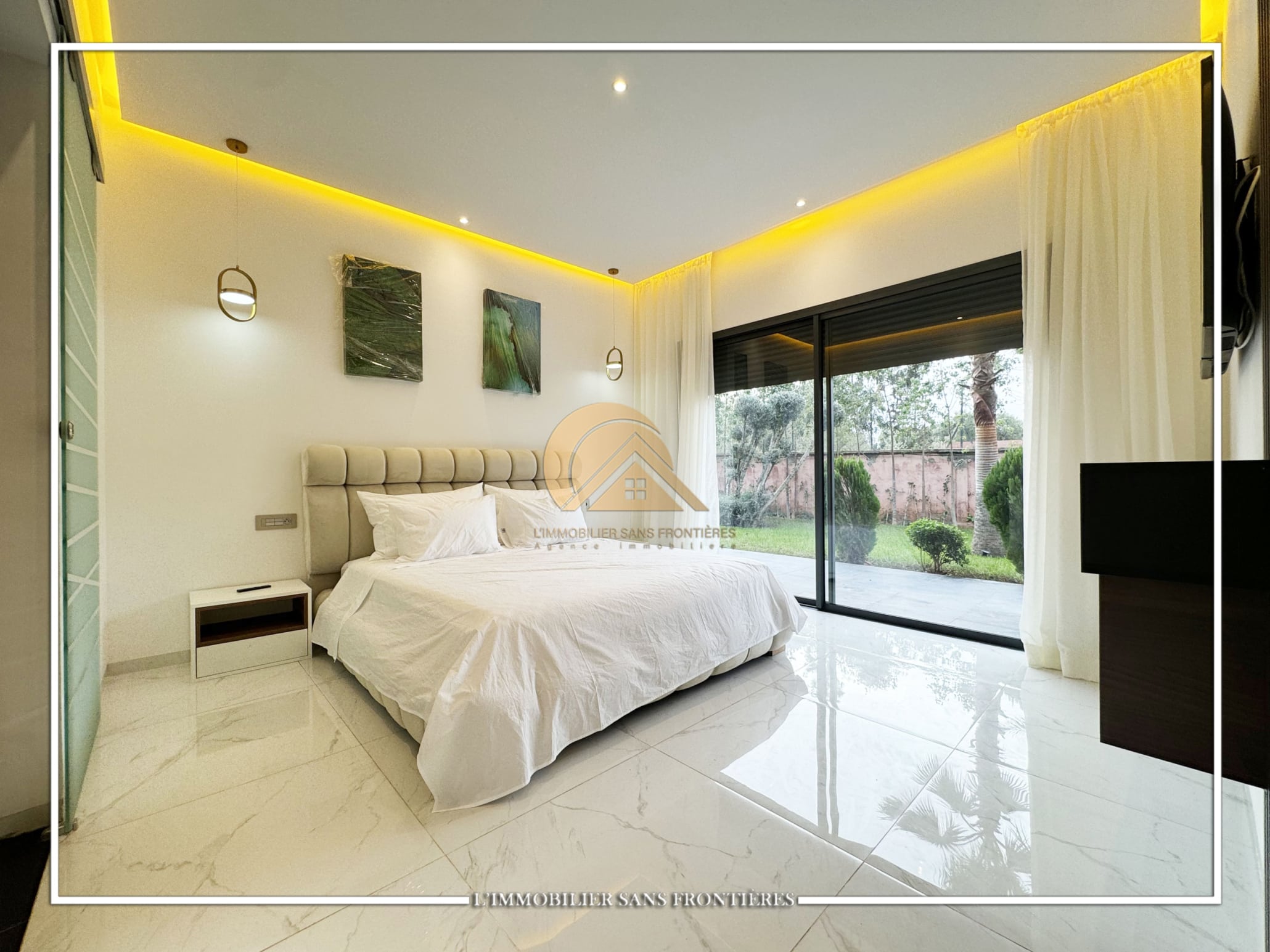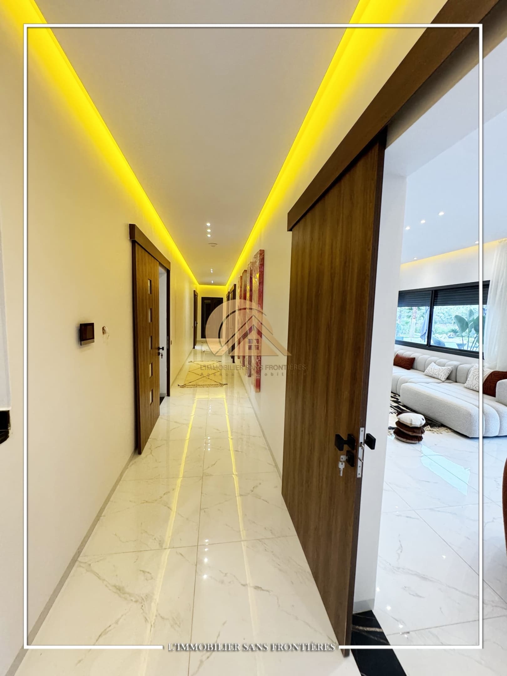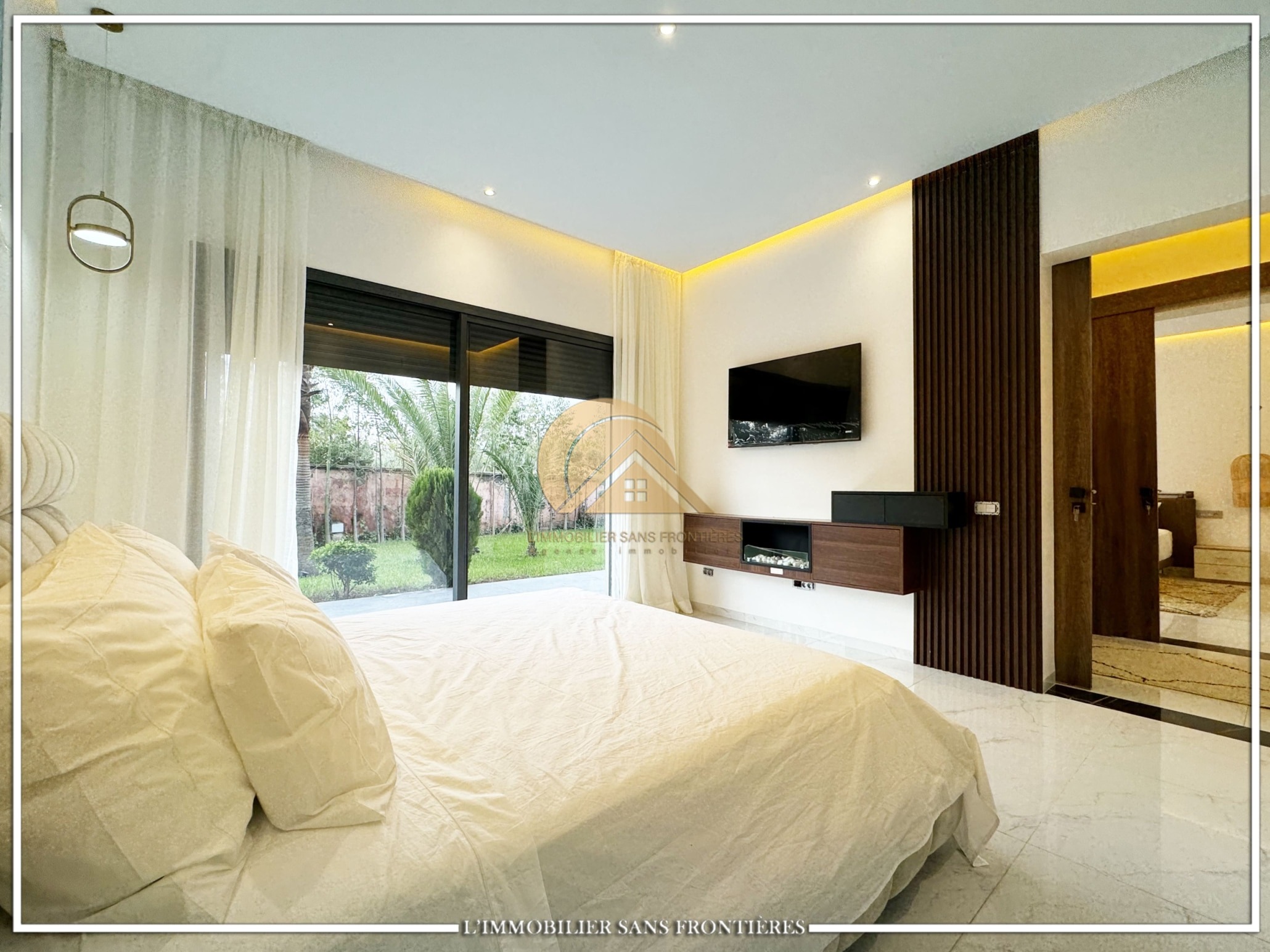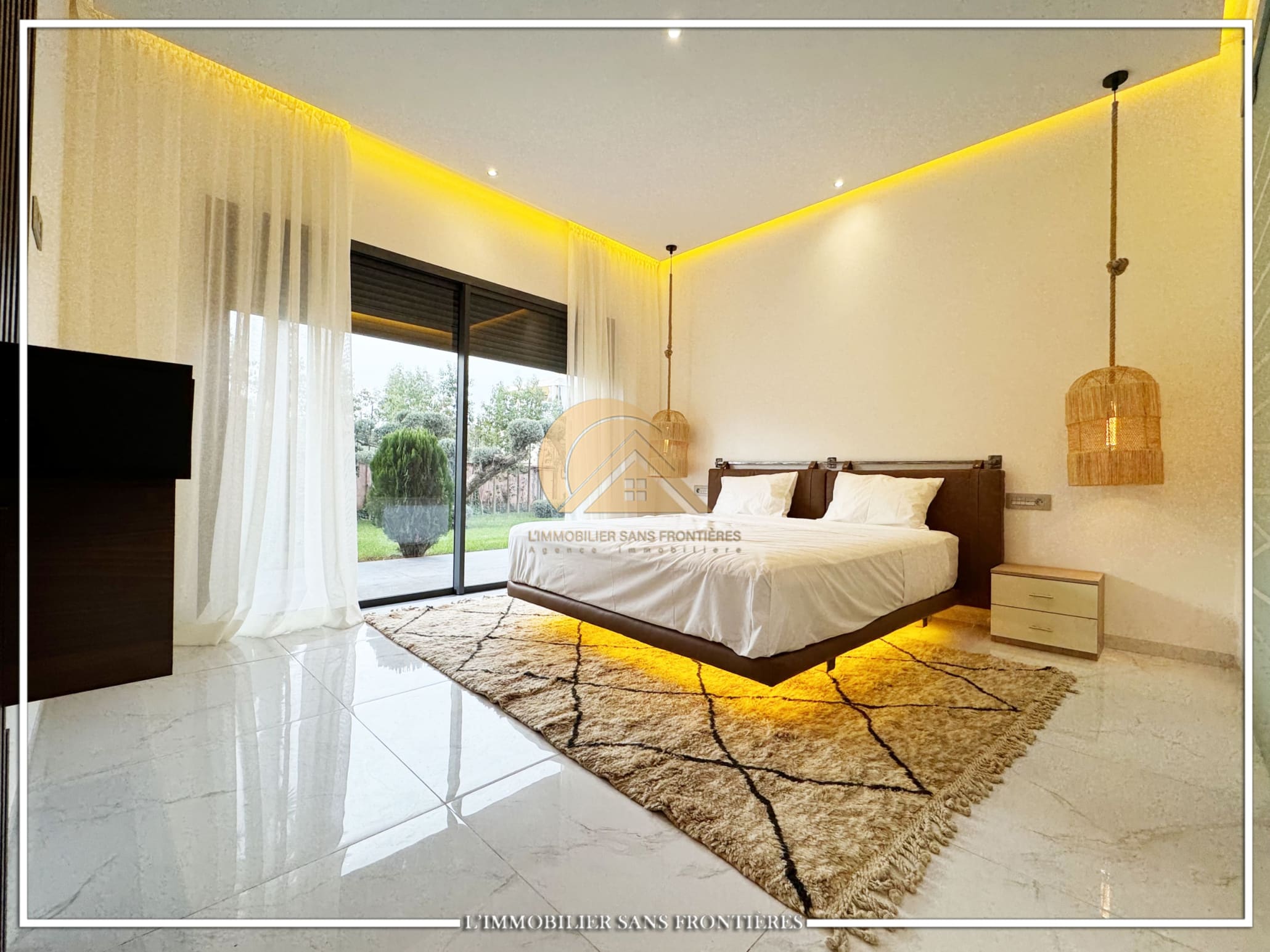 Real Estate Without Borders offers this furnished contemporary villa for sale on Route d’Ourika. The text indicates access via 200 meters of track and 1.5 km from paved road, as well as a large private garden and a private pool. Stated sizes: 3000m² land including 175m² living area.