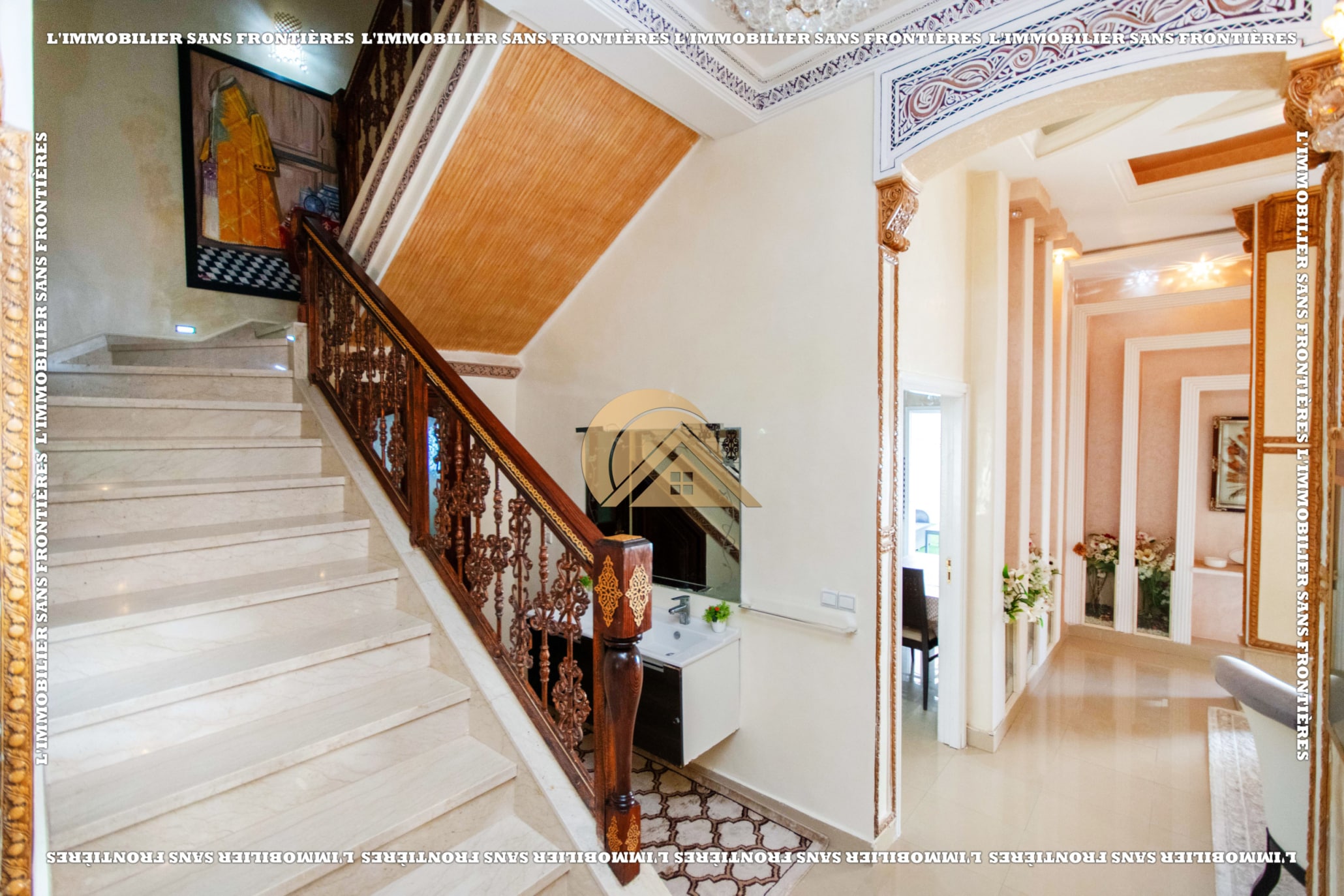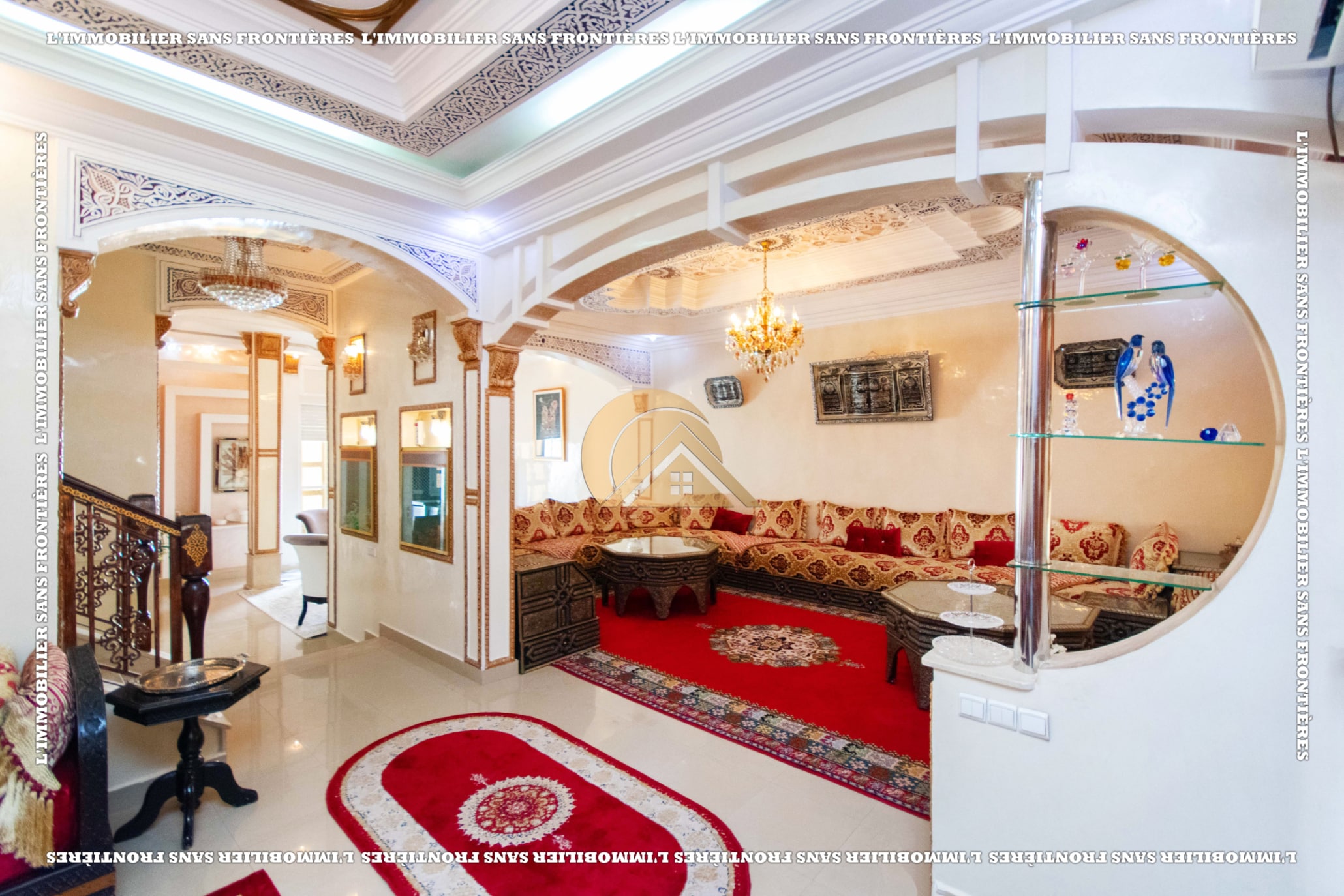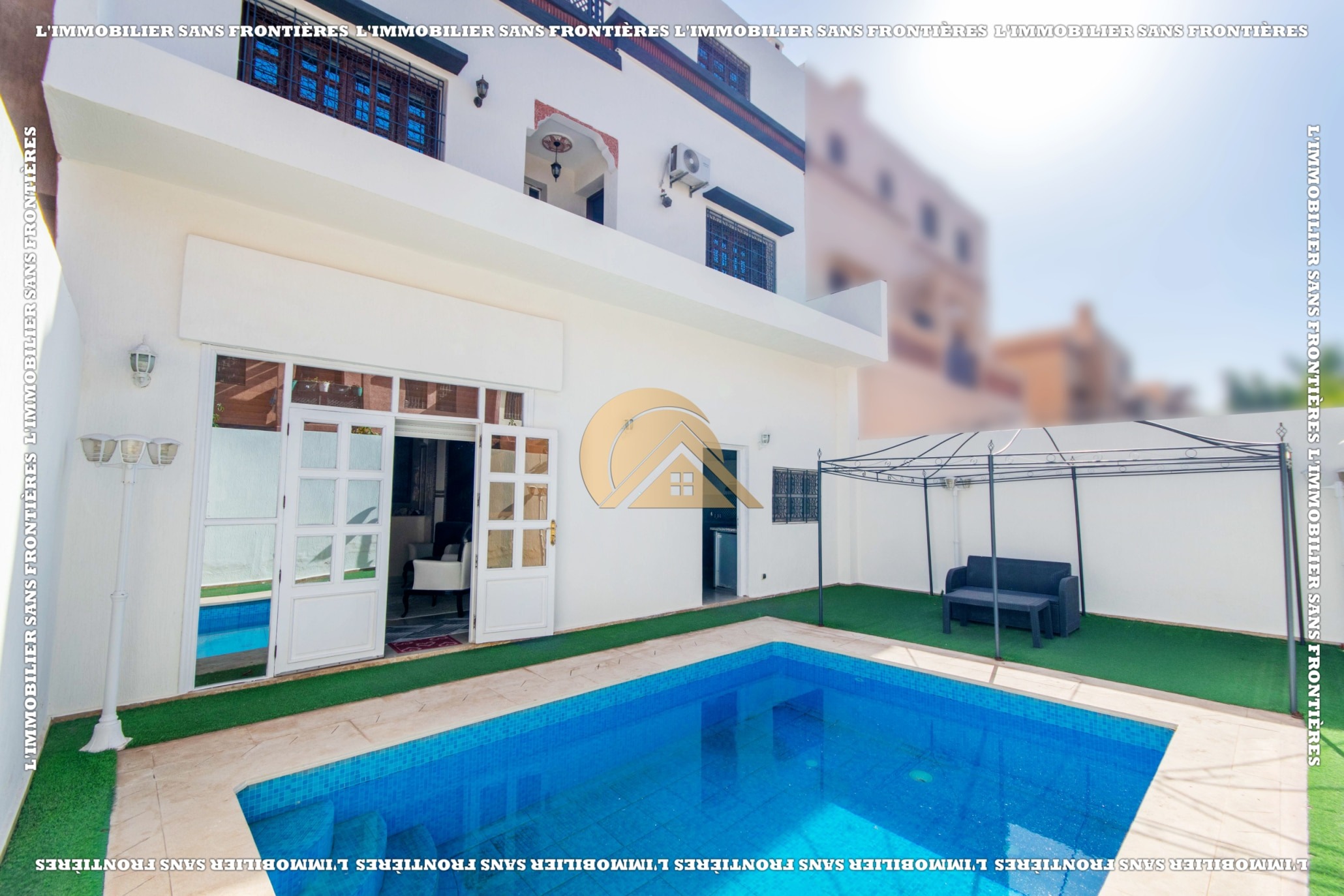 Real Estate Without Borders offers this furnished villa for sale in Abwab Marrakech, in a development described as secure. Total area is 250 m², with a pool and a garage mentioned.