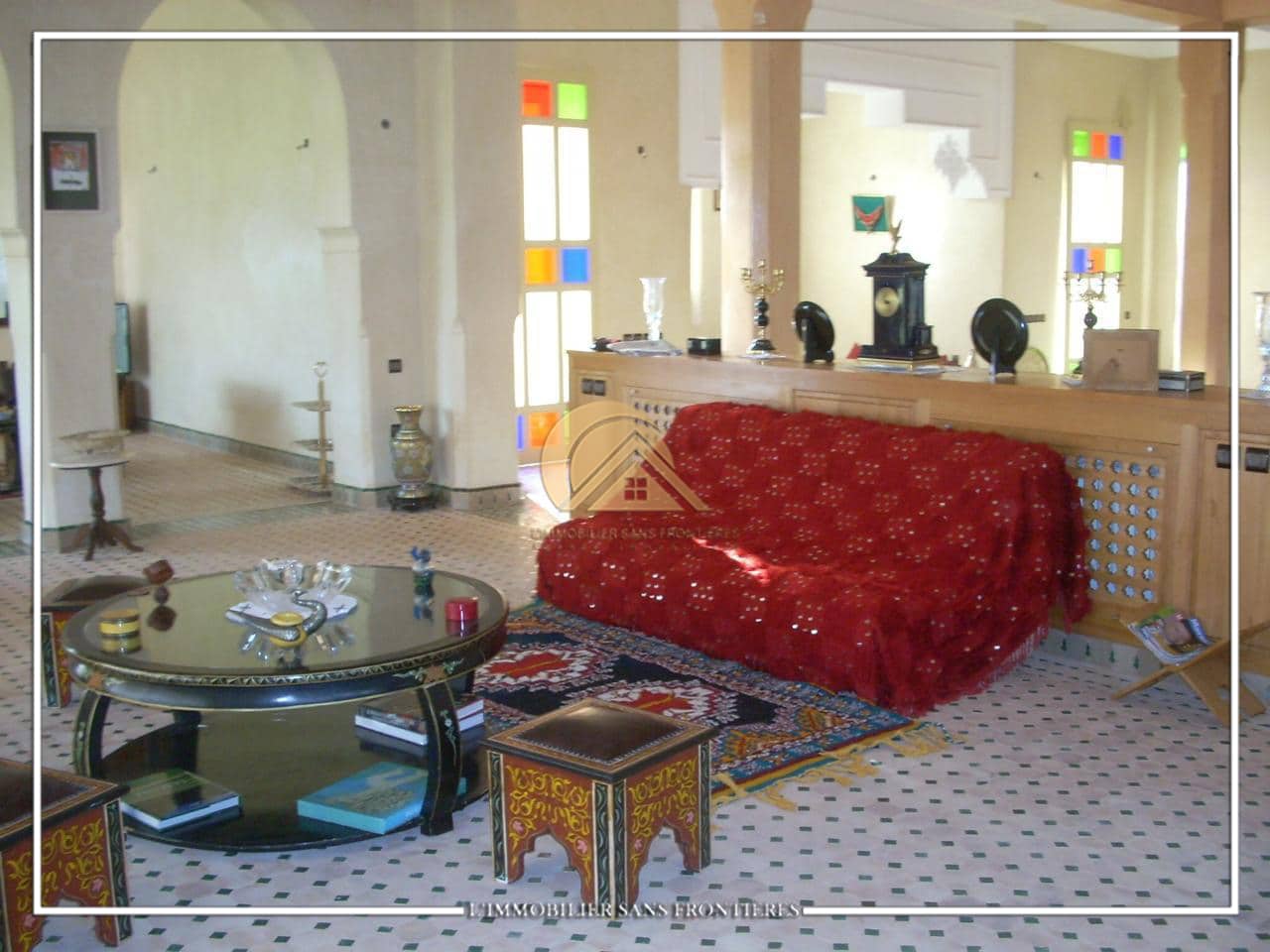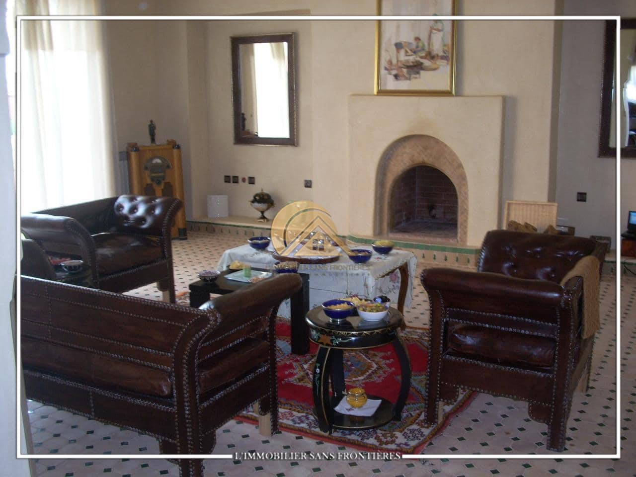 Real Estate Without Borders offers this furnished villa for sale in Bab Atlas, Marrakech. The stated area is 1 hectare 964 m². The layout mentions multiple living rooms with bay windows, as well as a Hammam Beldi and a wood fireplace.