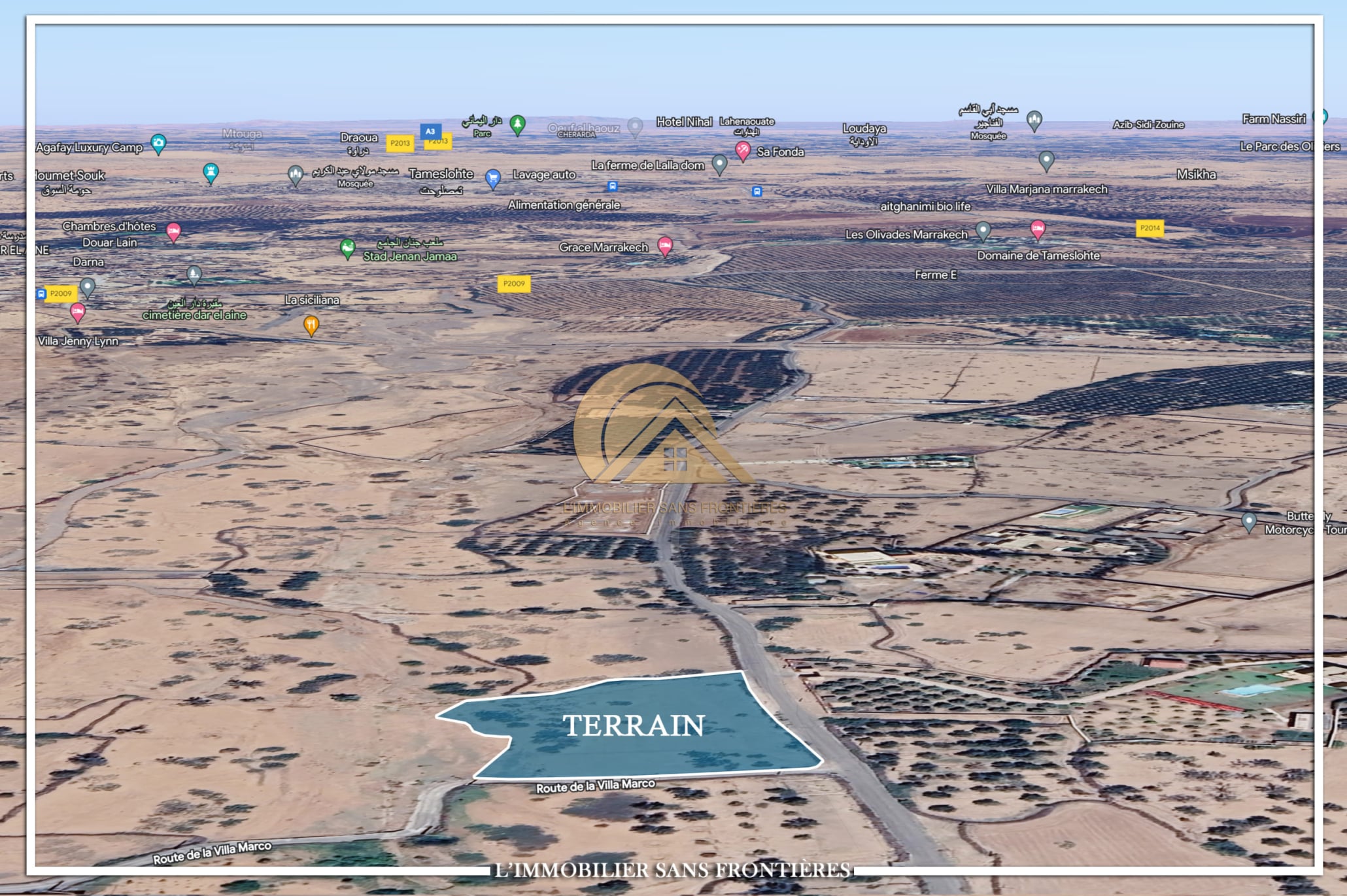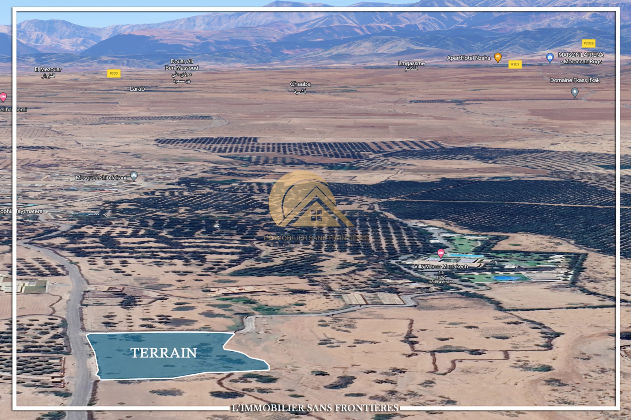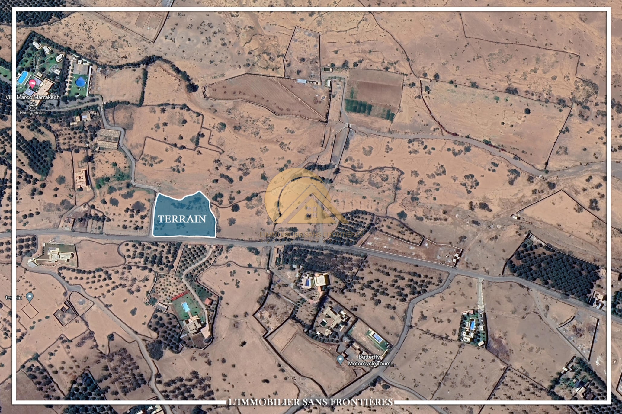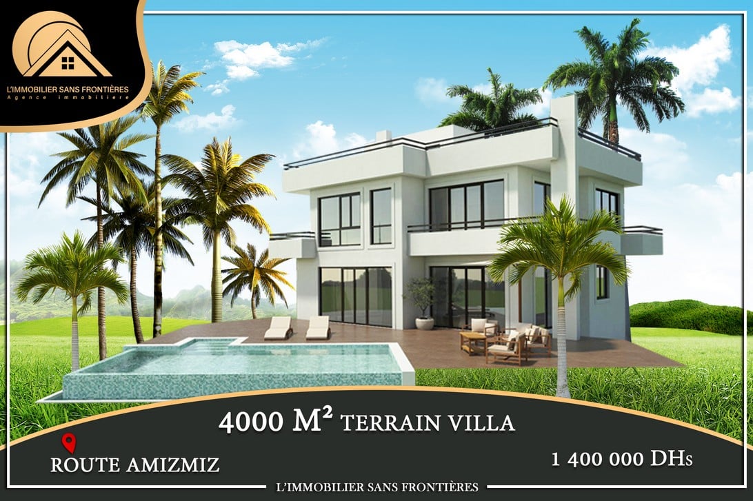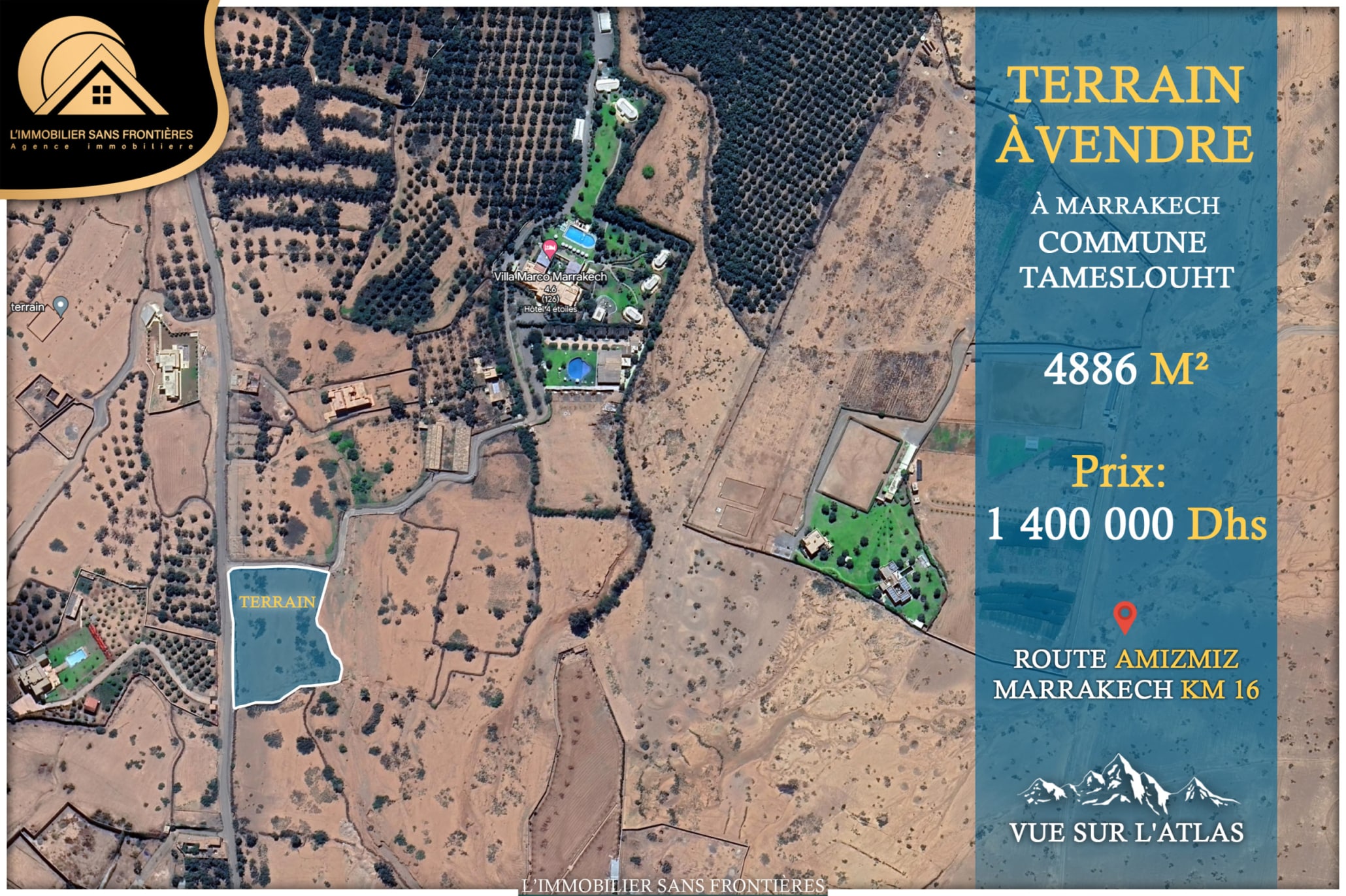 Real Estate Without Borders offers this land for sale on Route d’Amizmiz at 16 km, Marrakech, with a surface area of 4886m². It is presented for building a villa. Access is indicated with 2 km of paved road.