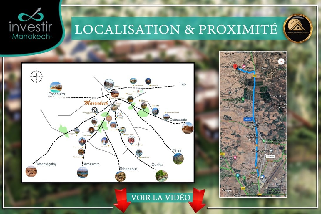 Real Estate Without Borders offers this authorized land for sale on Route Agafay km13 in Marrakech, within the Palmeria 2 project. The site is indicated along a paved road, 13 km from the airport, with the Agafay desert and Assoufid golf mentioned nearby. The project is presented within a gated and secured residence.