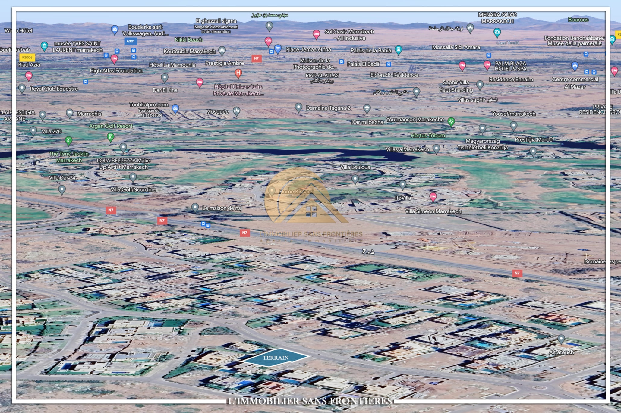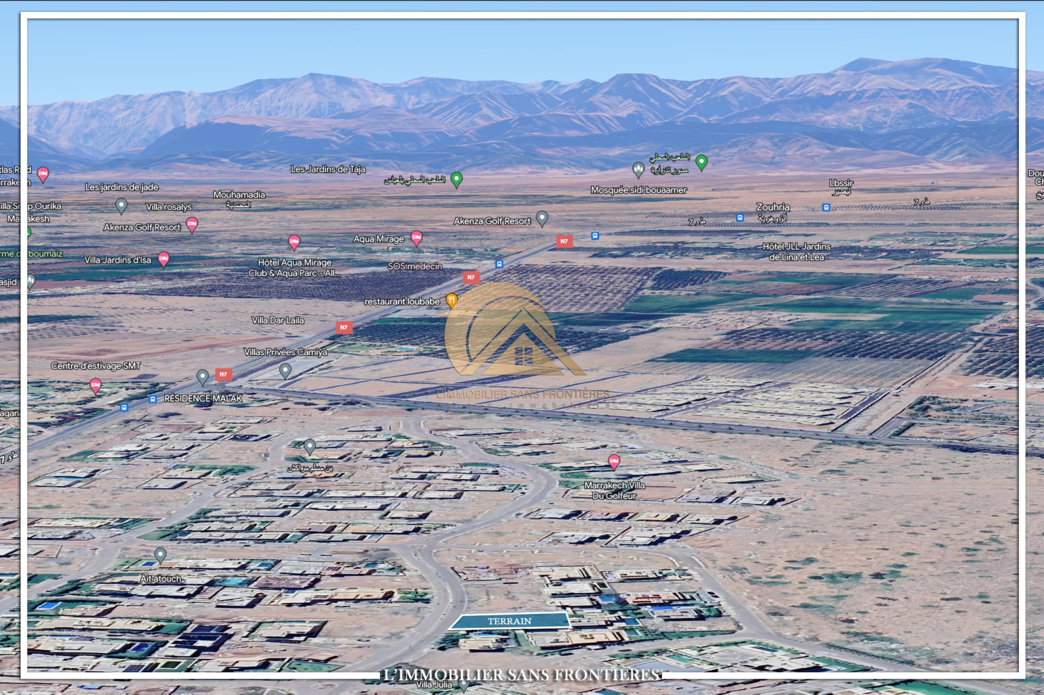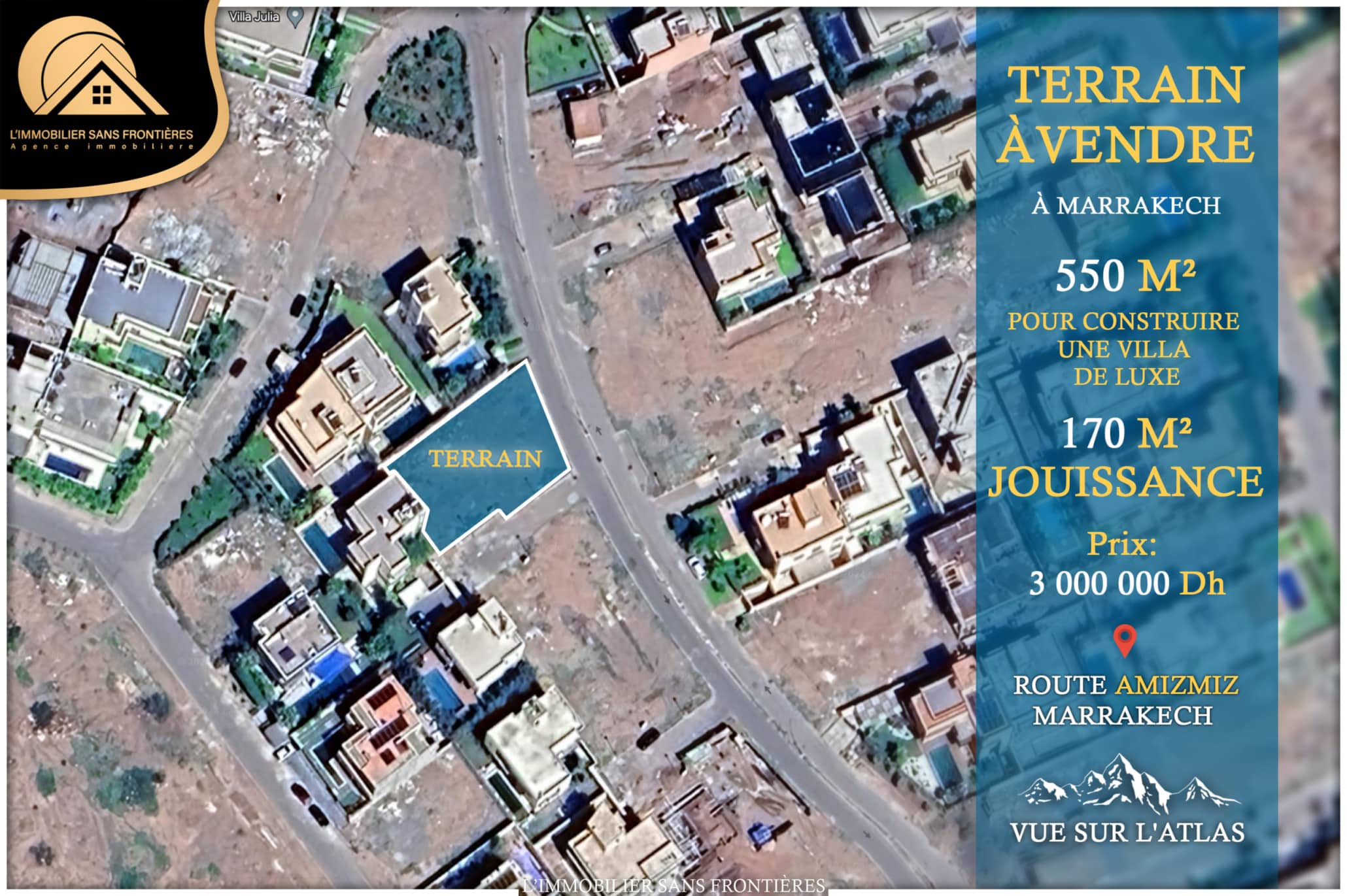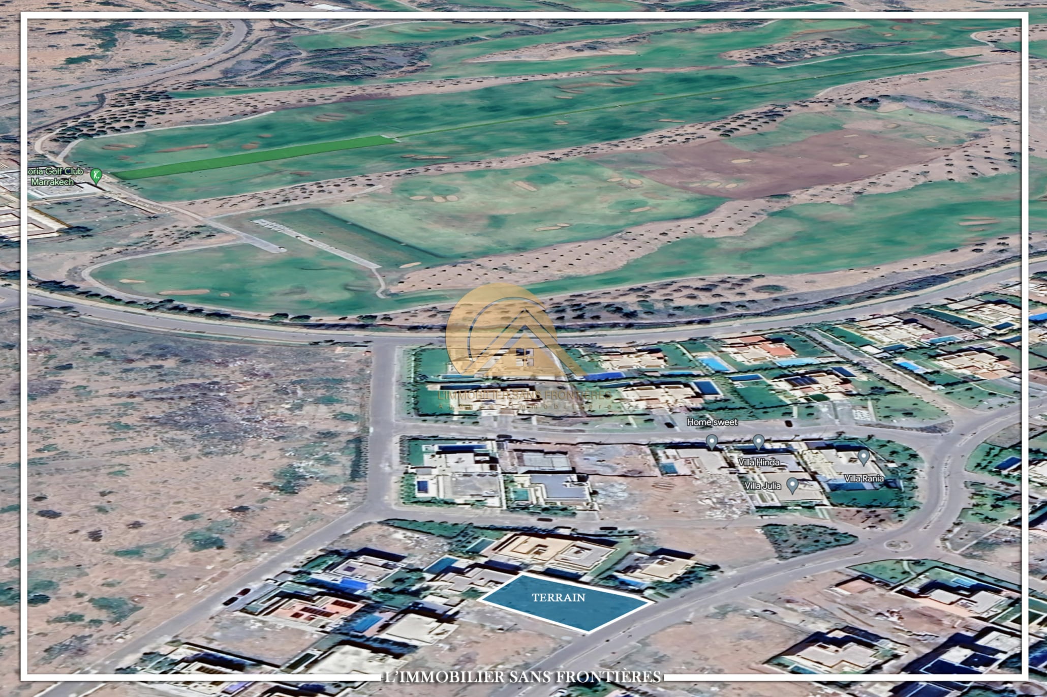 Real Estate Without Borders offers this land for sale in Golf Noria, on Route d’Amizmiz, 4 km from Marrakech. The stated area is 550 m² with 170 m² of jouissance.