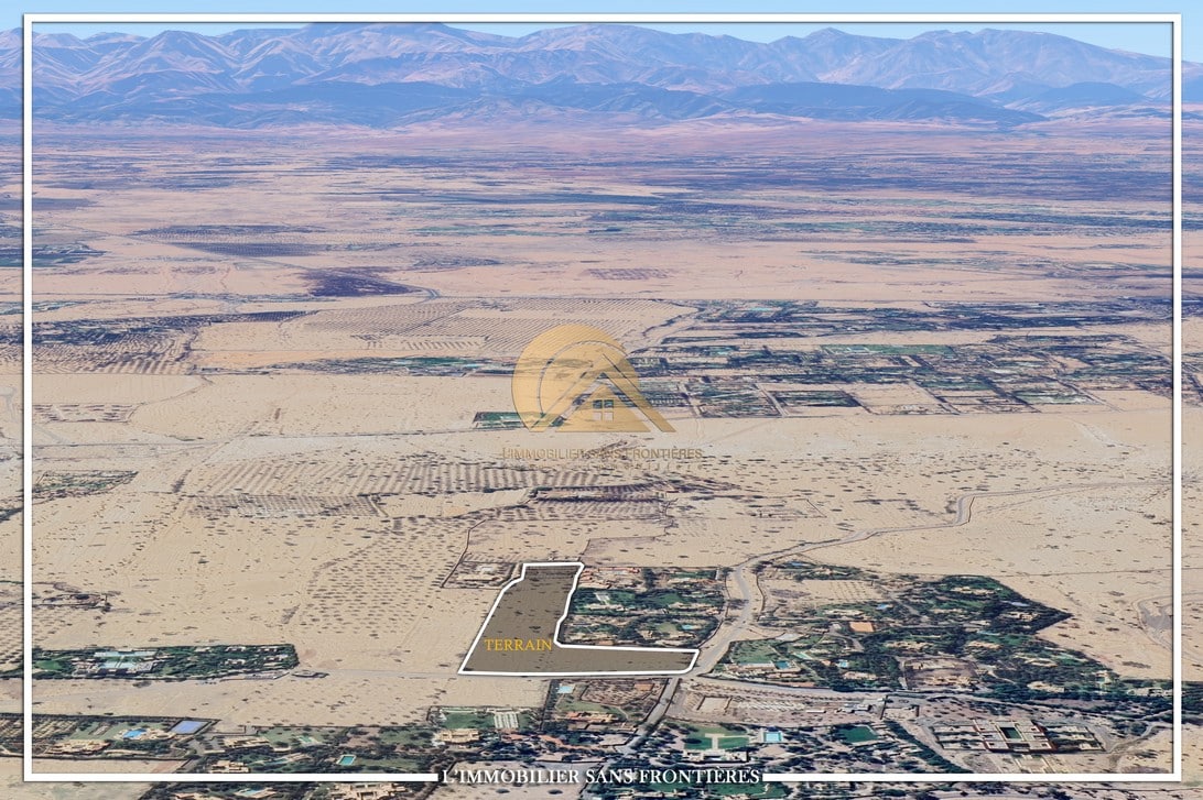 Real Estate Without Borders offers this land for sale in Palmeraie, Marrakech. Area: 3 hectares 9171 m². The text states a construction capacity of one villa per hectare, in a calm and green setting, close to amenities.