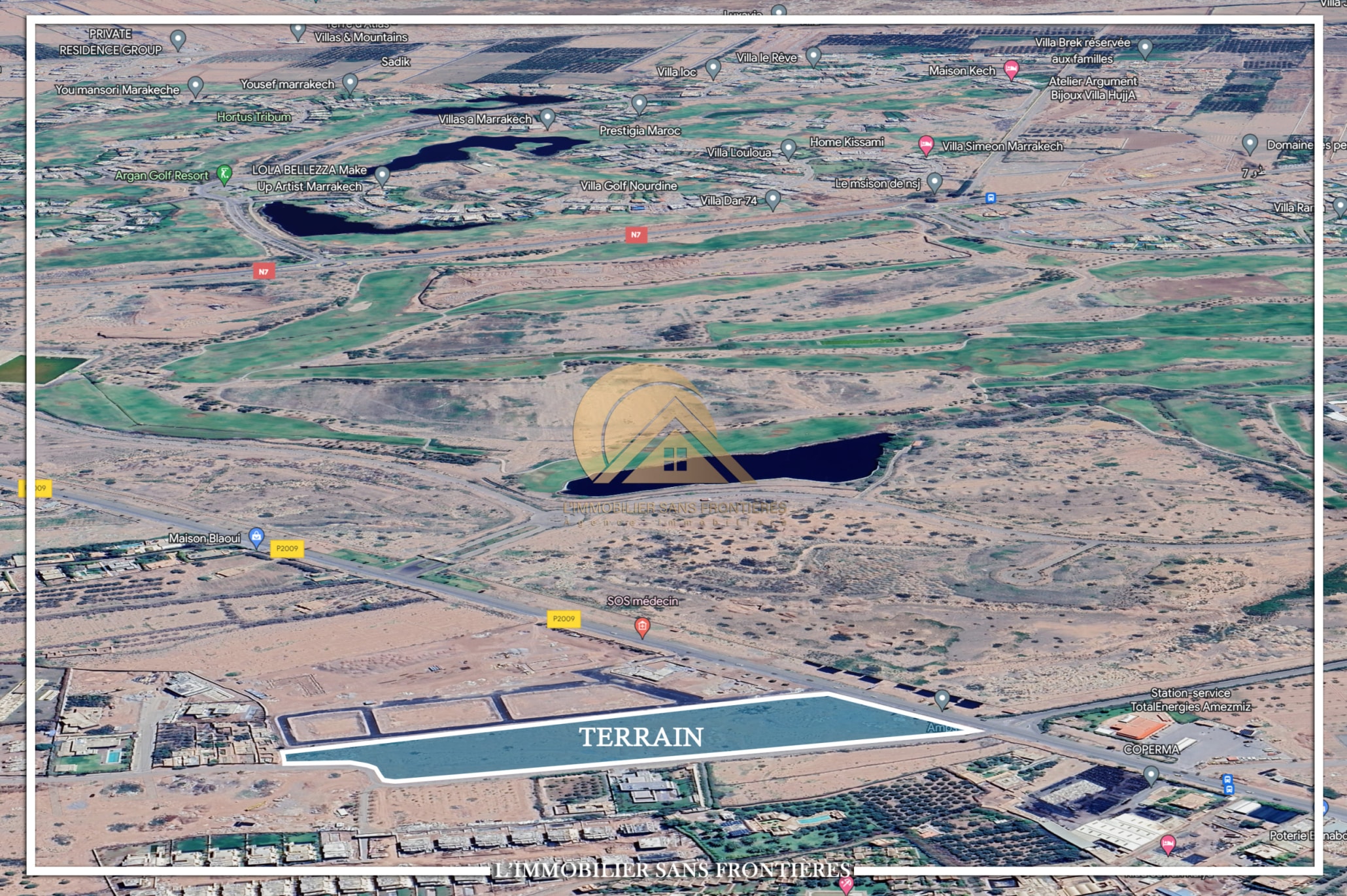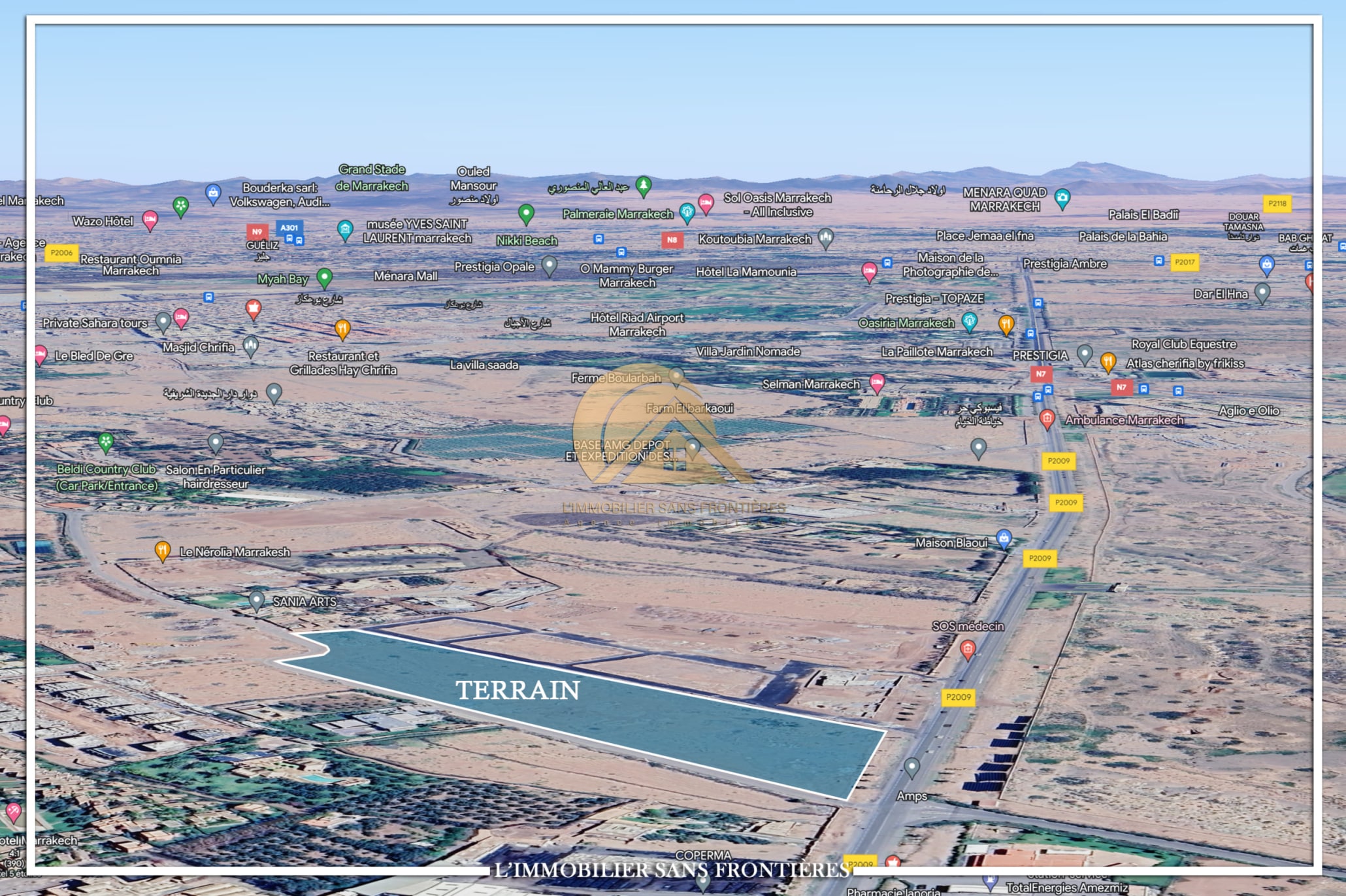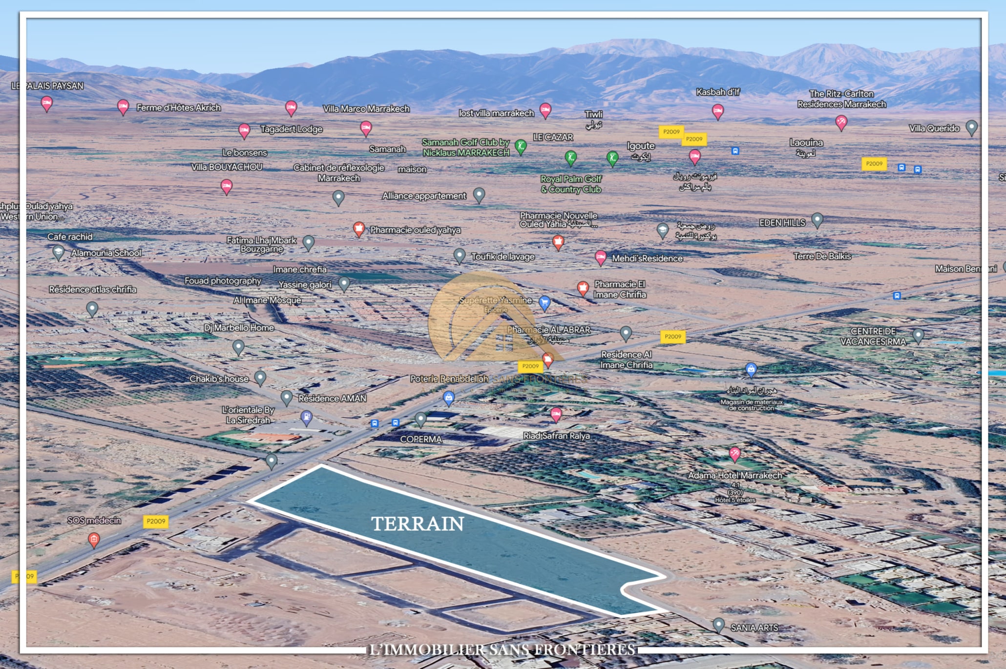 Real Estate Without Borders offers for sale this land plot of 2 hectares 7 250 m² on Route d’Amizmiz, 2 km from Chrifia, on the main road. It is classified S1 zone, with stated price per hectare.
