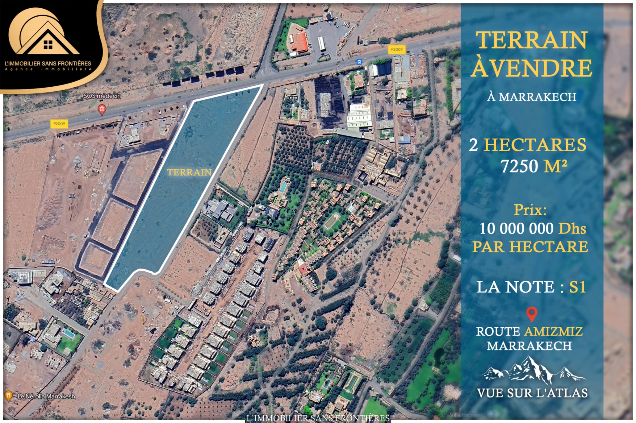 Suitable for: a project aligned with S1 framework for an investor looking for 2 hectares 7 250 m² on Route d’Amizmiz with stated location and road access. Less suitable for: a project requiring a different classification.