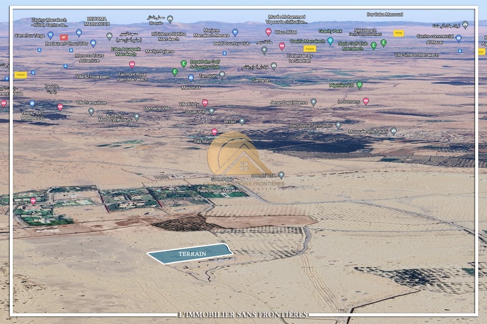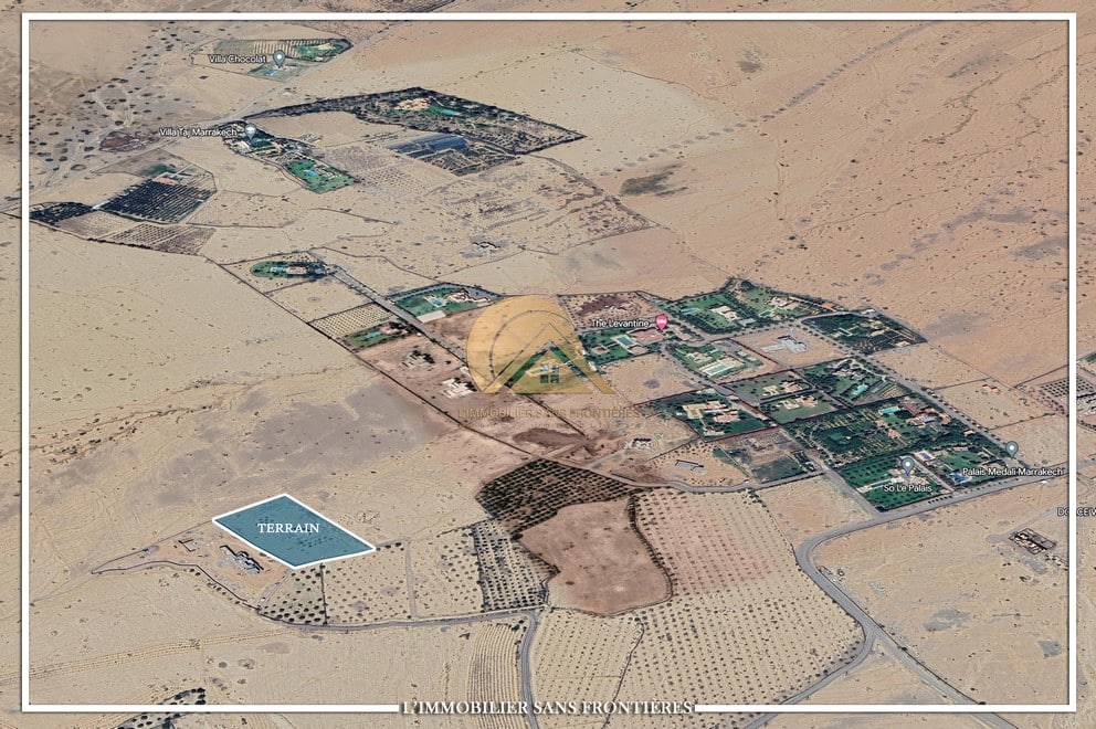 Real Estate Without Borders offers this RA land for sale (one hectare) on Route d’Amizmiz km 17, Marrakech, with a stated 800 m track. The listing mentions a semi-finished villa and VNA.