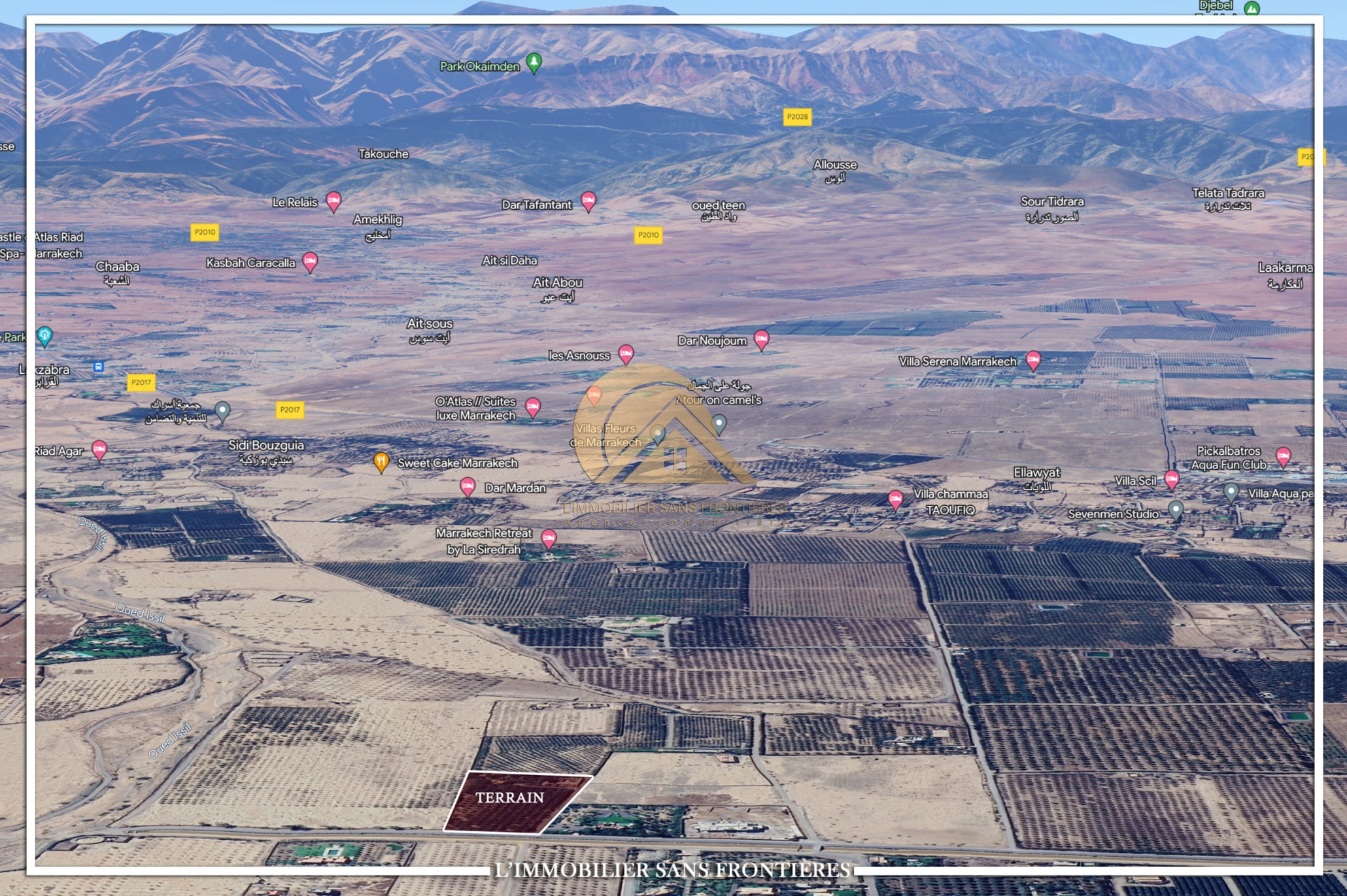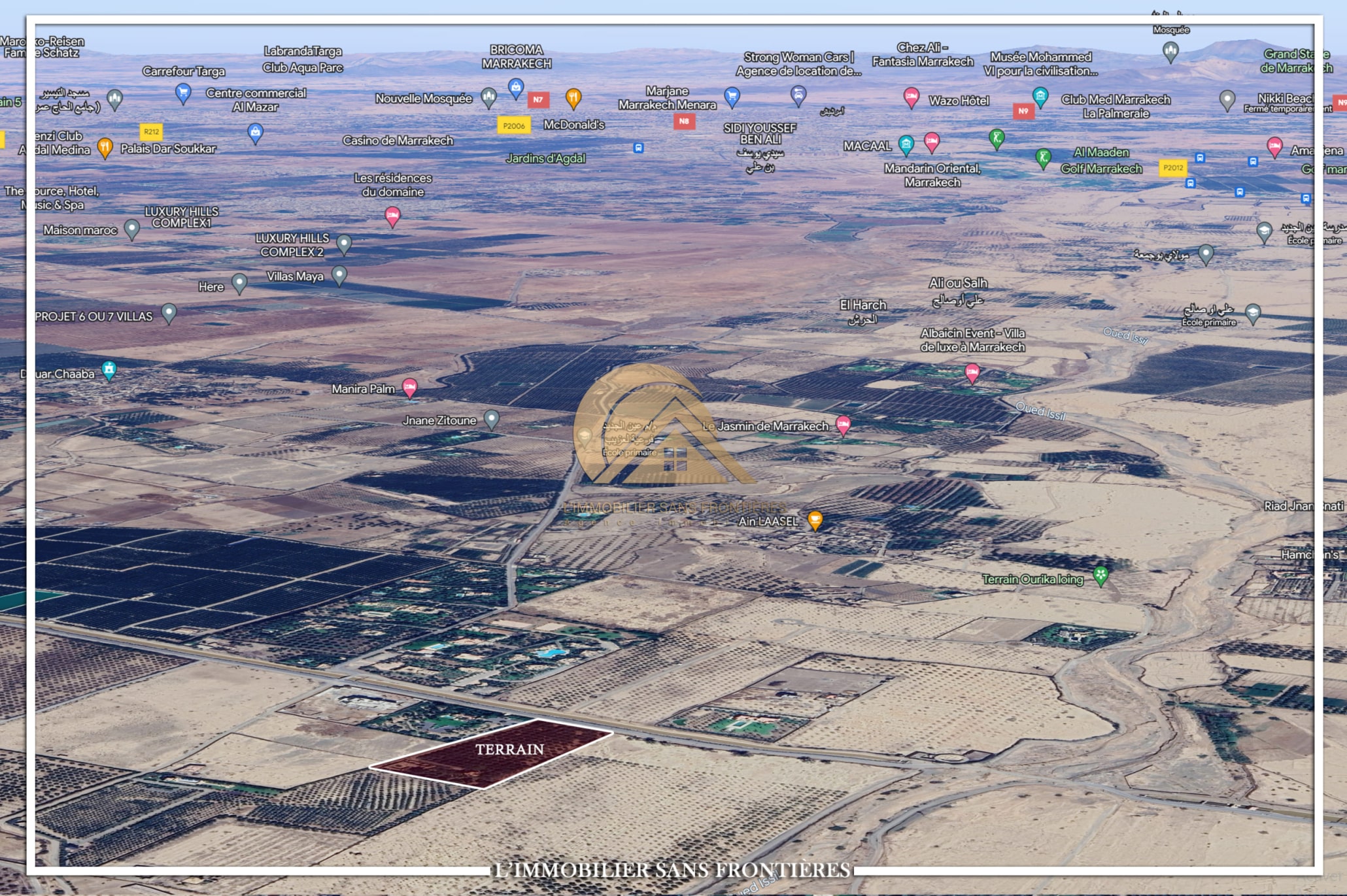 Real Estate Without Borders offers this land for sale of 2 hectares 0770, located 13 km from Marrakech on Route d’Ourika. The text indicates a strategic location nearby. RA note: information not provided.