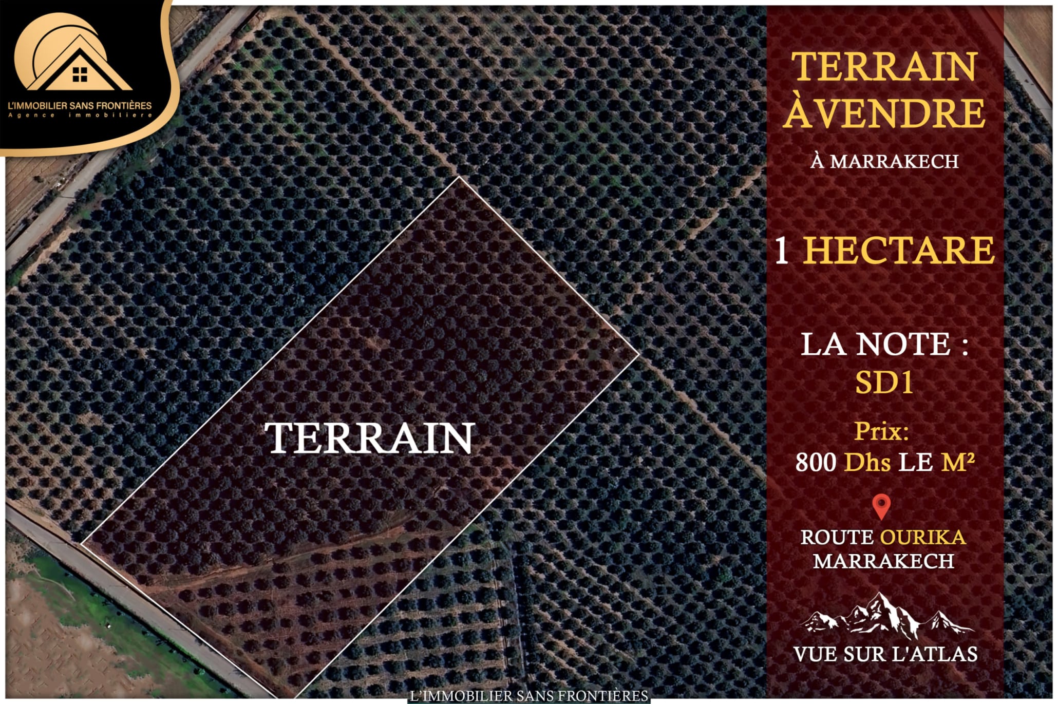 Real Estate Without Borders offers for sale this 1-hectare land plot on Route d’ourika, classified in SD1 zone. A note states this zone is designated for a maximum of 10 individual villas.