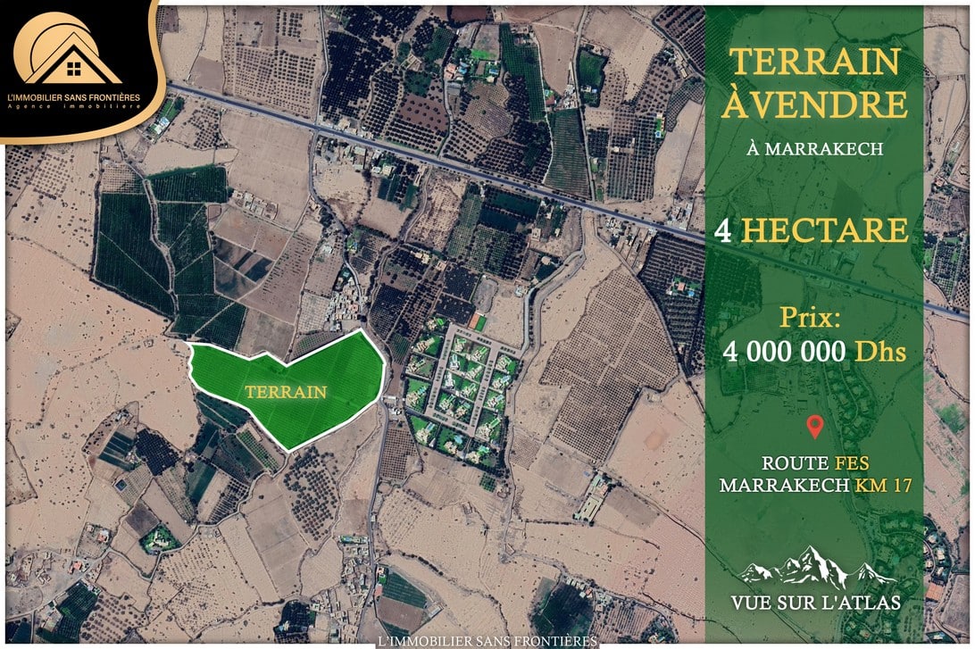 Real Estate Without Borders offers for sale this titled 4-hectare land plot on Route de Fès km 17 in Marrakech. It is presented with a stated possibility to build up to 4 villas per hectare and an explanatory SA2 note.