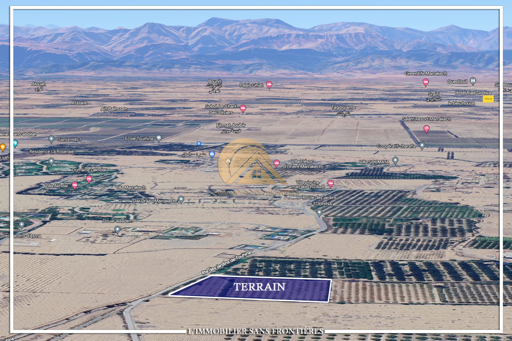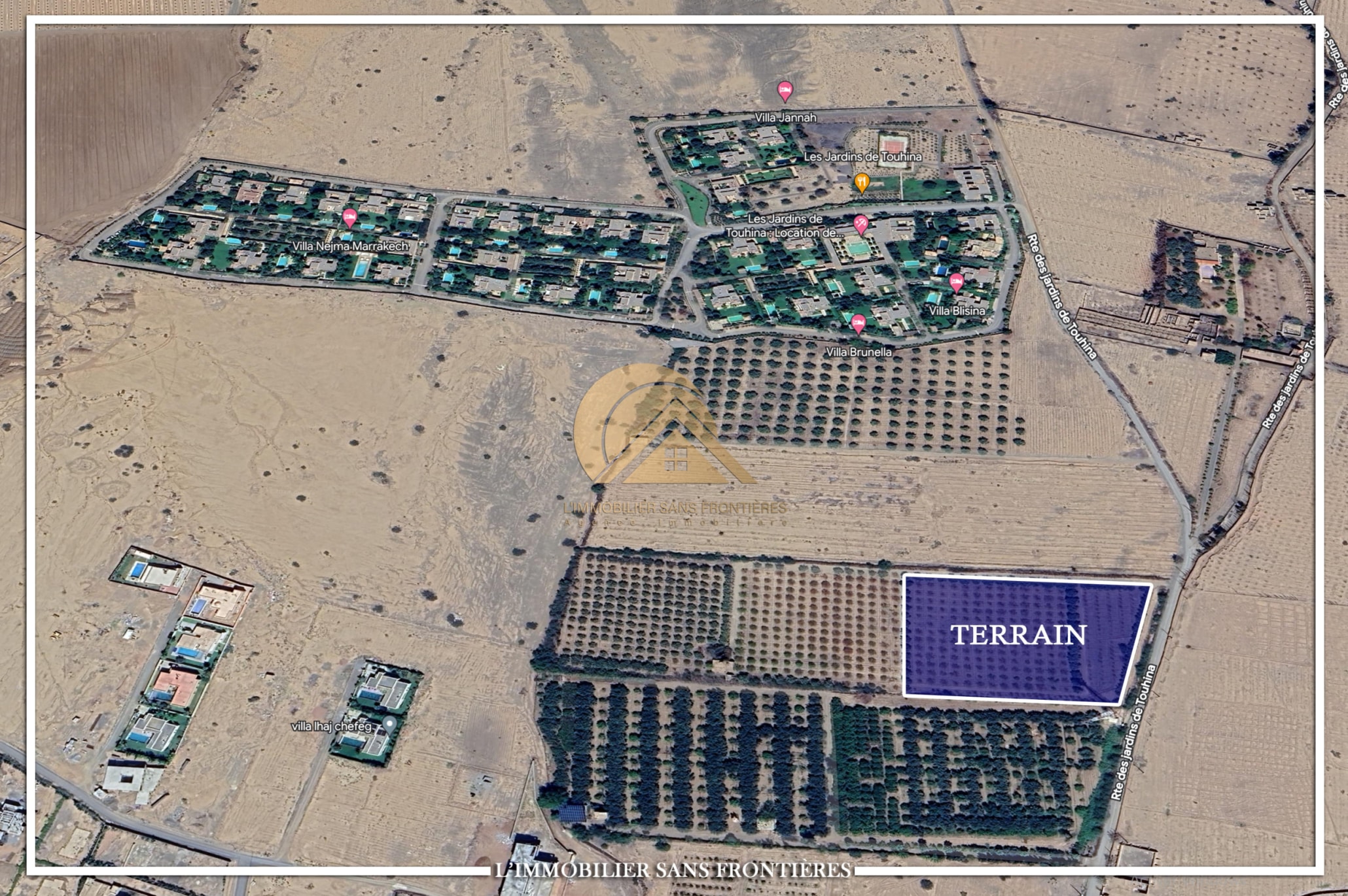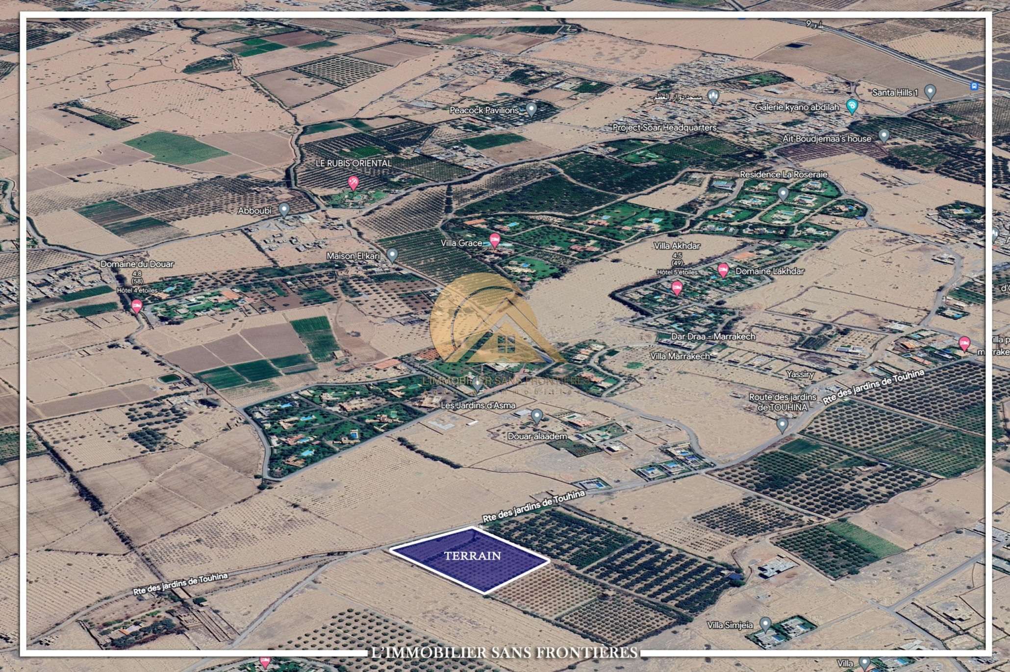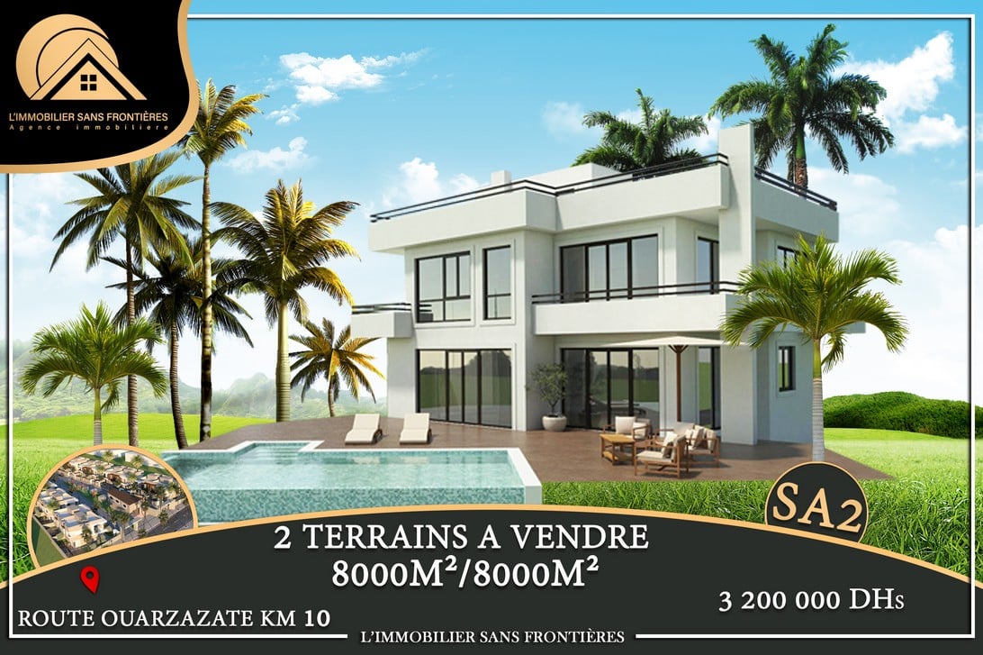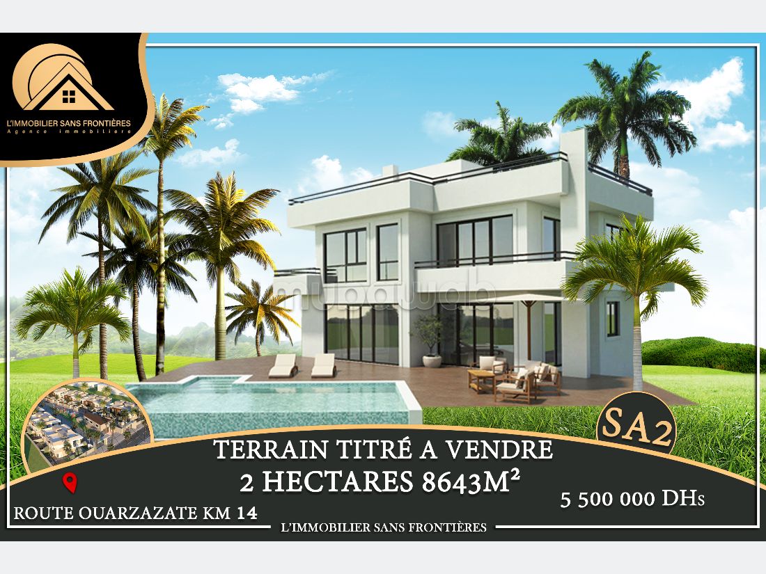 Real Estate Without Borders offers this titled SA2 land for sale, with an area of 2hectares 8643m², located on Route de Ouarzazate km 14, Marrakech.
