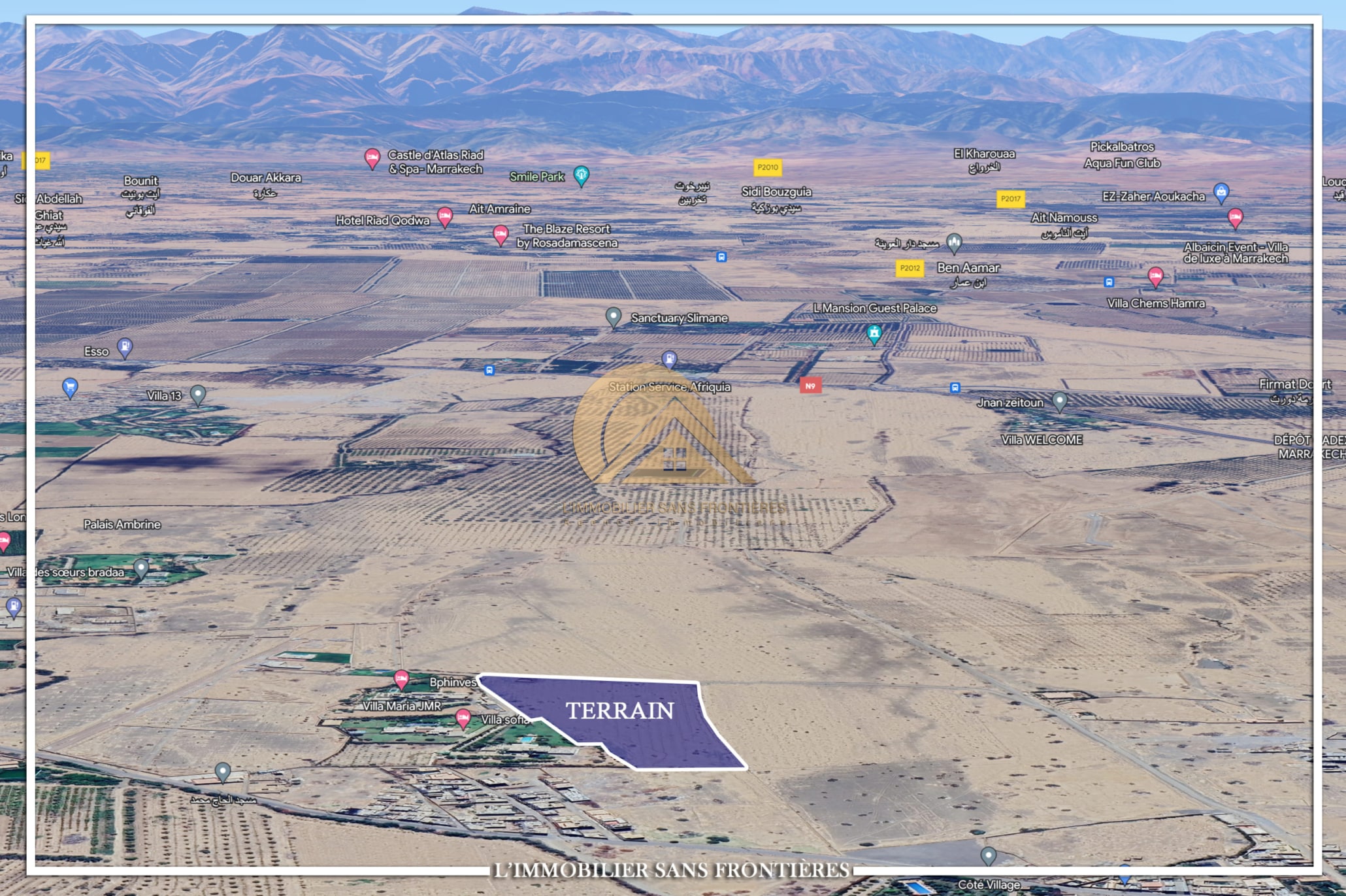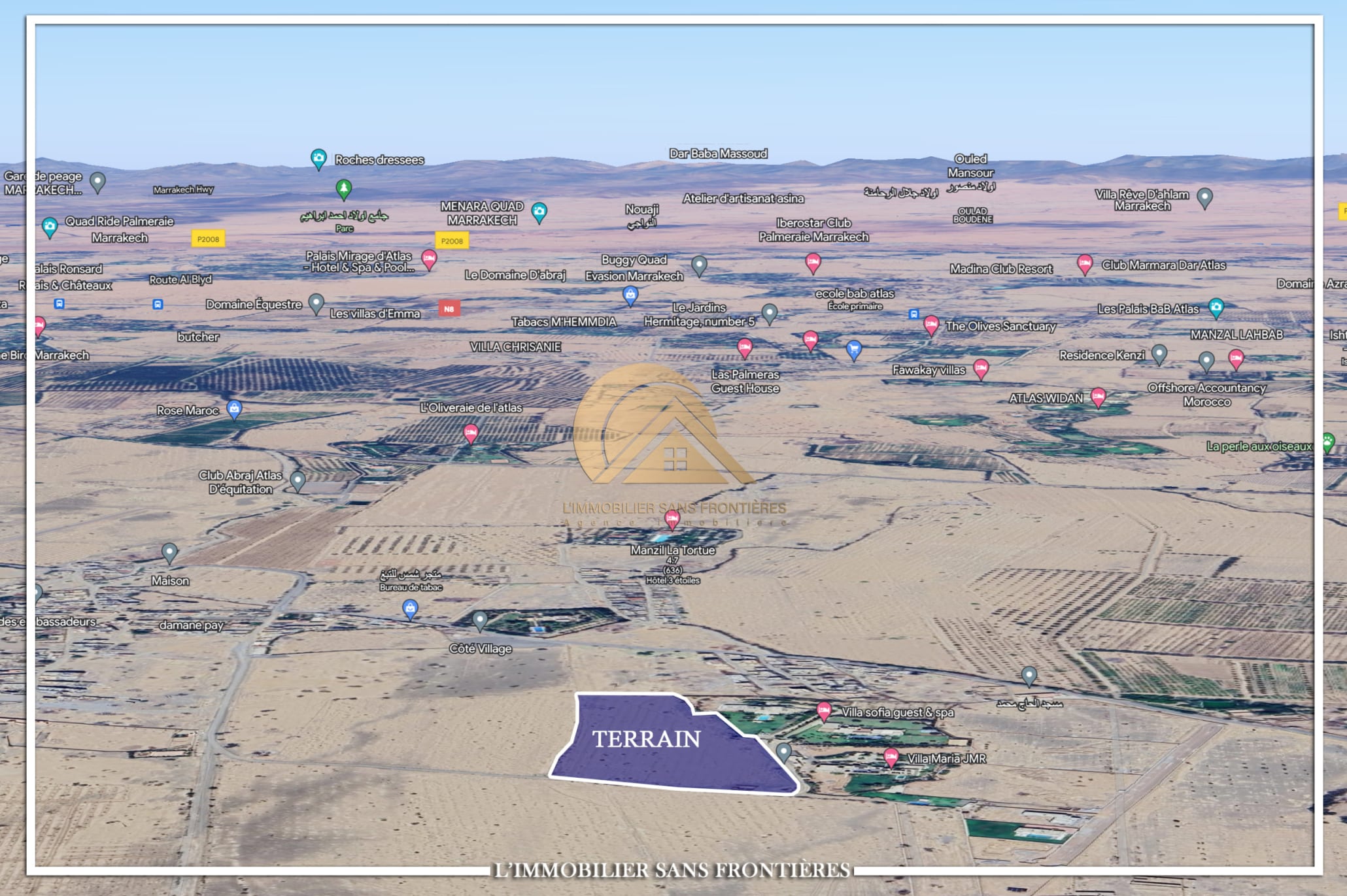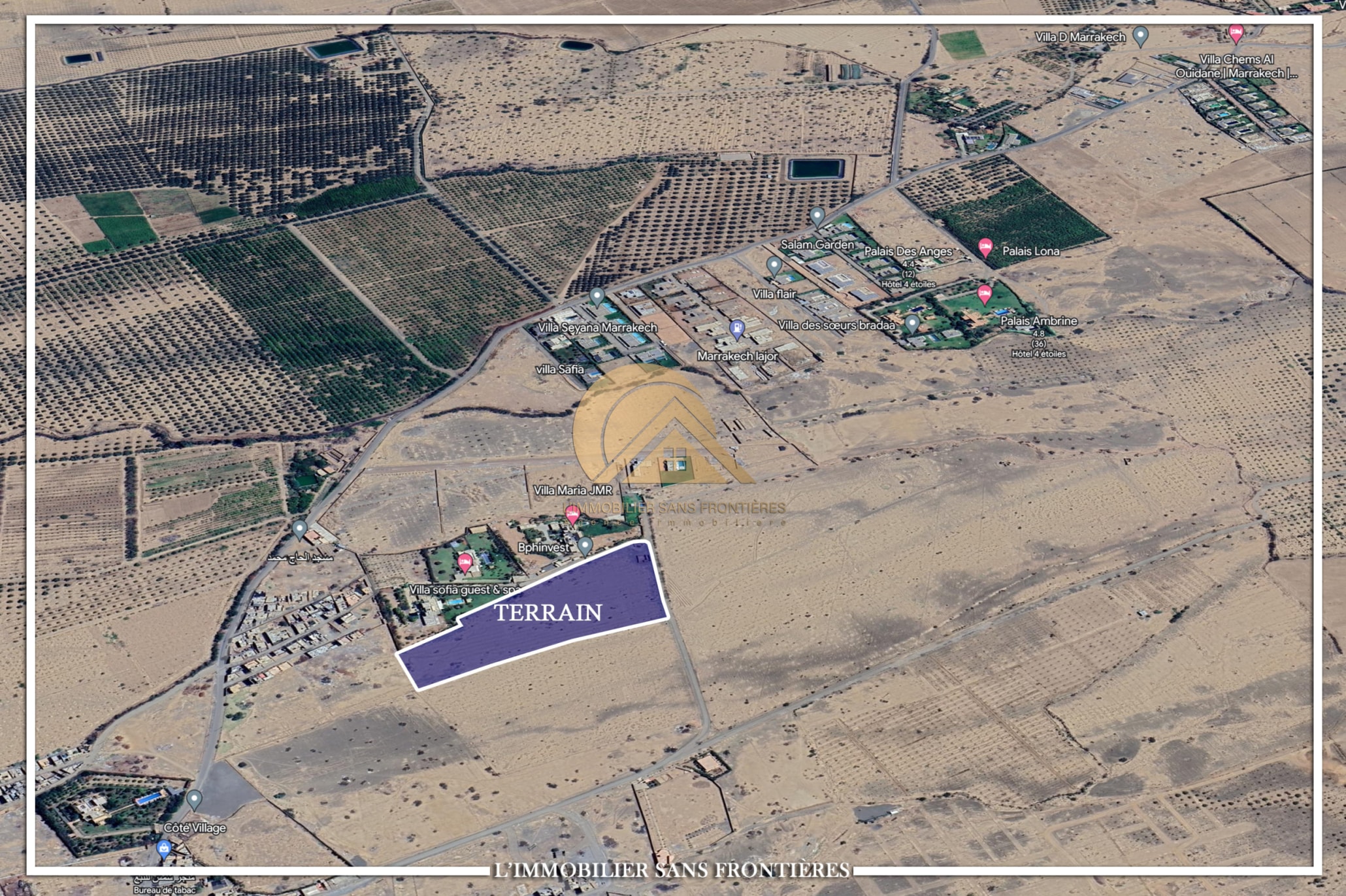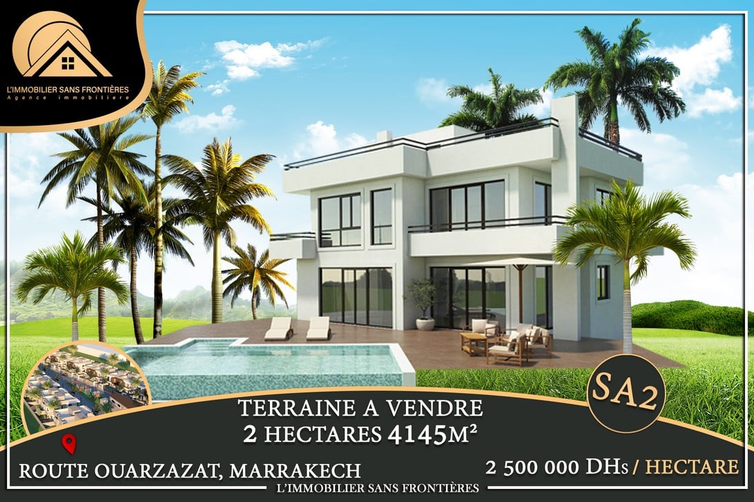 Real Estate Without Borders offers this land plot for sale on Route Ouarzazate Km12, Marrakech, with an area of 2 HA4145 m² and 500 m of track access. The plot is classified as SA2. SA2 refers to a zoning classification where construction is limited to a maximum of 4 villas per hectare (as stated).