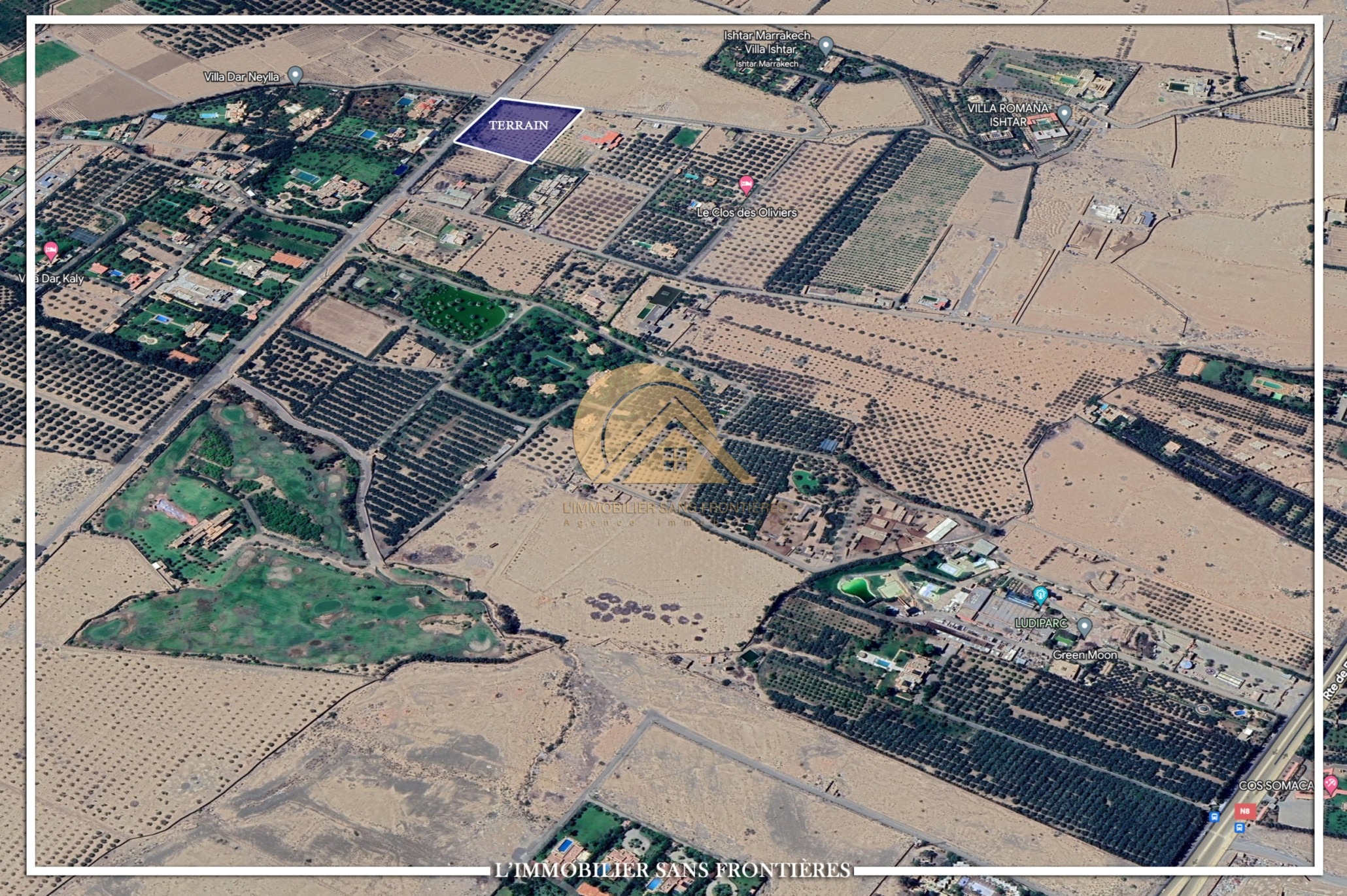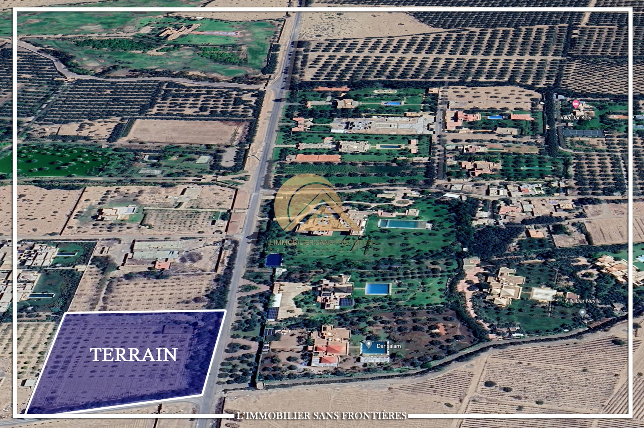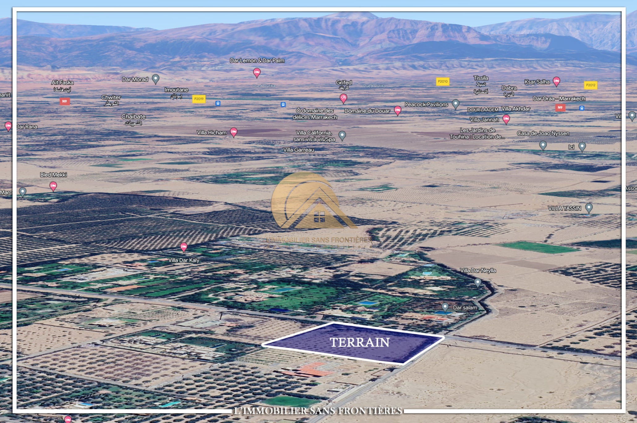 Real Estate Without Borders offers this titled land plot for sale on Route Ouarzazate km10, Marrakech, with an area of 8847 m². The plot is classified with the SA2 note.