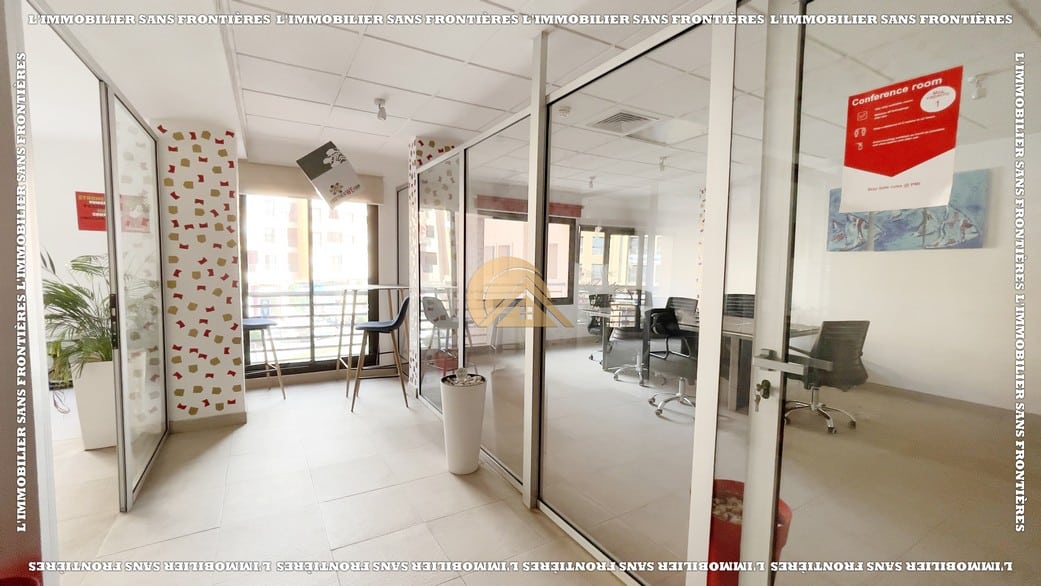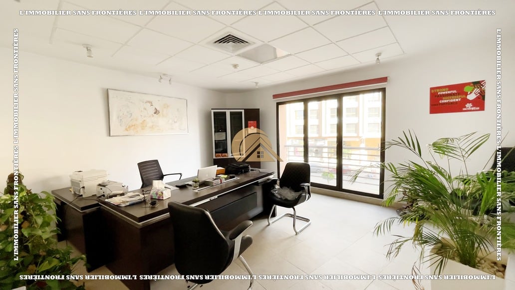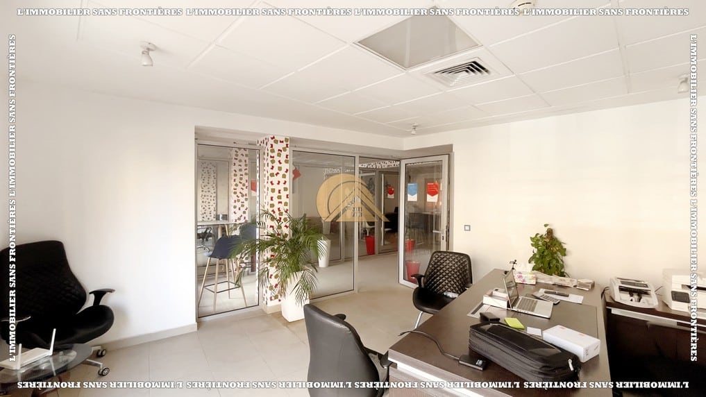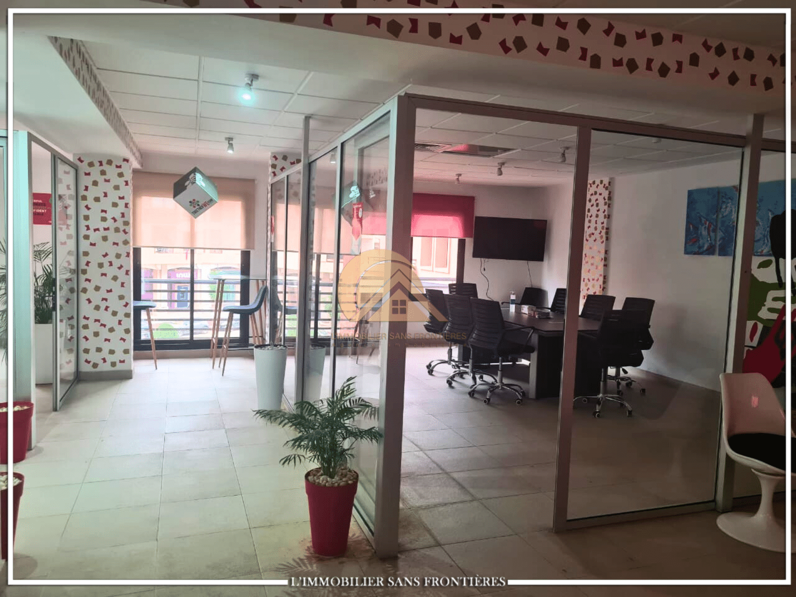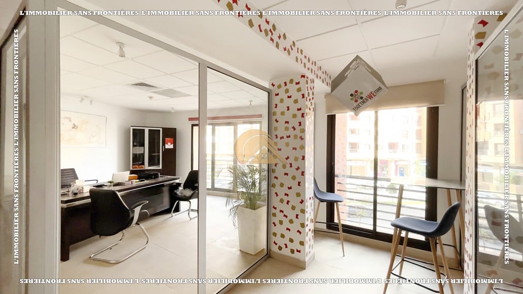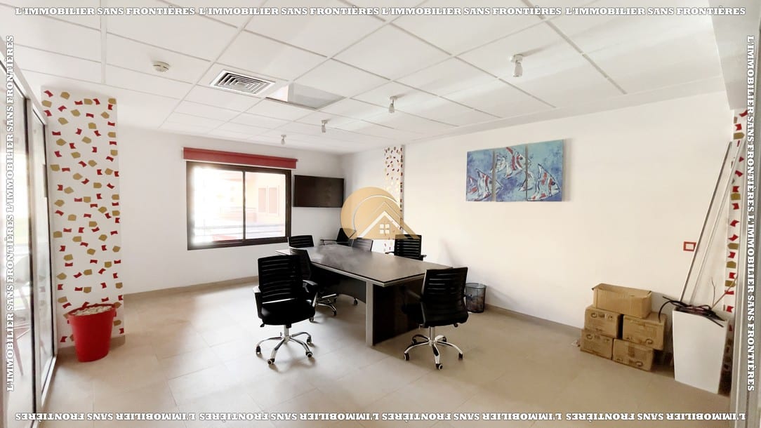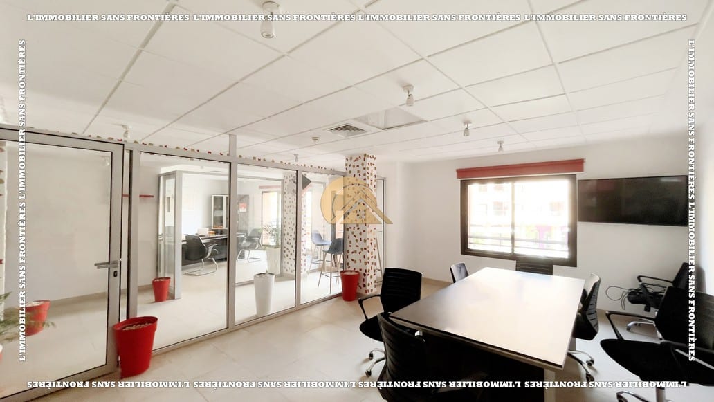 Real Estate Without Borders offers for rent this 128 m² office on the 1st floor on Bd Abdelkrim El khattabi in Marrakech. It includes work areas, a meeting room and 2 bathrooms. A furnished rental option is mentioned at 20,000 DHS.